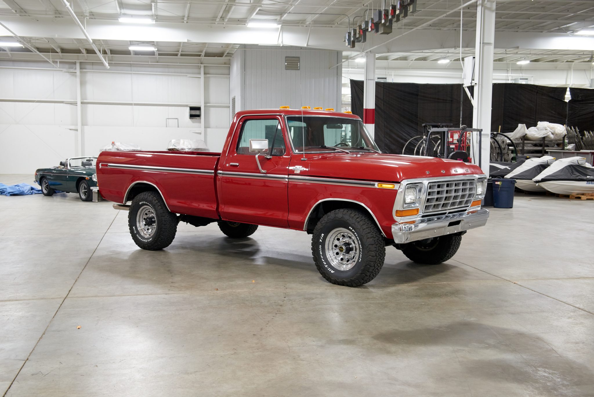 Chrome wheels show pitting and corrosion and wear BFGoodrich All-Terrain T/A tires said to have been installed under current ownership. The truck is equipped with power steering and front disc brakes. The seller notes that the rear springs were de-leafed, the rear brakes and lines were replaced, and Warn locking front hubs were fitted.