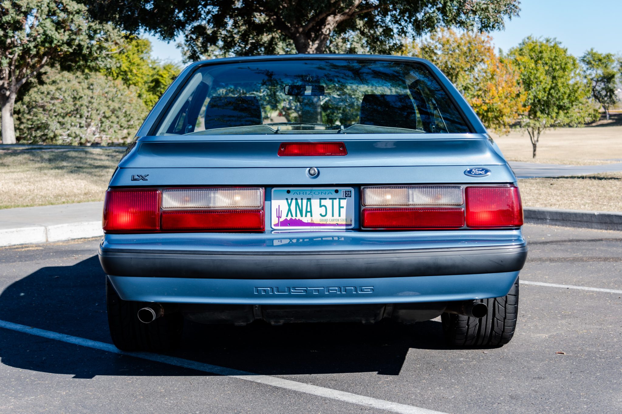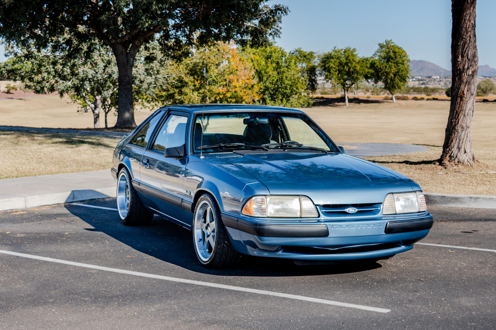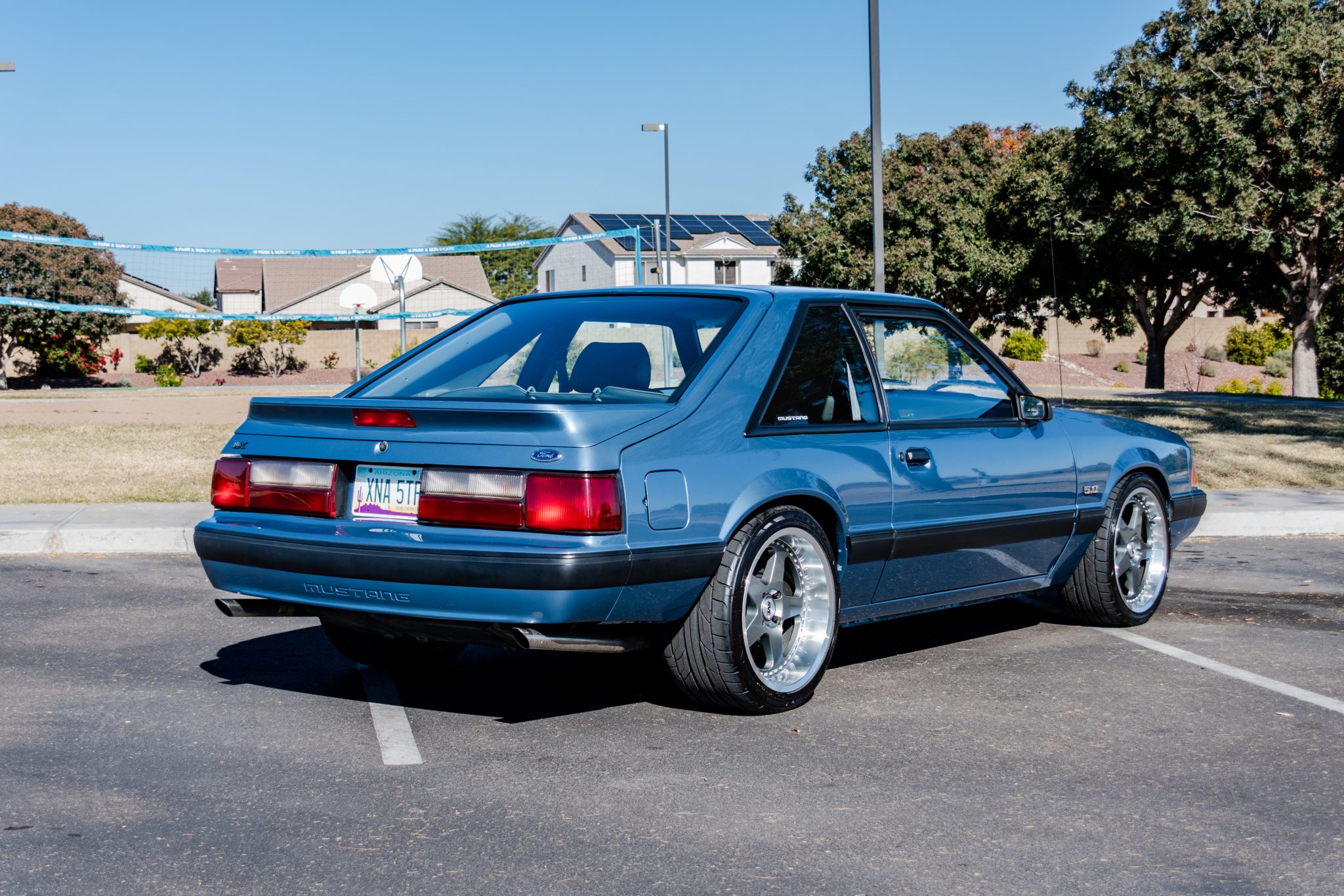Aftermarket 18″ SVE Saleen SC-style wheels are mounted with 255/35 front and 275/35 rear Nitto NT555 tires. Standard equipment included a Handling Suspension Package featuring variable-rate springs and a Quadra-Shock rear setup, and aftermarket adjustable camber plates have been fitted. Braking is handled by power-assisted front discs and rear drums.