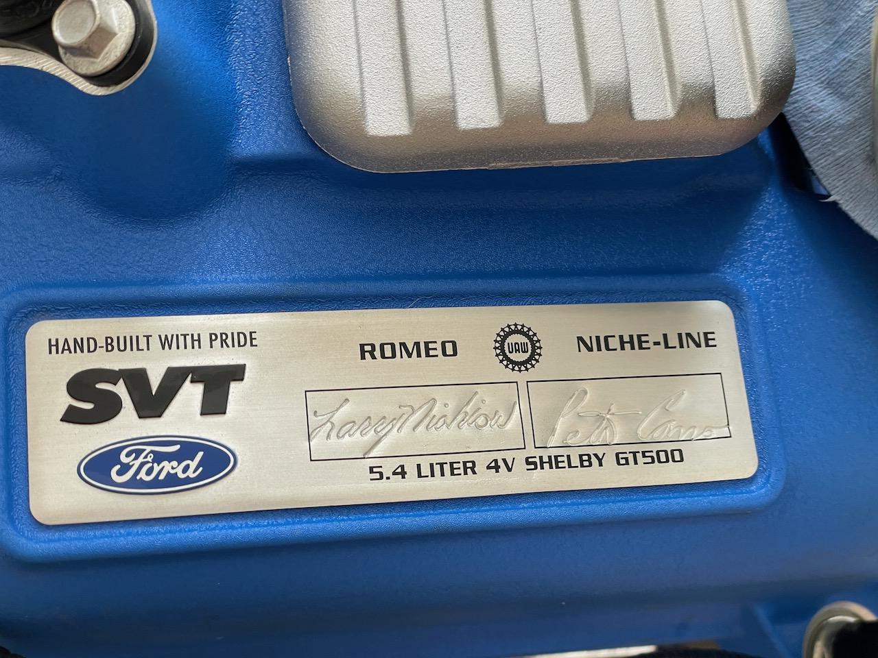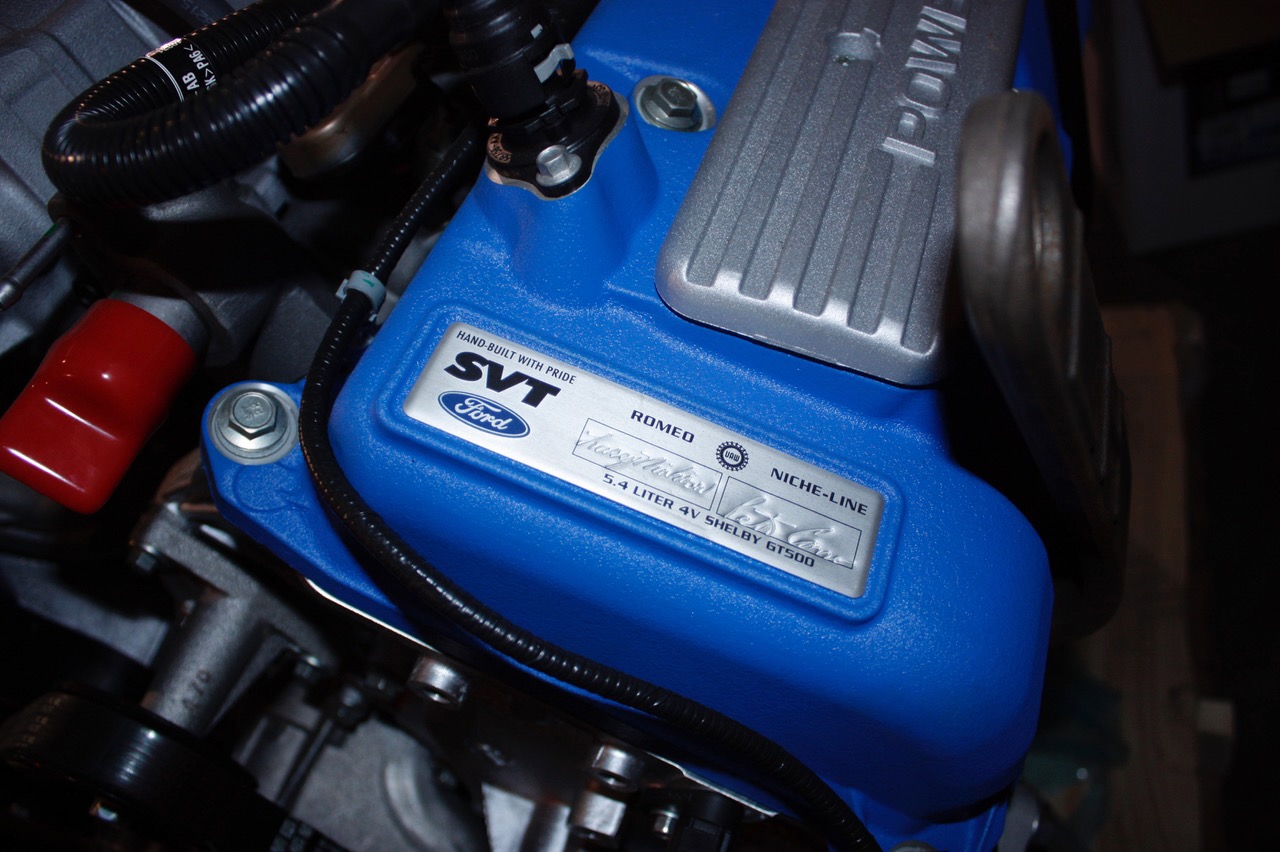 The engine was assembled at the Ford Romeo Niche-Line engine plant in Michigan, and a signed build plate is affixed to the blue-finished valve cover. Retained components include a supercharger, throttle body, alternator, flywheel, air conditioning compressor, and accessory belt.