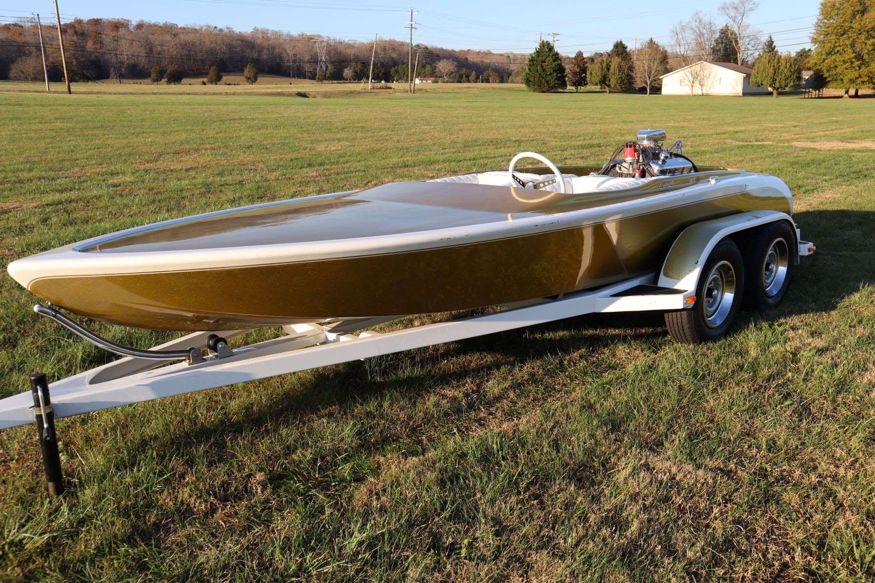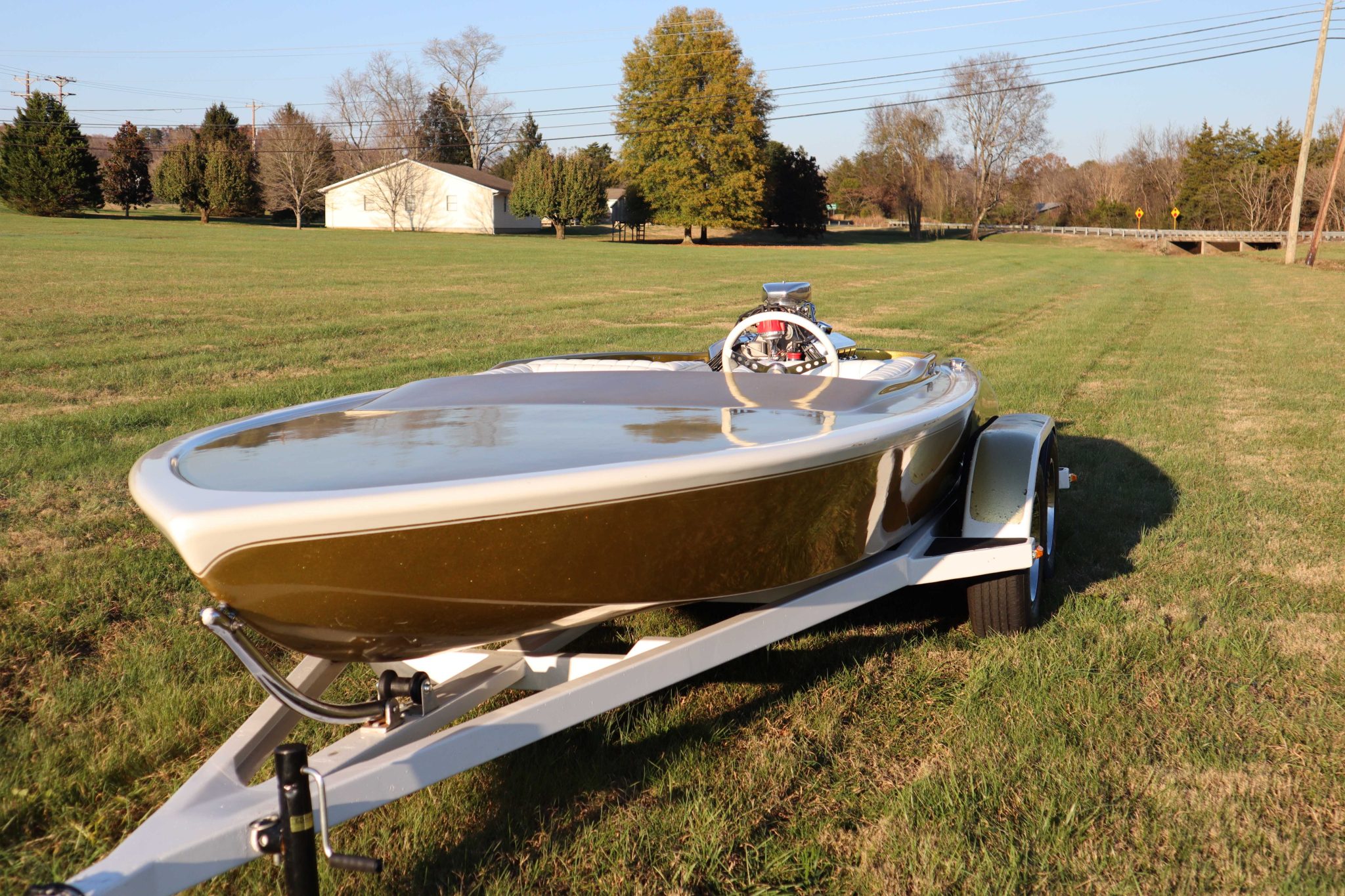 Features include adjustable MECO cavitation plates, dual skegs mounted under the hull, a waterski pylon positioned behind the engine, and gunwhale-mounted fuel filler caps. Rayson-Craft badges are riveted to each side of the cockpit.