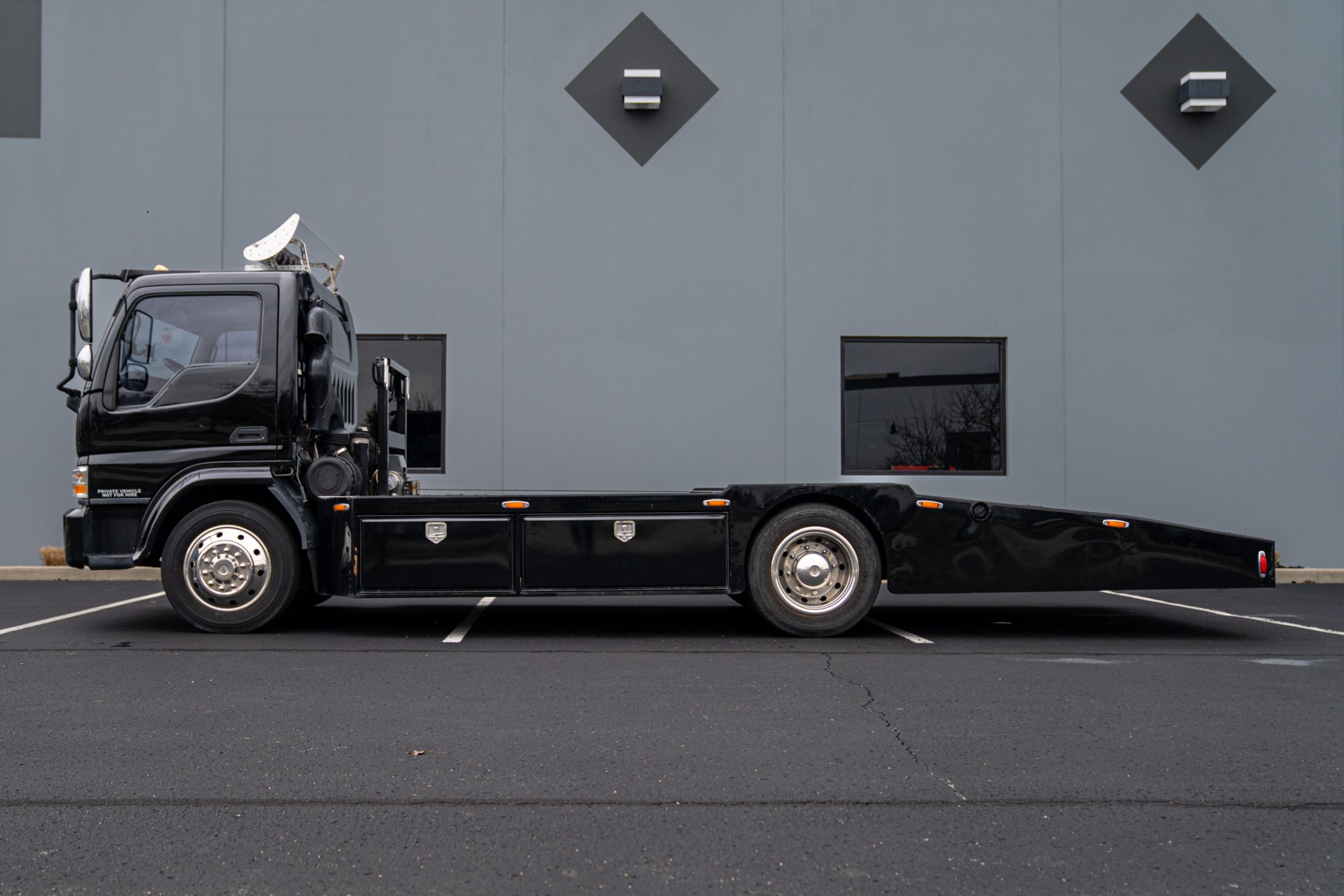 The ramp bed features a rear-facing winch near the cab, LED lighting, tie downs, and retractable ramps. The driver side of the bed offers two lockable storage compartments, and another is located on the passenger side. Rust is present at the bed corners.