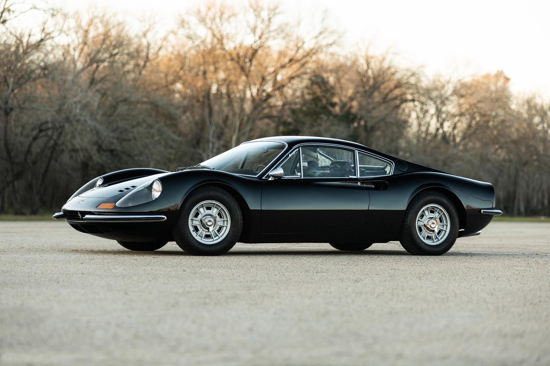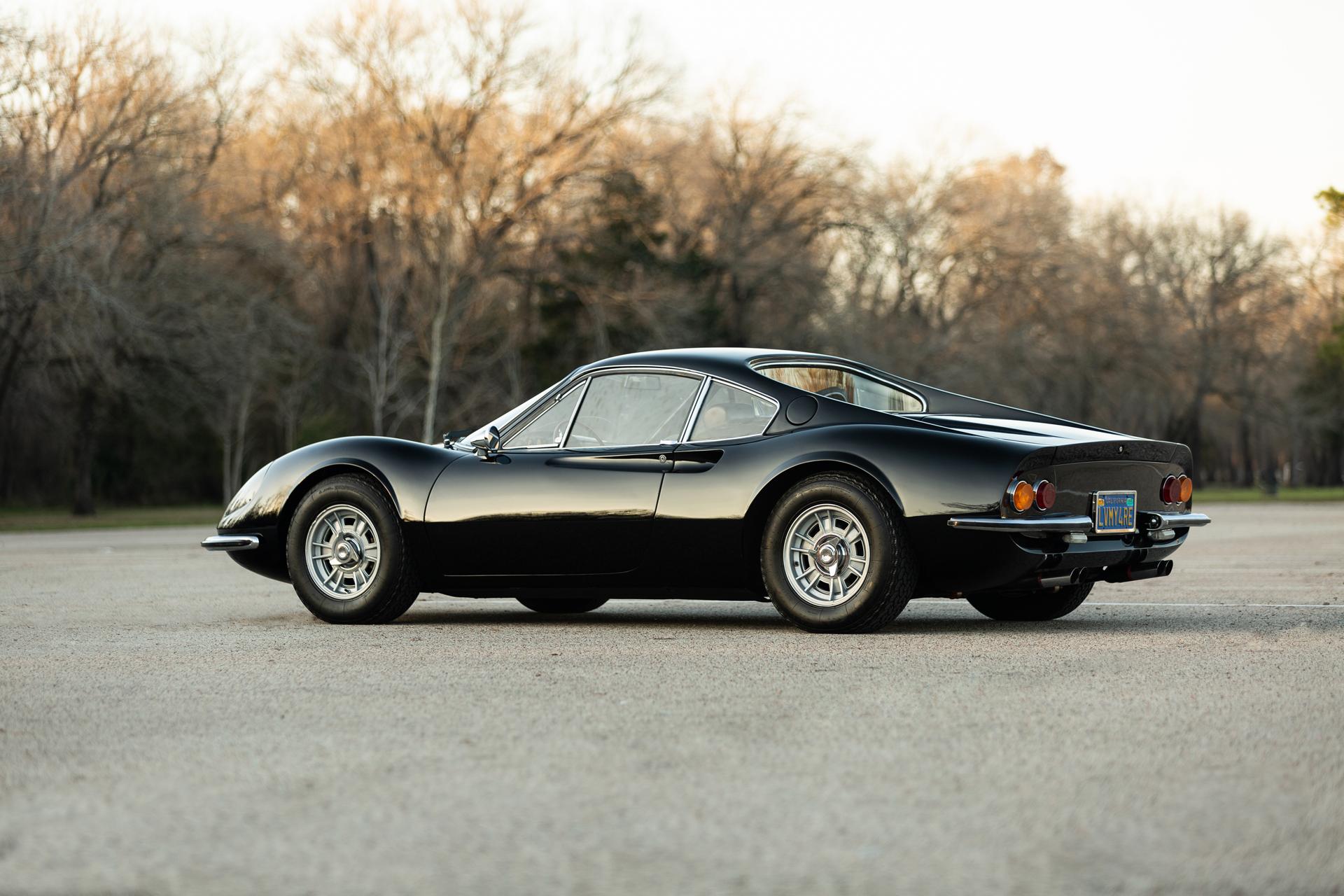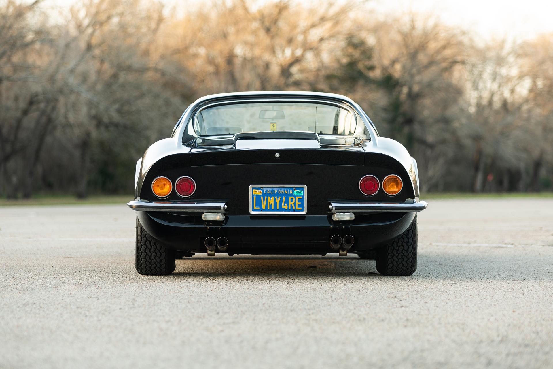 The Scaglietti-built bodywork on this example was delivered from the factory in Fly Yellow and underwent a color change to red in the 1970s before it was painted in its current black under previous ownership. Side marker lights were removed at the time of the repaint, and additional features include a prancing horse grille badge, headlights with plexiglass covers, and a quad-exit exhaust. Replacement door and body seals and moldings were installed by the selling dealer in 2022. Imperfections on the bumpers and body are detailed in the gallery.