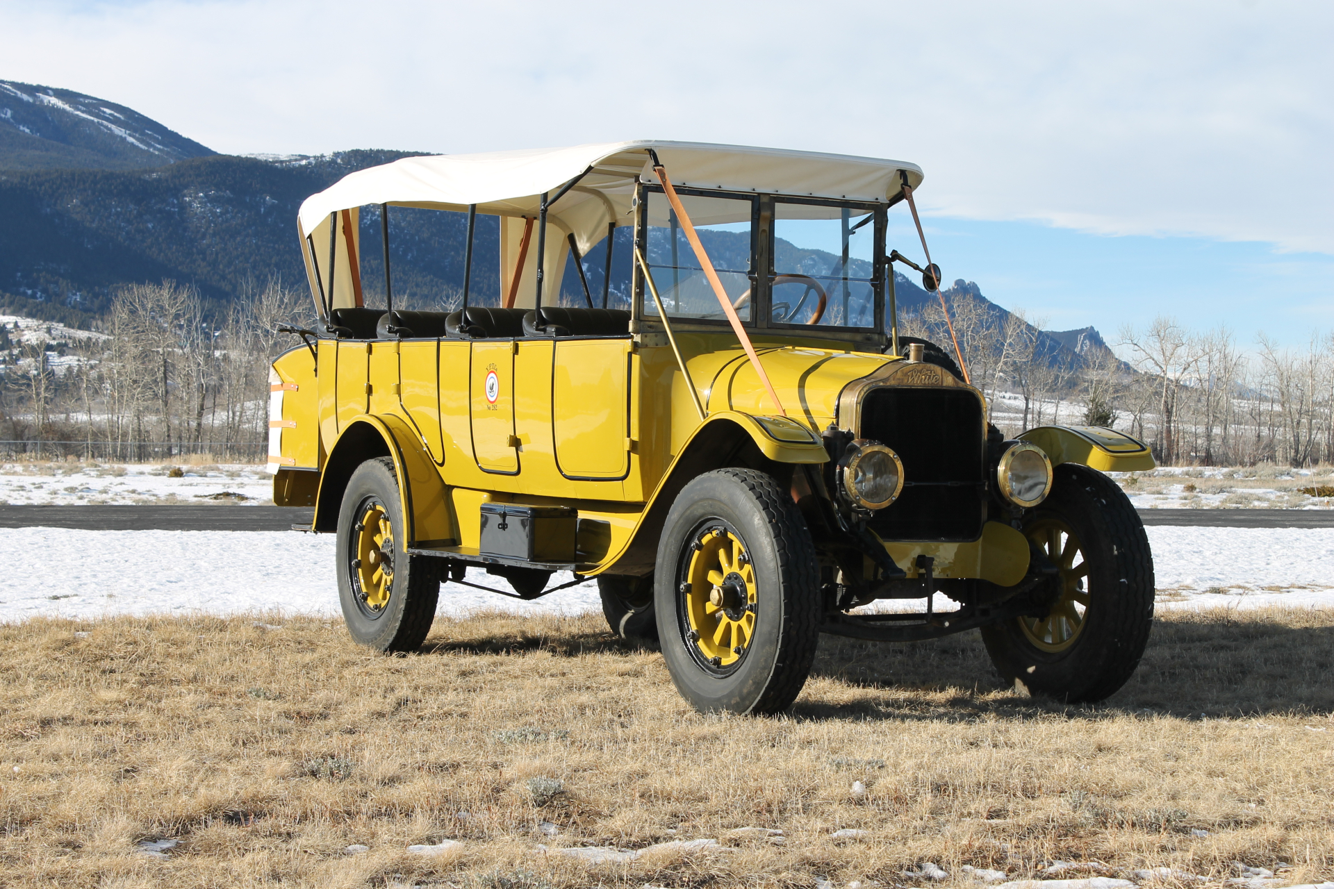 This example’s body was finished in primer prior to being purchased by the current owner, who subsequently commissioned a repaint in single-stage urethane replicating the YPTCo’s yellow livery with black molding and hand-painted pinstripes. Early Yellowstone buses were designed with four doors on the right side of the body, with sealed simulated doors on the left side to prevent passengers from deboarding into traffic. The white canvas top was installed in 2010 and is supported by removable stays and leather straps.