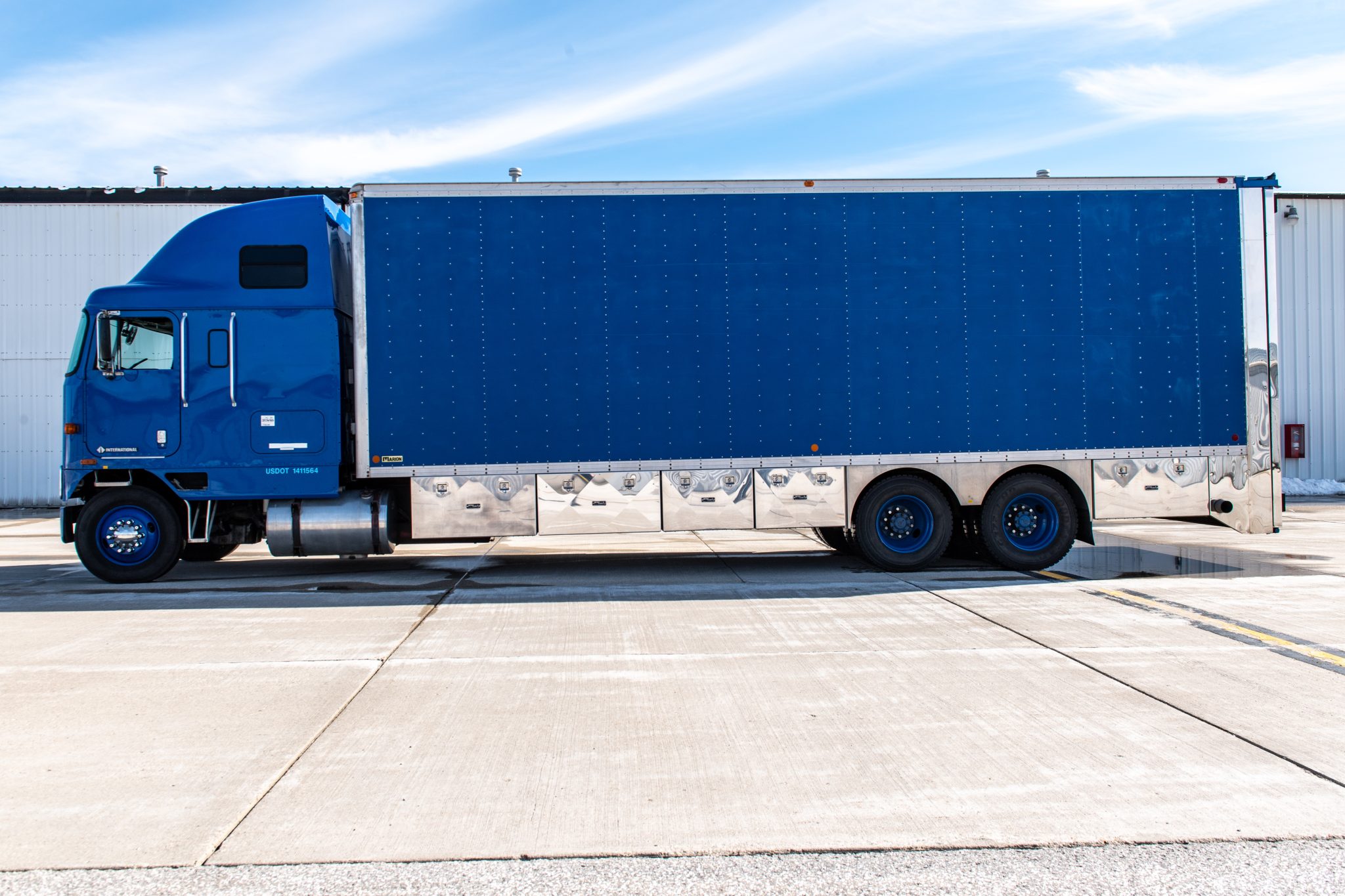 Blue 22.5″ steel wheels are wrapped in a mixed set of 295/75 tires. The truck is equipped with dual rear axles and a rear air suspension system.
