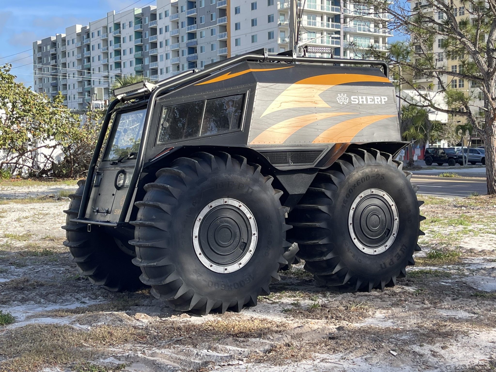 Silver-finished 25″ wheels are wrapped in 1600×600-25 WEPN low-pressure tires that feature paddle treads and provide buoyancy and propulsion on water. The setup provides two feet of ground clearance with the ability to climb or descend a 30-degree grade. The vehicle is equipped with a central tire inflation system as well as auxiliary fuel containers located in the center of each wheel.