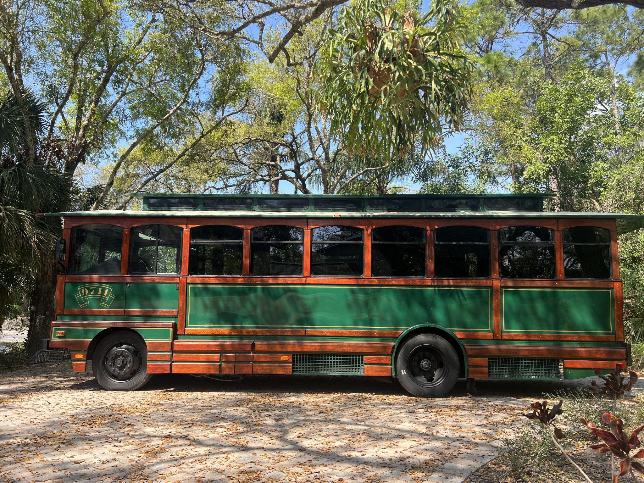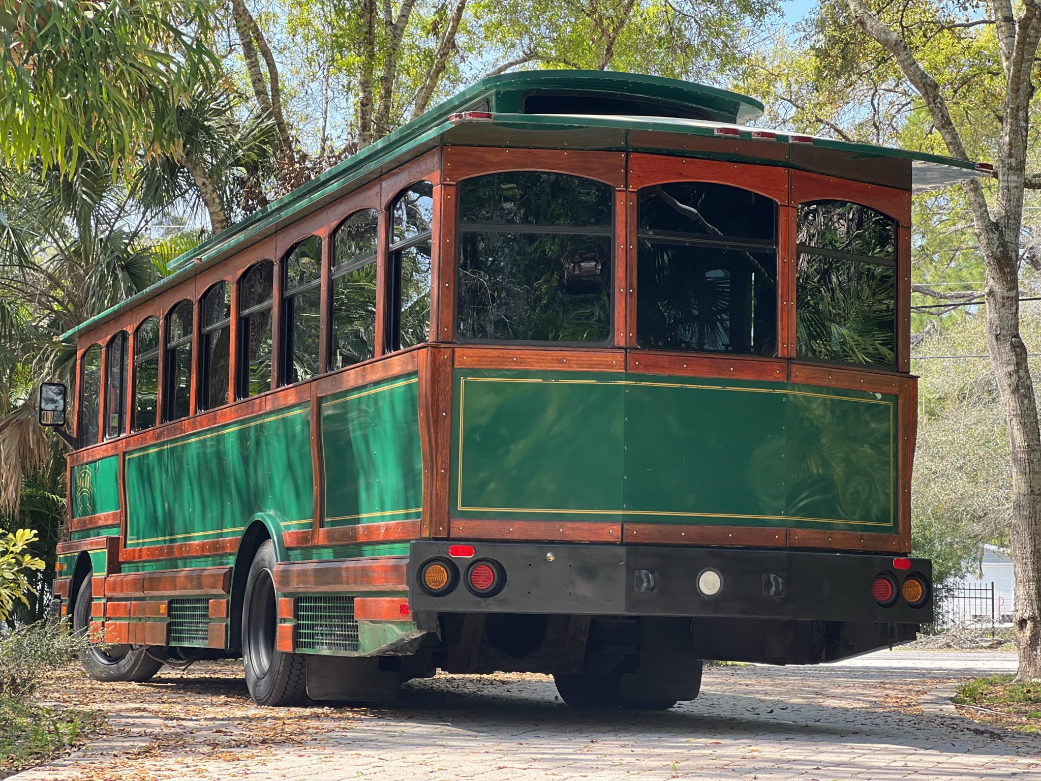 Black 22.5″ steel wheels are wrapped in a mixed set of 255/70 tires, and the seller states that the front tires show wear. The bus is equipped with a dually rear axle.