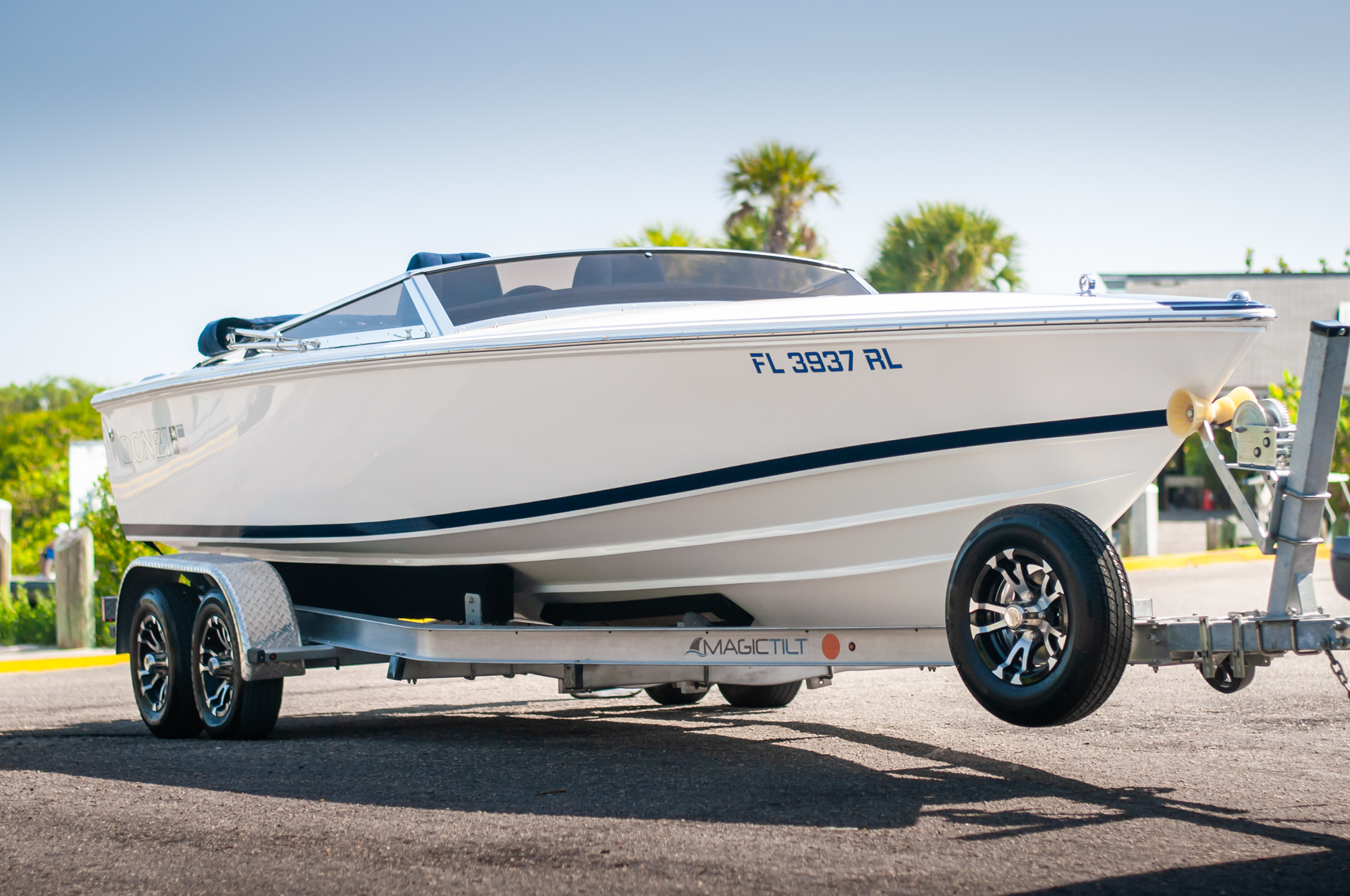 The body-color cockpit features custom-fabricated bucket seats and a rear bench upholstered in white vinyl and blue marine Alcantara. SeaDek marine flooring and blue LED lighting are installed, and additional appointments include Gaffrig Performance controls, Bocatech switches, Garmin navigation, storage compartments, carbon-fiber trim, and a Fusion marine stereo linked with JL Audio speakers and dual subwoofers.
