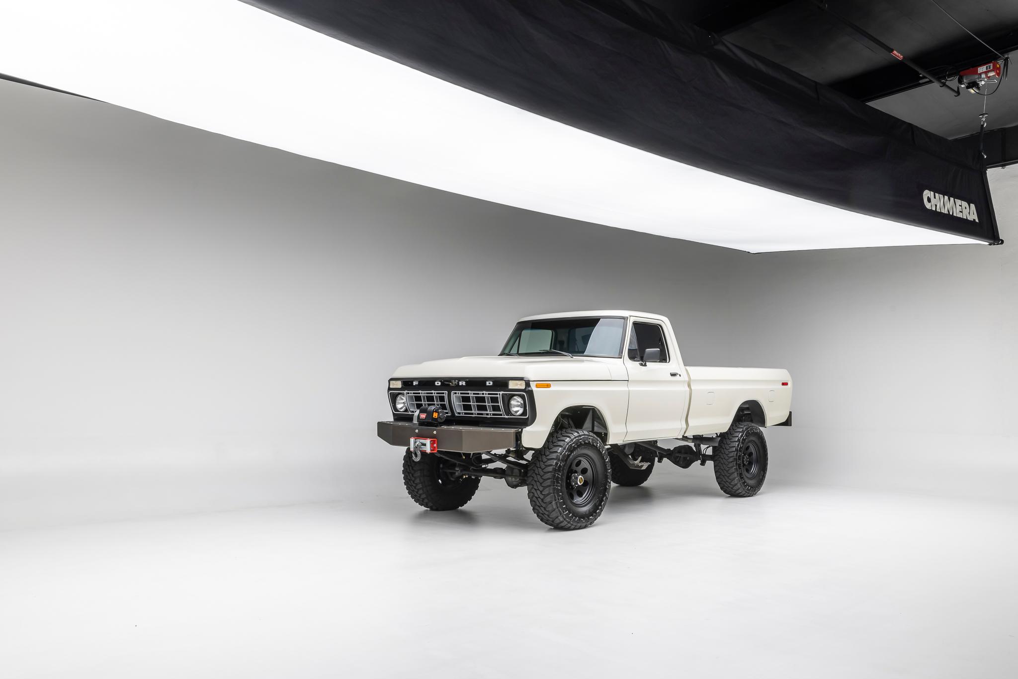 Black 18″ wheels are wrapped in 38×12.5″ Toyo Open Country M/T tires. Work completed as part of the refurbishment reportedly included installing power-assisted four-wheel disc brakes and a suspension lift with Fox shocks along with replacing the power steering box. The front axle is equipped with manually locking hubs.
