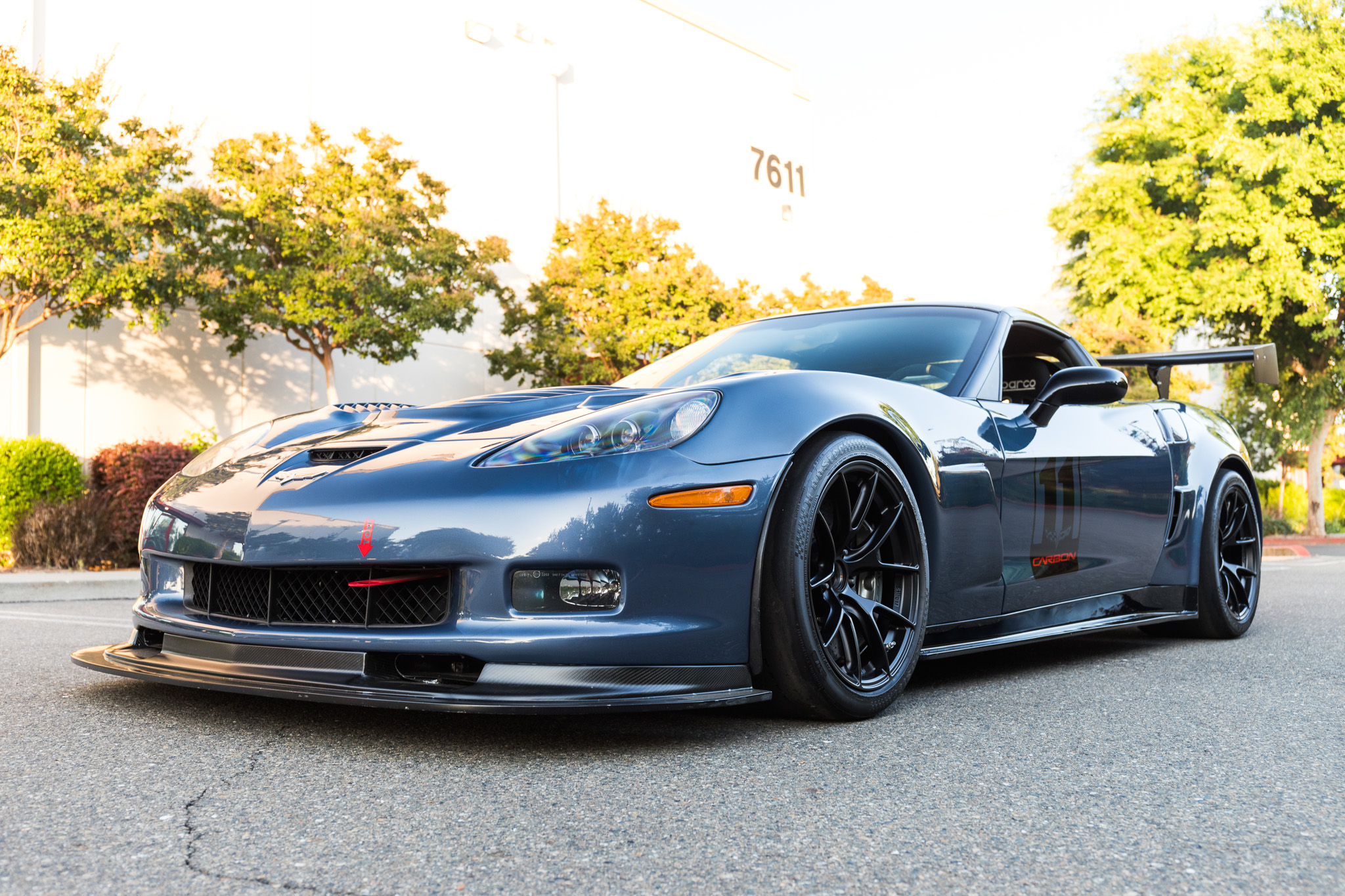 Forged aluminum 18″ Apex wheels are mounted with Hoosier R7 track tires measuring 295/30 up front and 335/30 out back. Suspension components include JRZ RS Pro coilovers with remote reservoirs, LG Motorsports billet aluminum drop spindles, mono ball control arm bushings, Baer tie rod ends, and LG sway bars. Stopping power is provided by four-wheel Brembo carbon-ceramic disc brakes with multi-piston Corvette-branded calipers and stainless steel brake lines.
