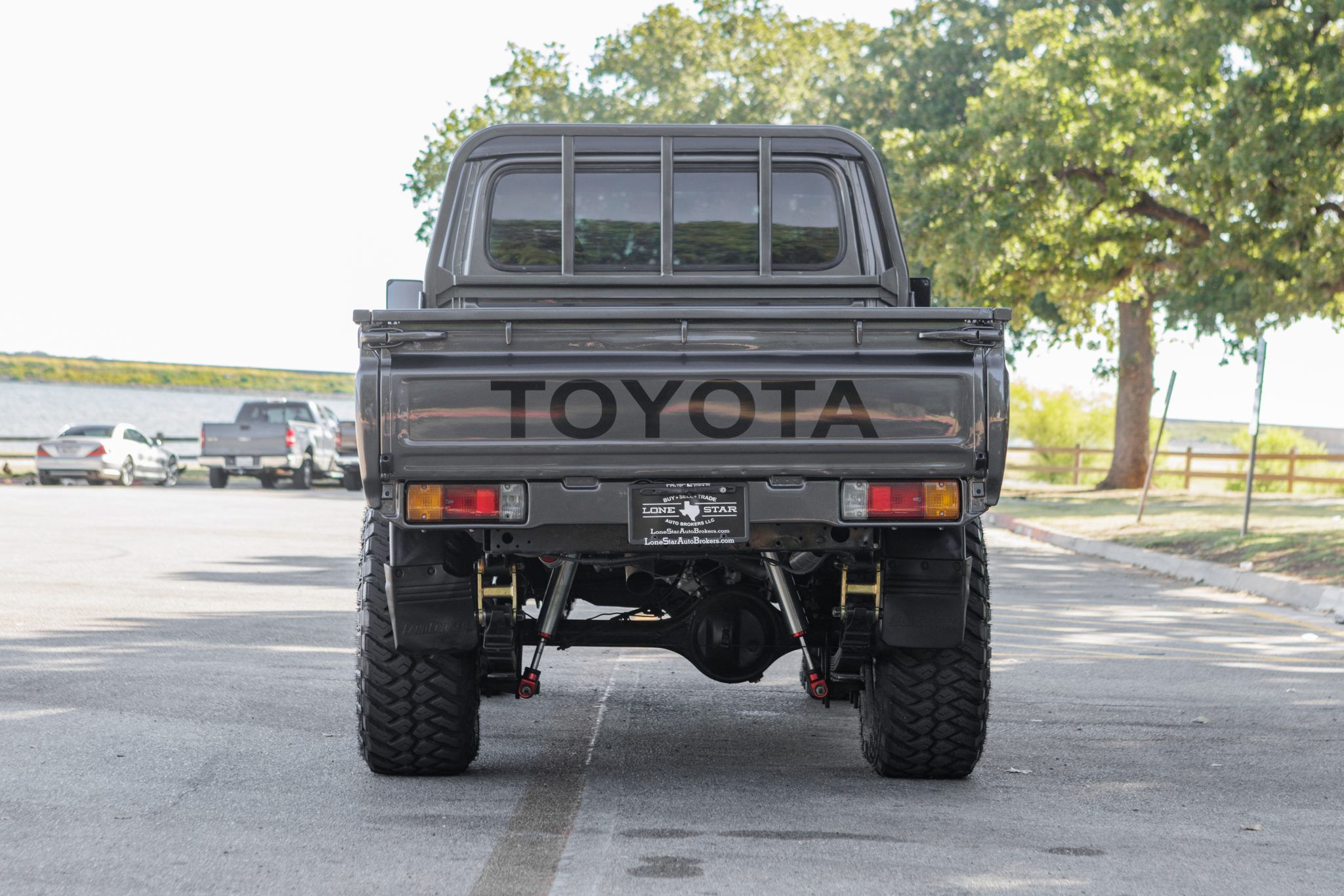 Black-finished 17″ Fuel wheels are mounted with 315/70 Maxxis Razr MT tires that show 2014, 2017, and 2020 date codes. Braking is handled by four-wheel drums. The truck features manually lockable front hubs, and the suspension was reportedly modified by the selling dealer with a steering stabilizer, front shock tower brace, aftermarket spring hangers, front coilovers, and Profender shocks with remote reservoirs.