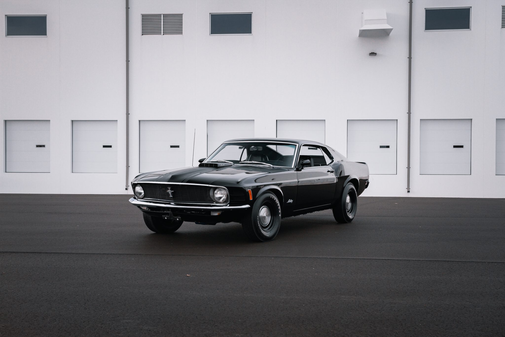 Color-matched 14″ steel wheels wear polished Ford Motor Company–branded hubcaps and are mounted with Goodyear Polyglas F70-14 white-letter tires. A matching spare wheel and tire are located inside the trunk, and photos showing the tire serial numbers and date codes are provided in the gallery. Braking is handled by power-assisted front discs and rear drums.