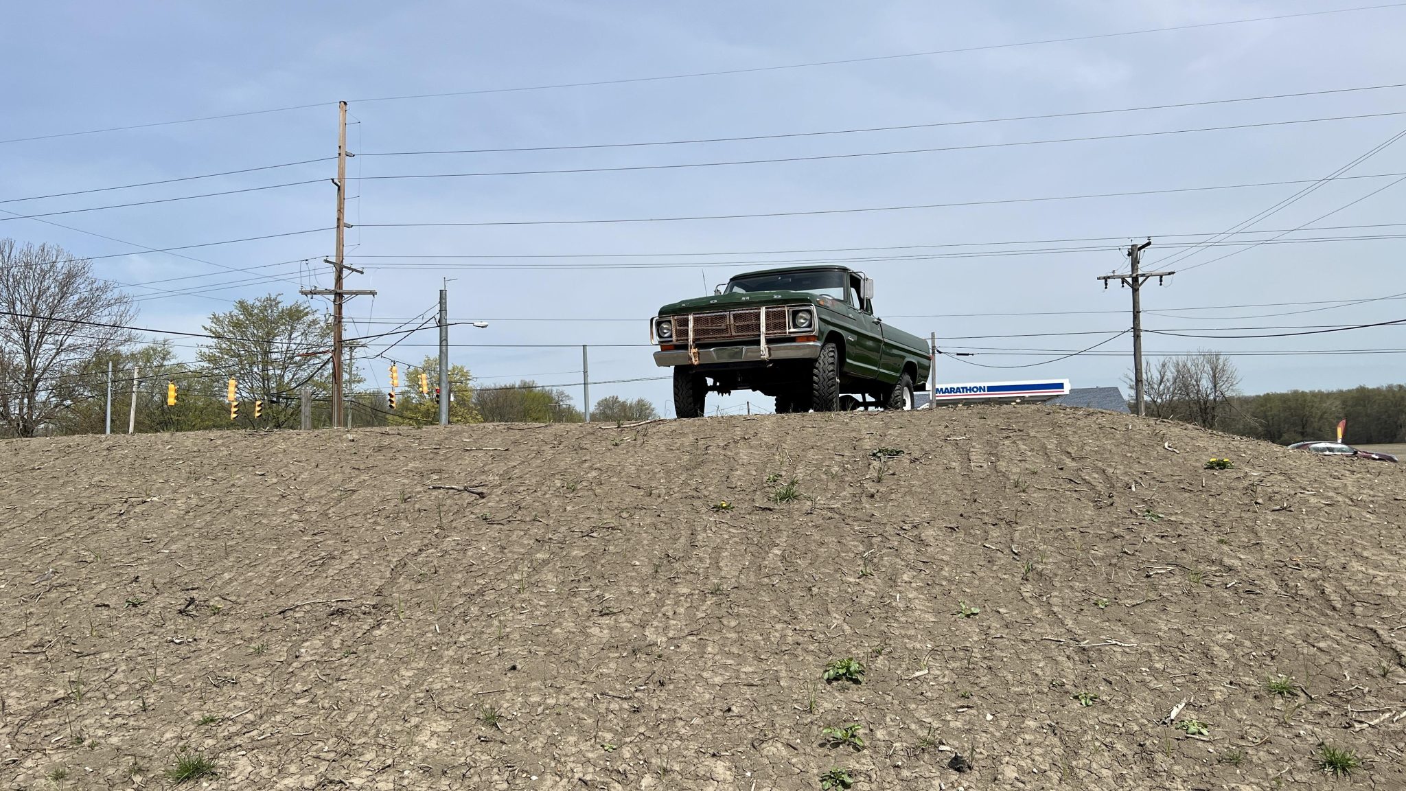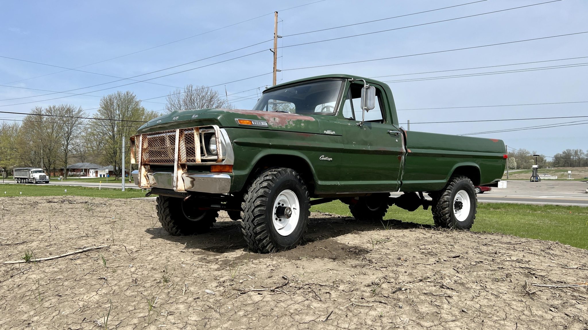 White-painted 16” steel wheels are mounted with 9.00-16 Power King Premium Traction tires, and a matching spare is stowed in the pickup bed. The truck is equipped with manually locking front hubs, Old Man Emu shocks, and a Rancho steering stabilizer.