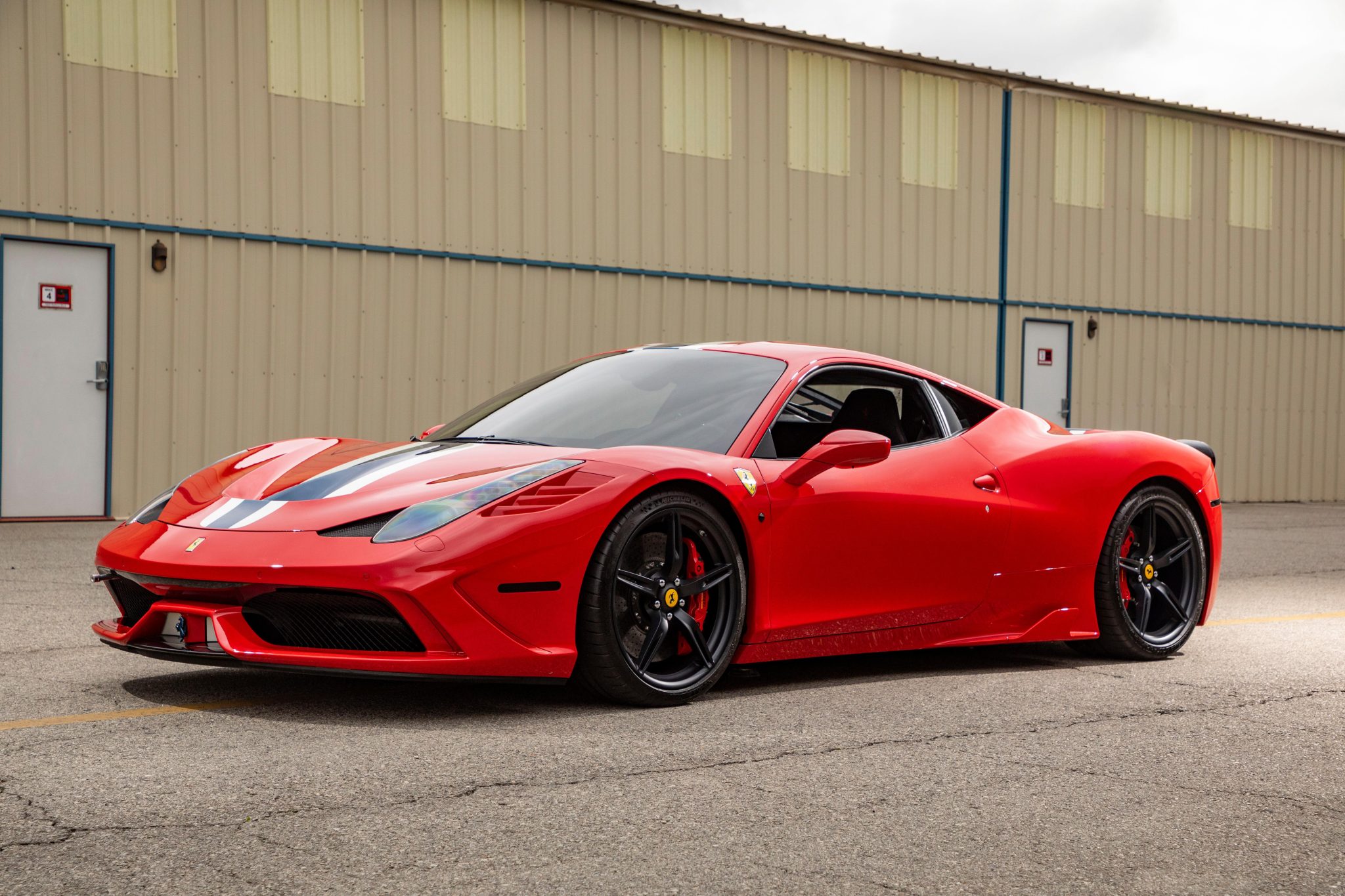 This example is finished in Corsa Red with optional North American Racing Team (NART) racing stripes and features adaptive xenon headlights, fog lights, Scuderia Ferrari fender shields, a parking camera, front and rear parking sensors, tinted glass, and LED taillights with smoked lenses. Clear paint-protection film has been applied to the bodywork, and the rear diffuser was repaired and repainted earlier this year. The seller notes some rock chips on the body along with scrapes inside one of the rear wheel wells