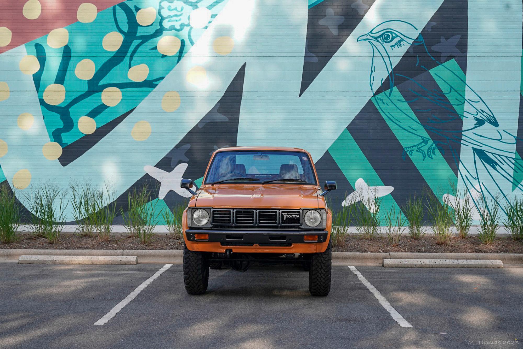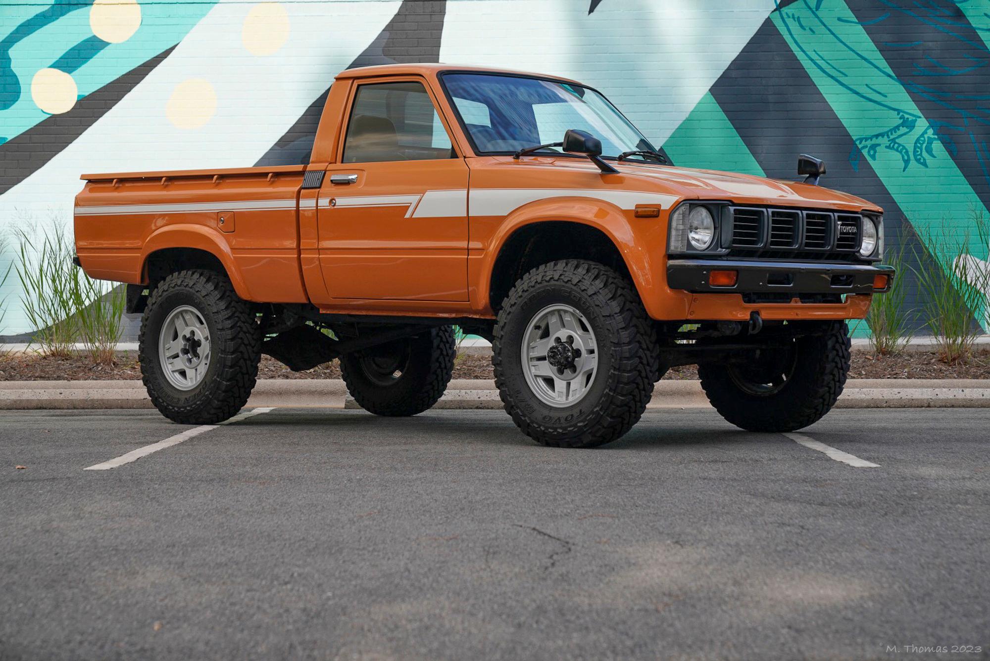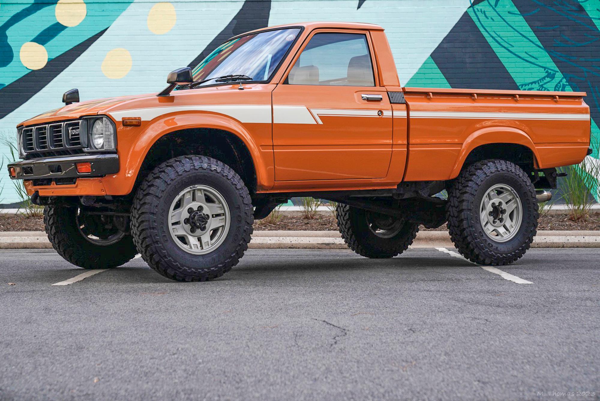 Alloy 16″ wheels are mounted with 235/85 Toyo Open Country M/T tires. The truck is equipped with manually locking front hubs, and stopping power is provided by front disc and rear drum brakes.