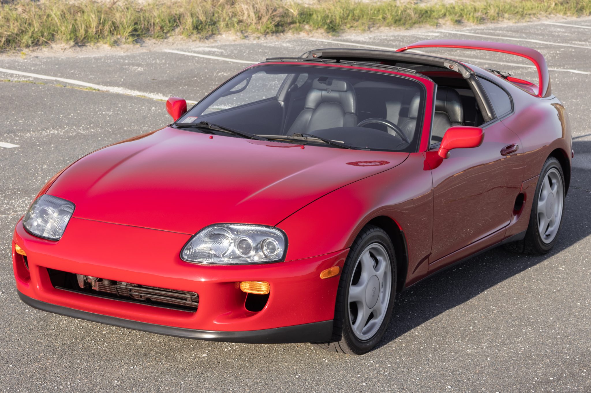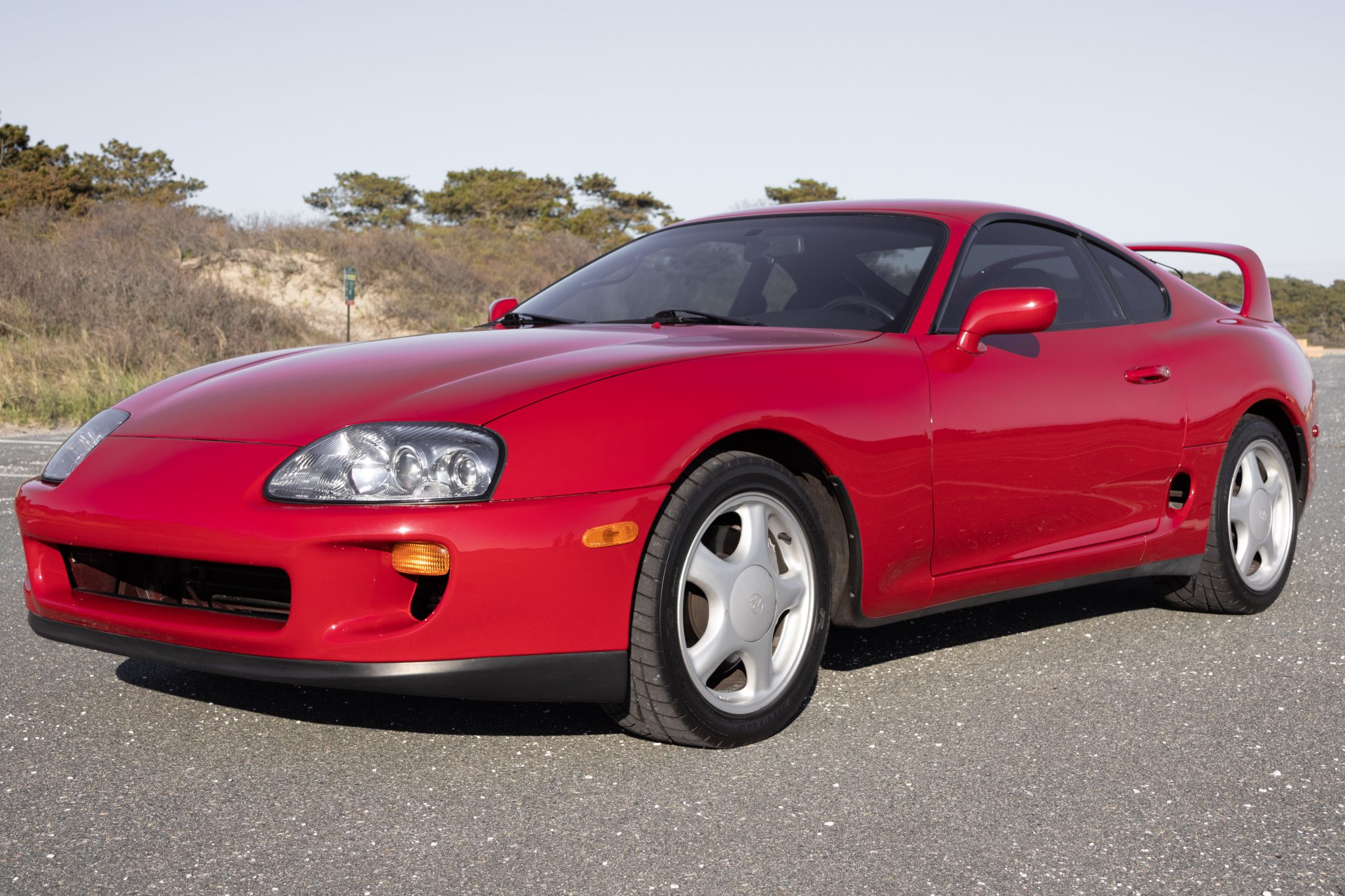 Silver-finished 17″ five-spoke wheels wear 235/45 front and 255/40 rear Toyo Proxes R1R tires, which were mounted in 2023. The car rides on a four-wheel double-wishbone suspension system and features speed-sensing progressive power rack-and-pinion steering and electronic traction control. Anti-lock braking is provided by ventilated discs at each corner. Replacement clutch hydraulic cylinders were fitted in February 2023, per the seller. Tire tread-depth readings are provided in the gallery below.