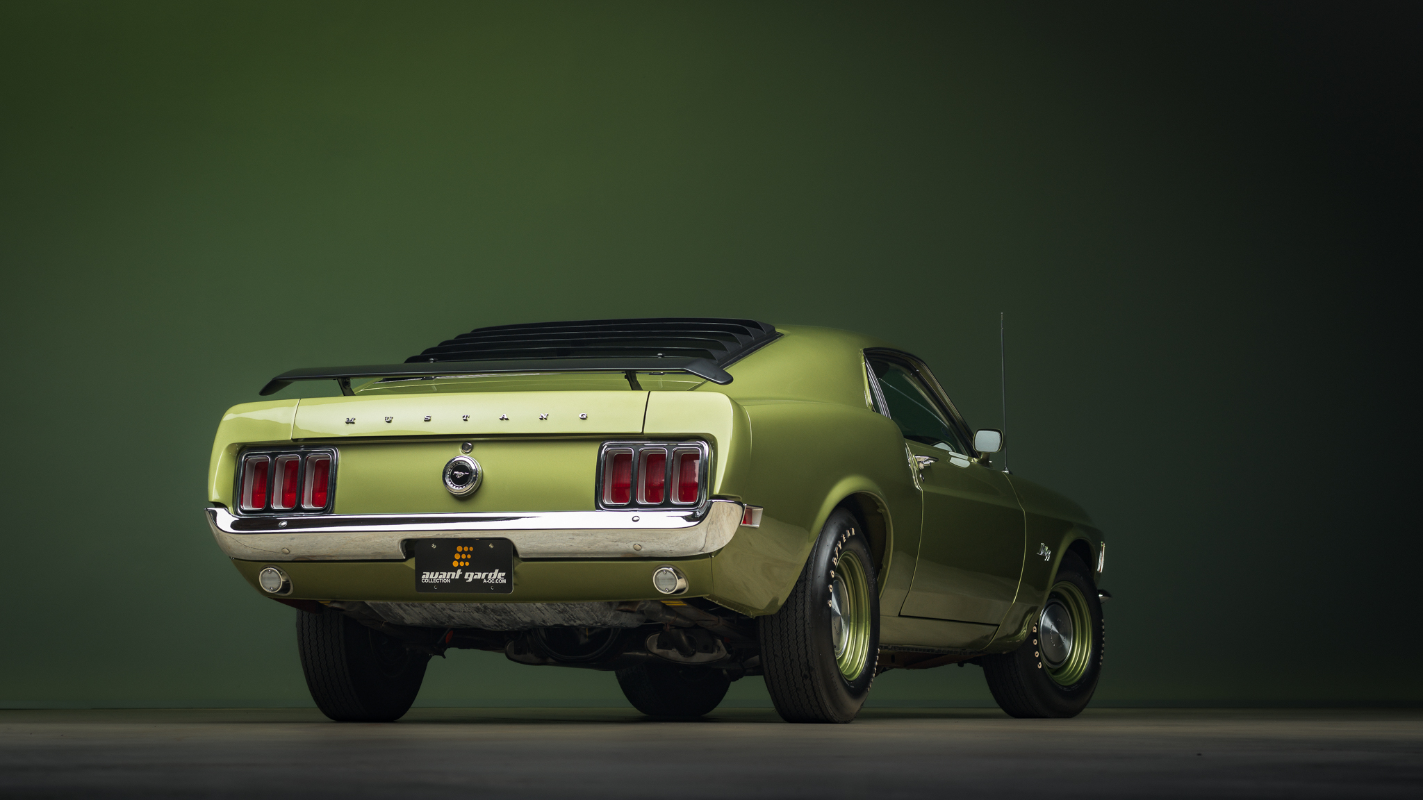 Body-color 14″ steel wheels are mounted with F70-14 Goodyear Polyglas white-letter tires. A matching spare is mounted in the trunk. The car is equipped with a manual steering box, a front sway bar, and unassisted drum brakes at all four corners.
