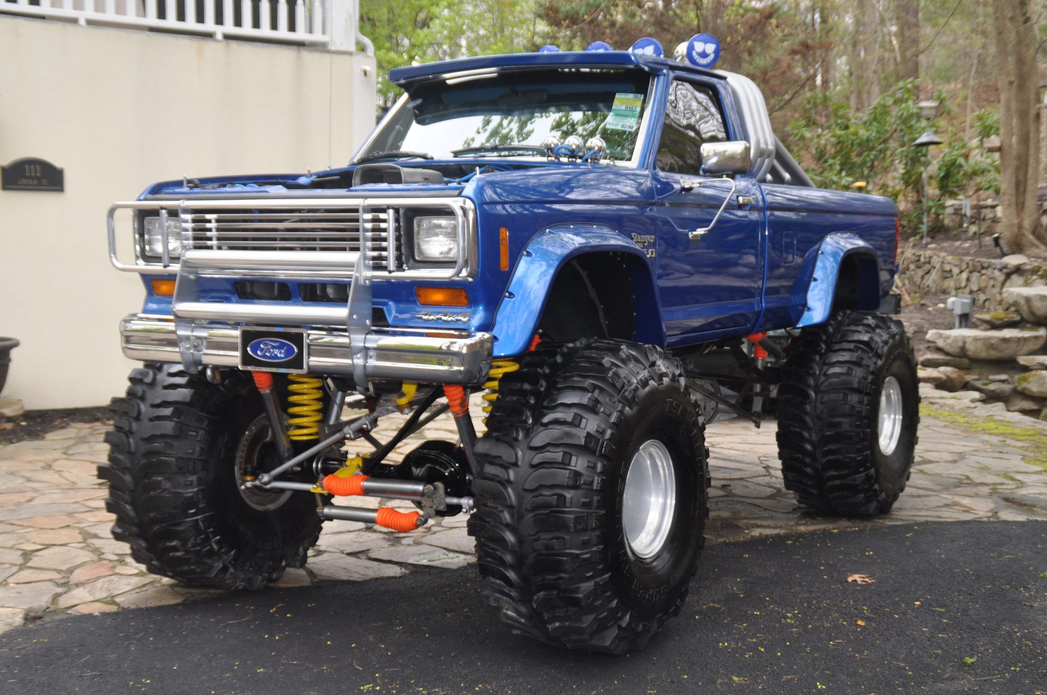 The 15″ alloy wheels are mounted with 44×19.50″ Super Swamper TSL Bogger tires. The truck has a suspension lift and is equipped with a remote-controlled hydraulic rear steering system, Rough Country shocks, front coil springs, limit straps, rear bump stops, and L&L Products traction bars.