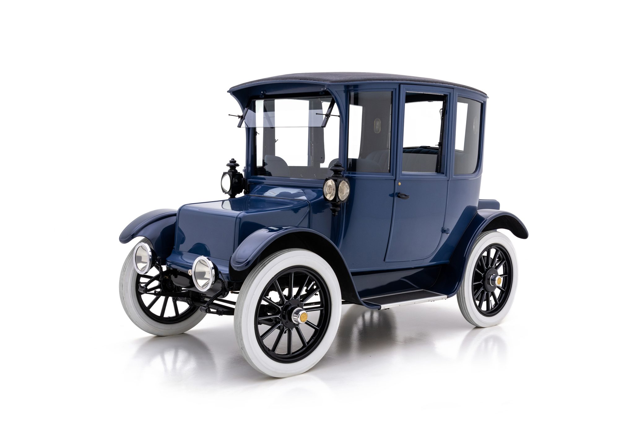 Riding on a 92” wheelbase, this example’s aluminum Brougham coachwork wears an older repaint in two-tone blue. Areas of paint blistering are noted ahead of the left-side door, on the right rear and left front of the body, and on the front battery compartment cover. Features include rear-hinged doors, curved side windows, a pop-out upper windshield panel, a textured fabric roof, running boards, nickel-rimmed headlights, and twin cowl lamps. A scuff is present on the roof covering.