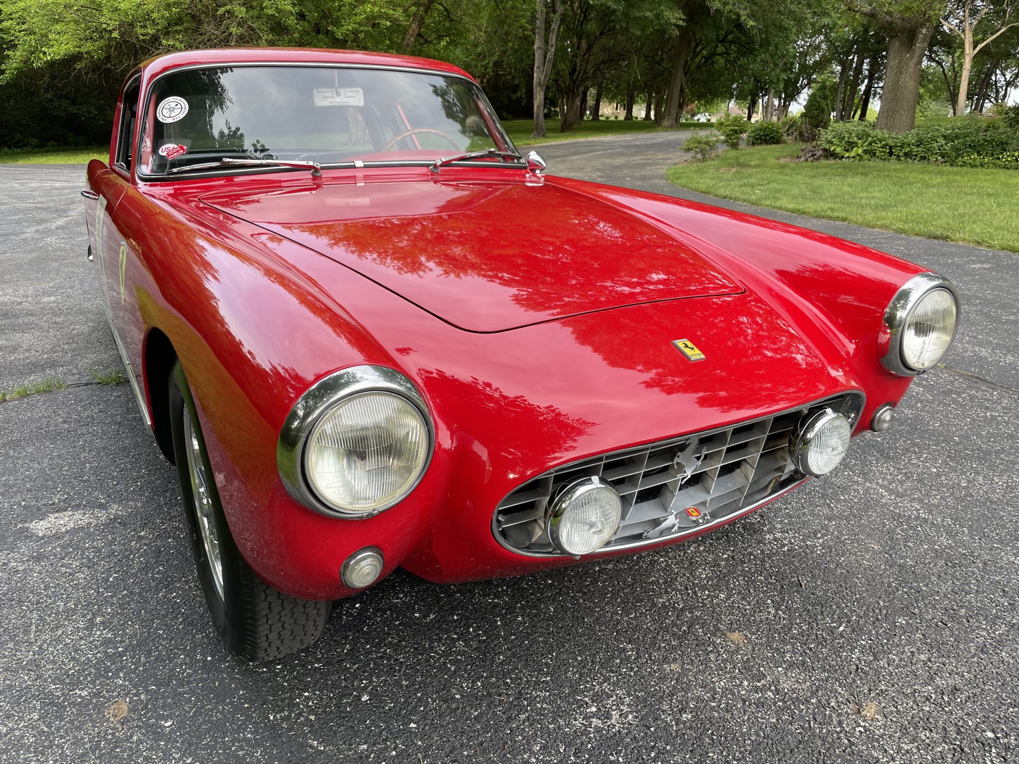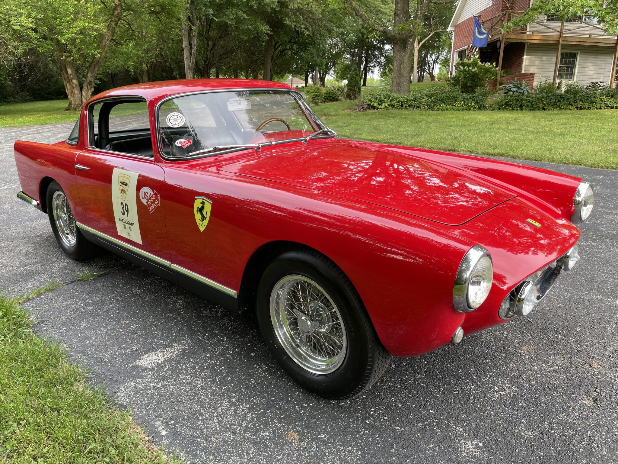 This high-roof example was repainted in red with dark gray rockers prior to current ownership, and areas of crazing and chipping on the frontal surfaces are shown up close in the photo gallery below. Cracks are present in the windshield, and a replacement windshield housed in a crate is included in the sale. Features include grille-mounted Marchal fog lamps, a wraparound rear window, tail fins, a driver-side Talbot mirror, Scuderia Ferrari shield decals, and quad Megs exhaust outlets. Graphics from the California Mille and Louis Vuitton Classic China Run remain affixed to the doors.