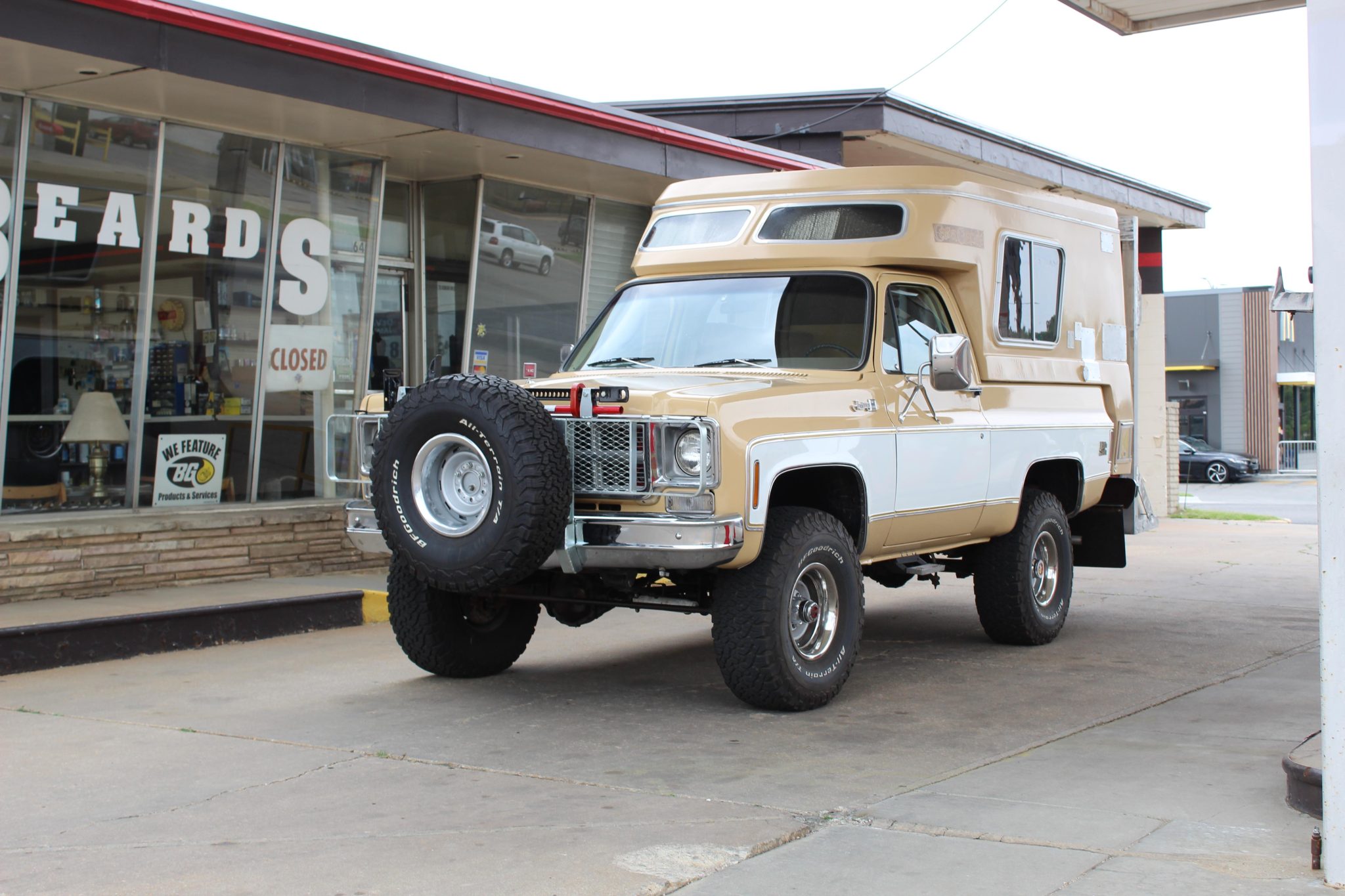 Silver 15″ Rally wheels wear chrome trim rings and are mounted with 35×12.5″ BFGoodrich All-Terrain T/A KO2 tires that were installed under current ownership. A matching spare is mounted to the front brush guard along with a high-lift jack. The truck is equipped with power steering, power-assisted front disc brakes, and manually locking front hubs. Work completed under current ownership reportedly included installing a 6″ suspension lift and replacing the ball joints, control arms, suspension bushings, and steering box.
