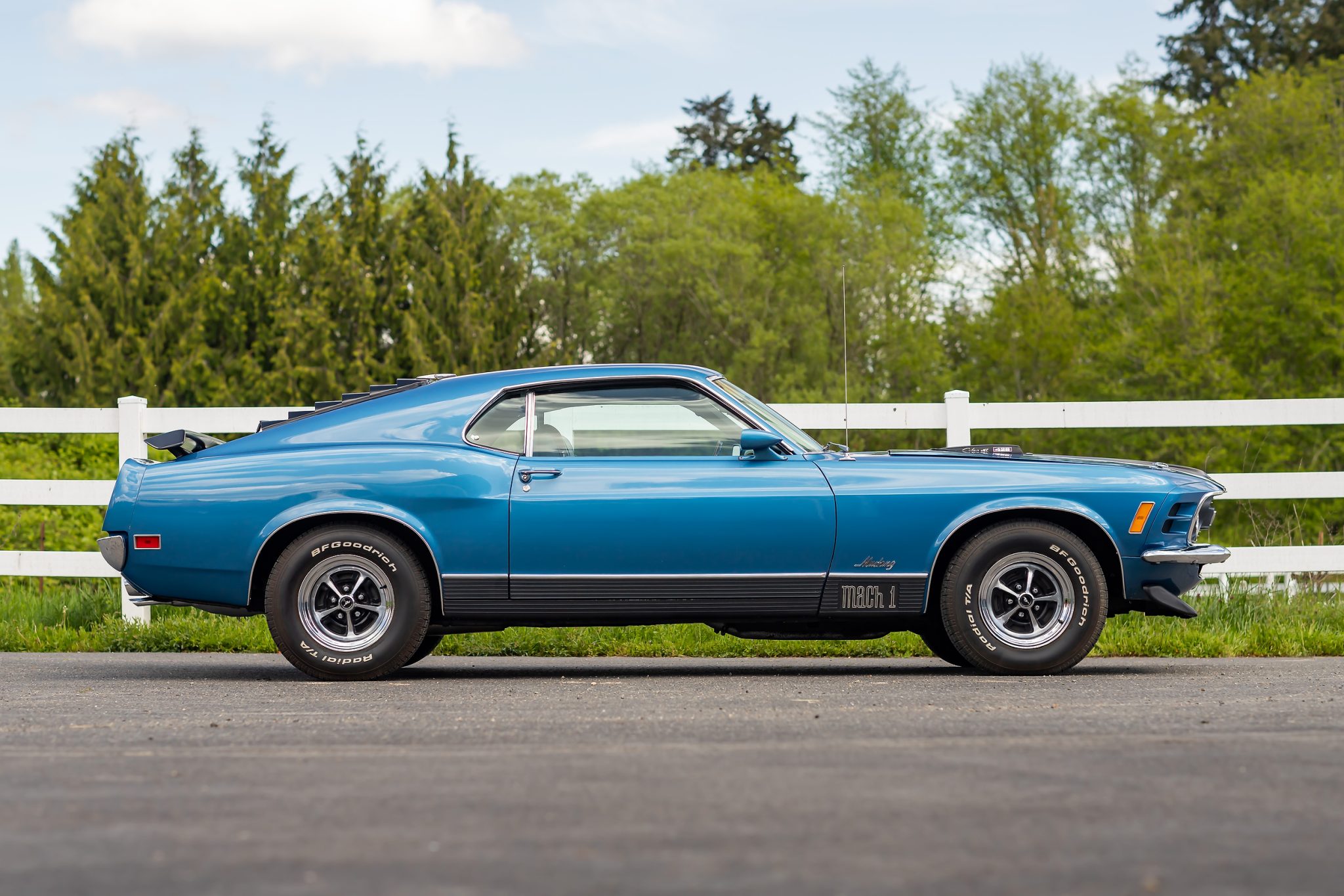 Magnum 500-style 14″ wheels are mounted with 225/70 BFGoodrich Radial T/A tires, while a full-size spare is stored in the trunk compartment. The car is equipped with a competition suspension, and stopping power is provided by four-wheel drum brakes.