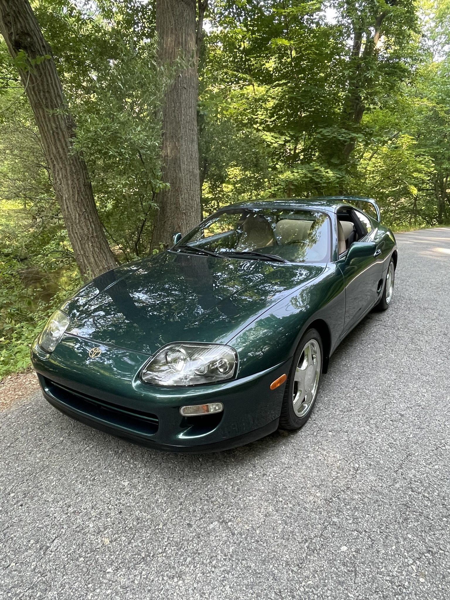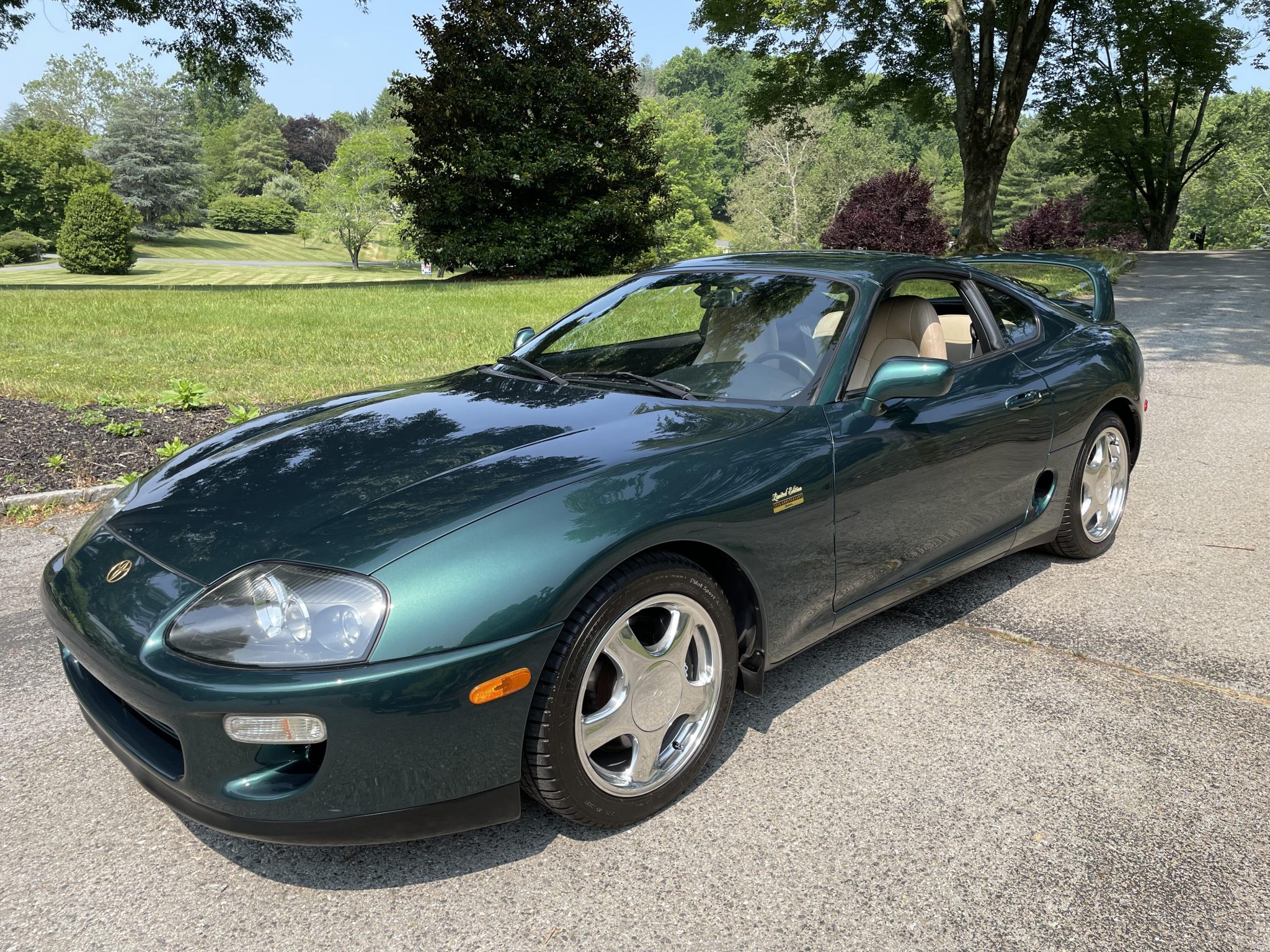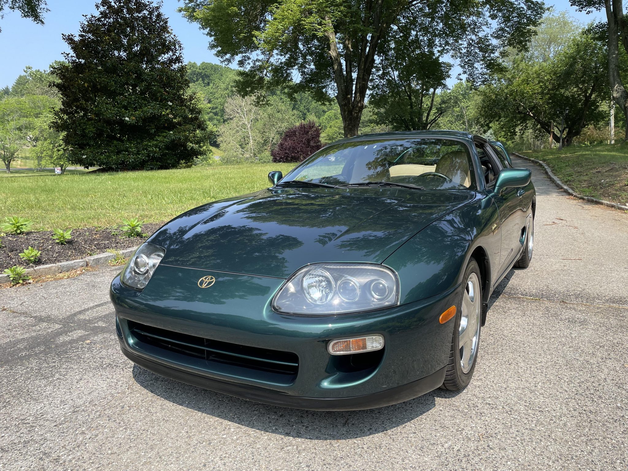 Chrome 17″ five-spoke wheels are mounted with 235/45 front and 255/40 rear Michelin Pilot Sport A/S 3+ tires. The car rides on a four-wheel double-wishbone suspension system and features speed-sensing progressive power rack-and-pinion steering and electronic traction control. Anti-lock braking is provided by Supra-logo calipers and ventilated discs at each corner. The seller states the brake master cylinder was replaced in 2021.