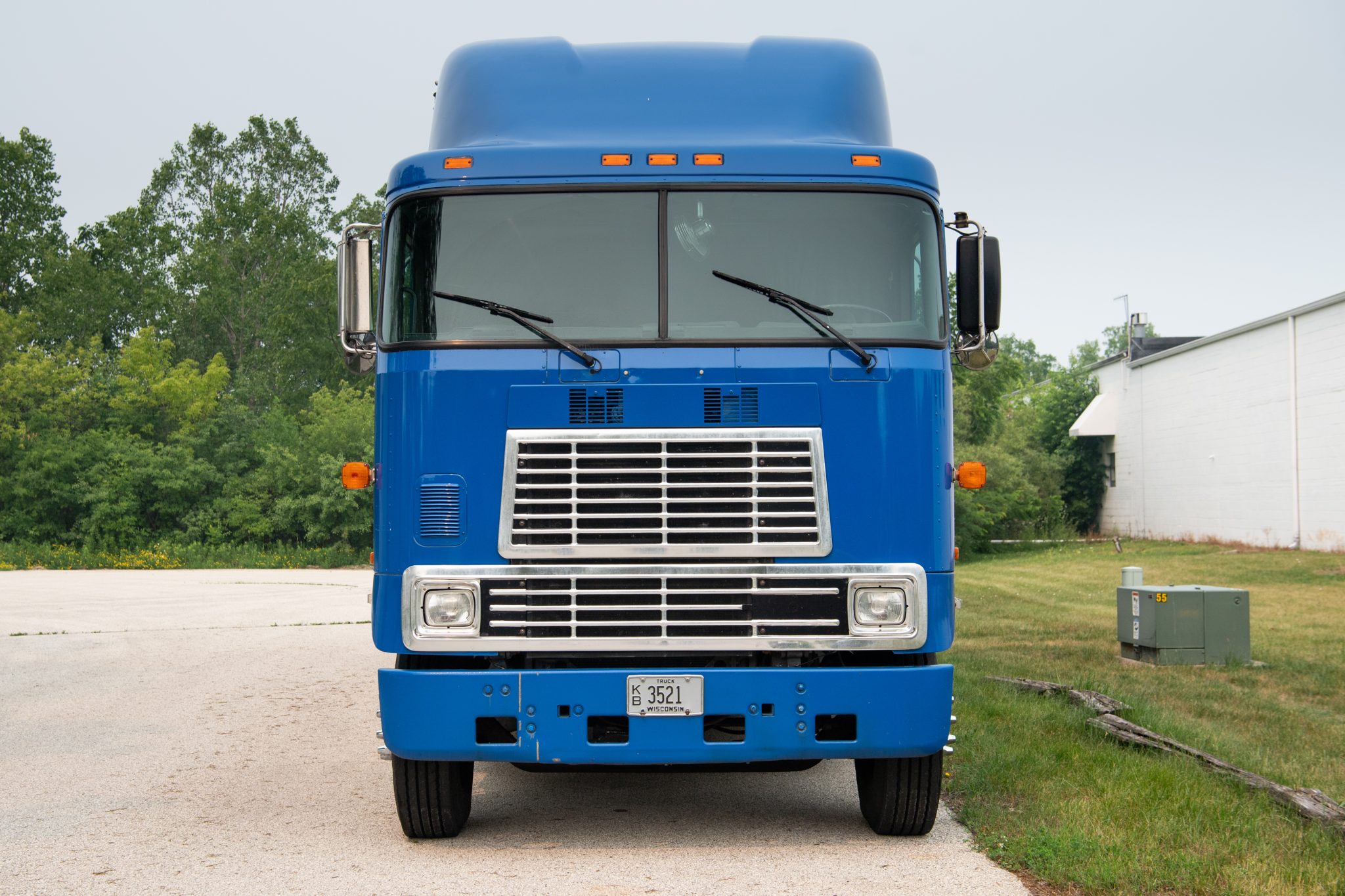 Blue 22.5″ steel wheels are wrapped in a mixed set of 295/75 tires. The truck is equipped with dual rear axles and a rear air suspension system.