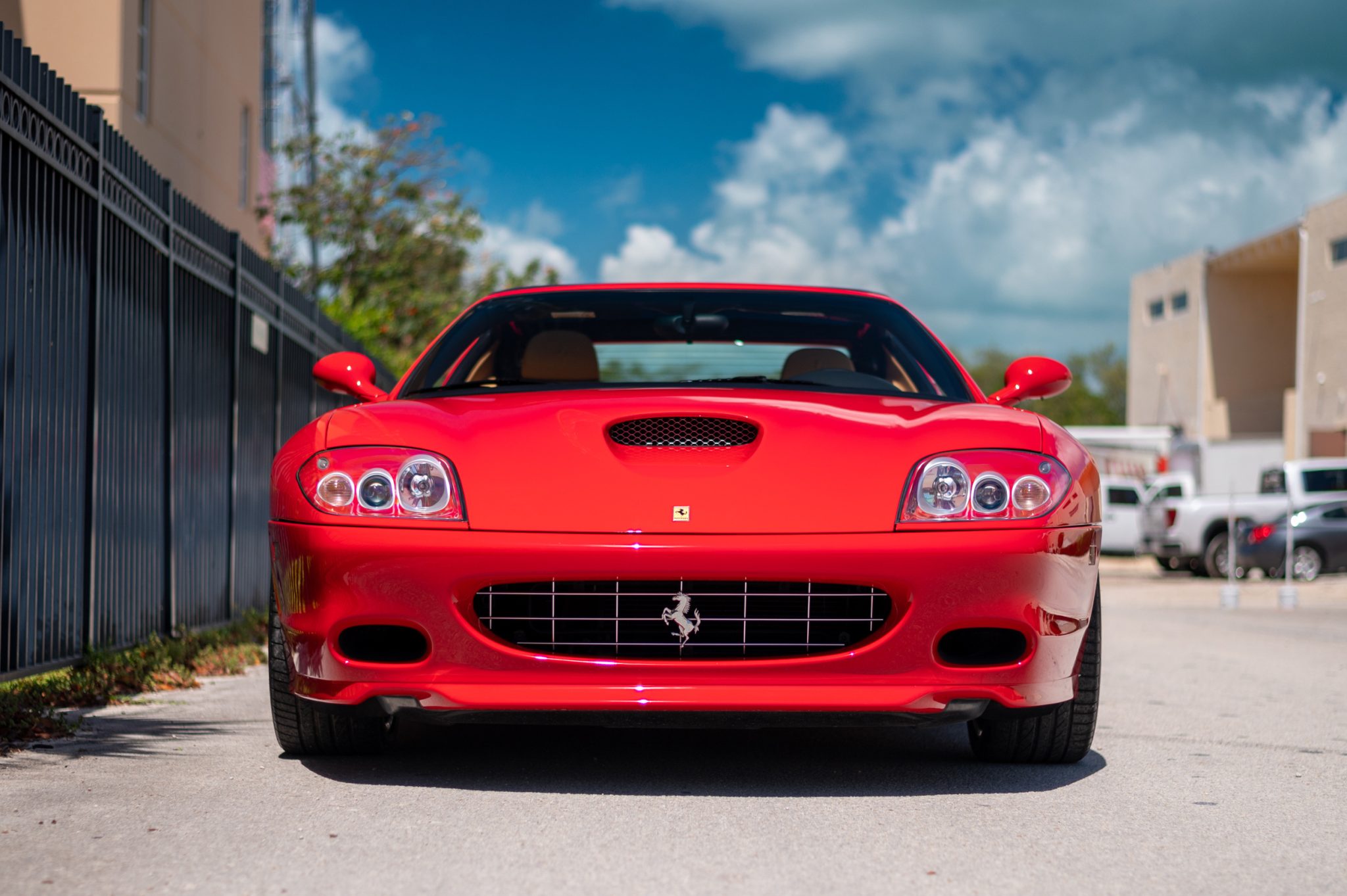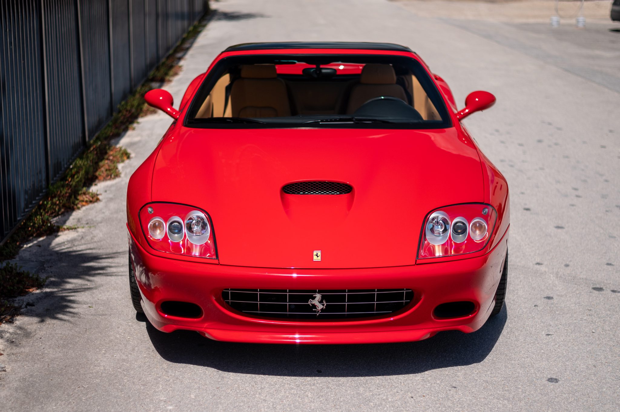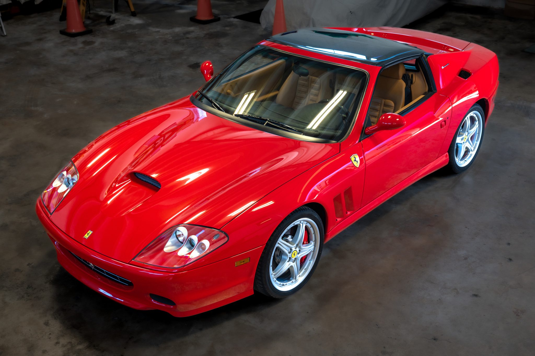 Silver-finished 19″ multi-piece alloy wheels are mounted with Bridgestone Potenza RE050A tires measuring 255/35 up front and 305/30 out back. The car is equipped with Skyhook adaptive dampers, and an upgraded suspension was included with the GTC package. Stopping power is provided by red Ferrari-branded calipers over cross-drilled carbon-ceramic rotors at all four corners, and the brake fluid was flushed in February 2023.