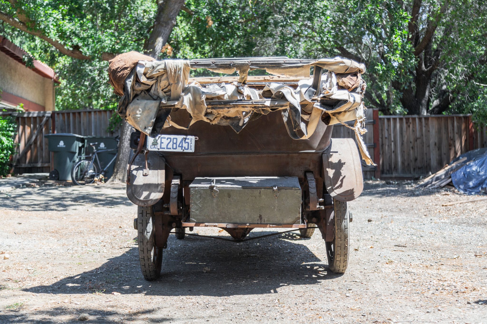 The wood spoke wheels feature Baker steel rims and Oakland-branded center caps, and they are mounted with 34×4″ Goodrich Silvertown Cord bias-ply tires. Replacement steel rims and wood spokes were installed on the left-side wheels under the seller’s ownership. A spare Universal tire is mounted on the right running board. The Model 40 rode on a 112″ wheelbase and featured front semi-elliptical leaf springs and rear ¾-elliptical leaf springs. Stopping power is provided by rear mechanical drum brakes.