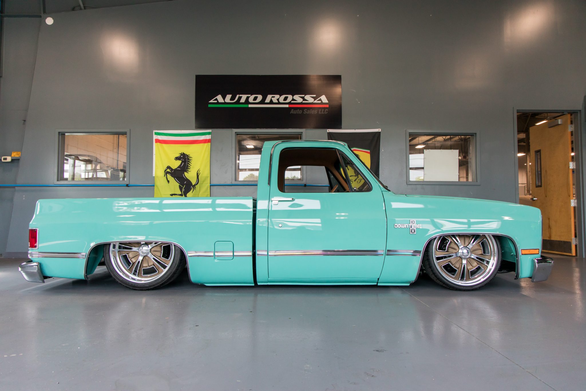 Staggered-width 22″ Schott alloy wheels are mounted with 255/30 and 285/35 Ironman iMove tires. Stopping power is from Wilwood calipers over drilled and slotted rotors up front and drums in back. The truck is equipped with power rack-and-pinion steering as well as an air suspension system that includes front and rear drop members, Belltech 3″ drop spindles, Firestone and Slam Specialties air springs, KYB shocks, Strong Arms tubular front control arms, and a four-link rear setup with an adjustable Panhard bar. The frame was powder coated under prior ownership.