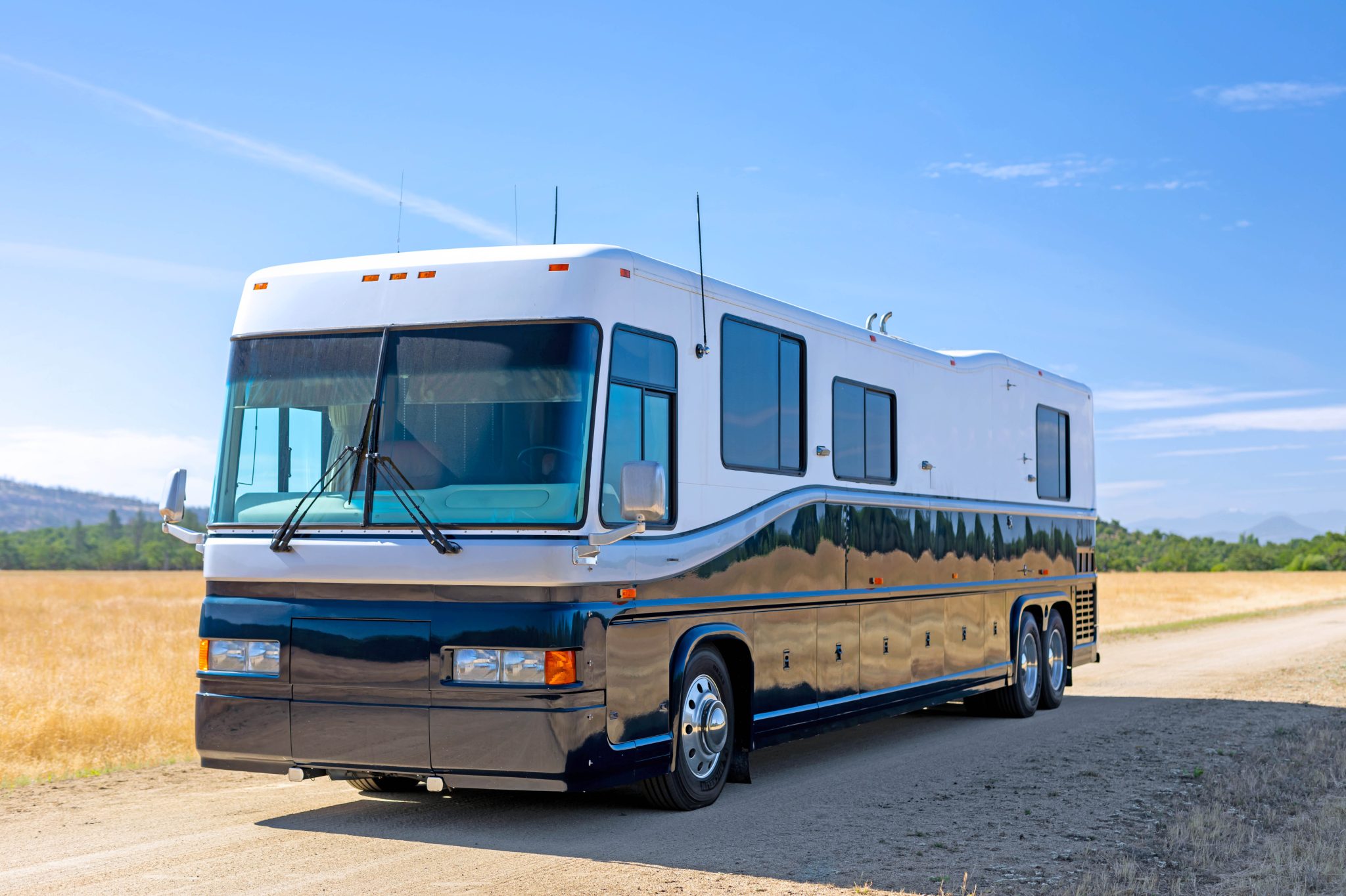 Polished 24.5″ wheels wear 11R-24.5 Michelin XZE2 tires that show 2018 production date codes. Stopping power is from air-actuated disc brakes, and the chassis is equipped with an HWH automatic leveling system.