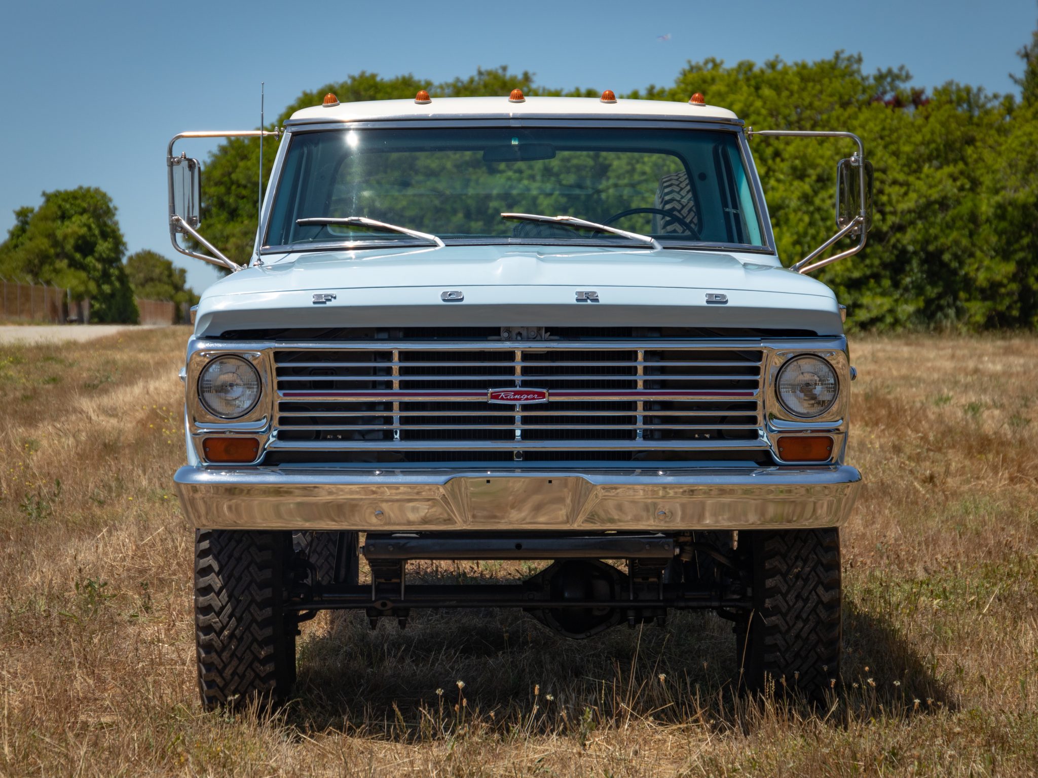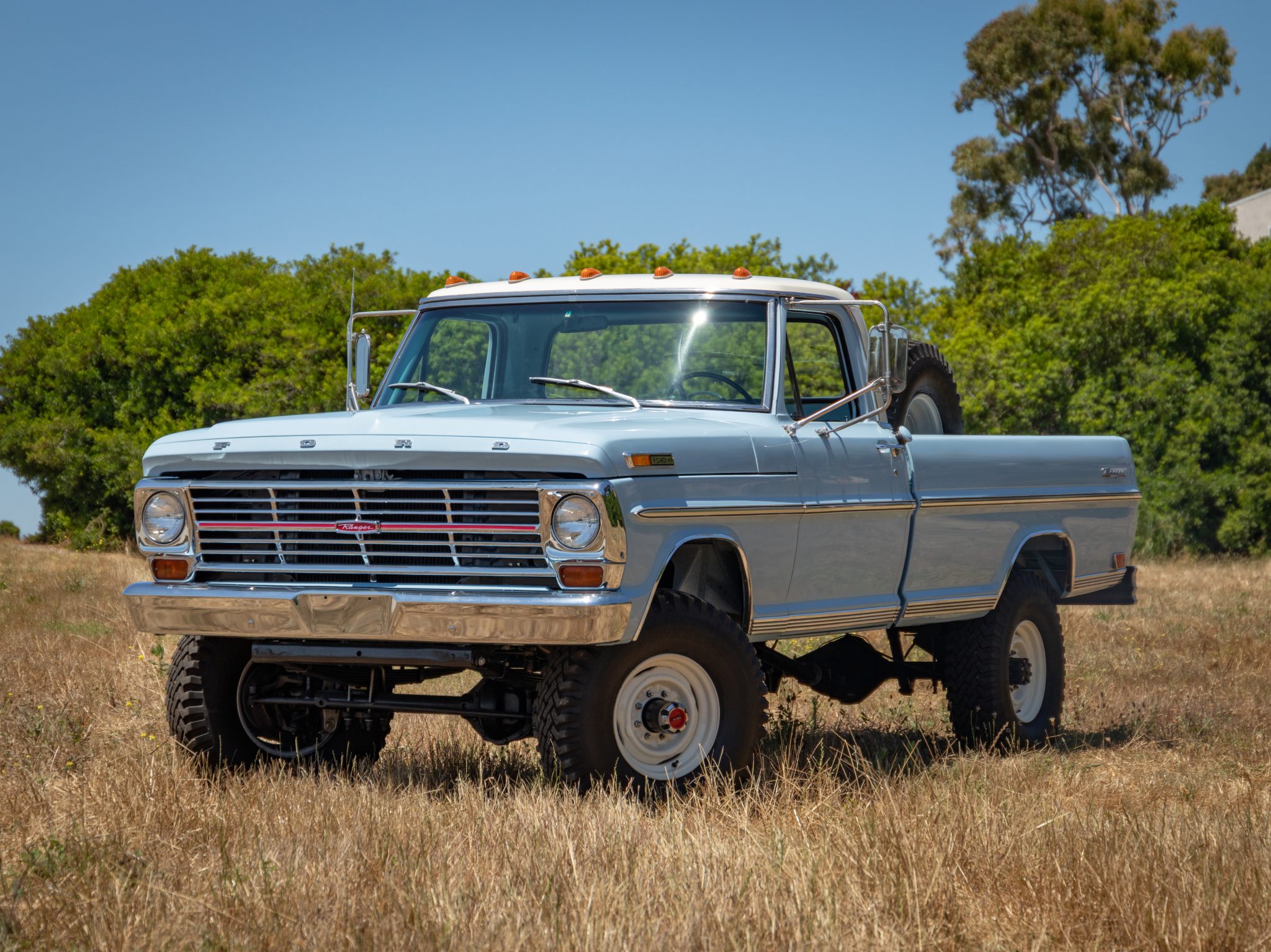 White-finished 16″ steel wheels are mounted with 9.00x16LT Specialty Tires of America Superlug tires, and a matching spare is mounted inside the bed. The truck is equipped with power steering and manually locking front hubs. The braking system has reportedly been modified with front disc brakes with four-piston calipers sourced from a later model F-250 as well as a Corvette-sourced master cylinder and a Classic Performance Products brake distribution block. The seller reports the steering box has been replaced.