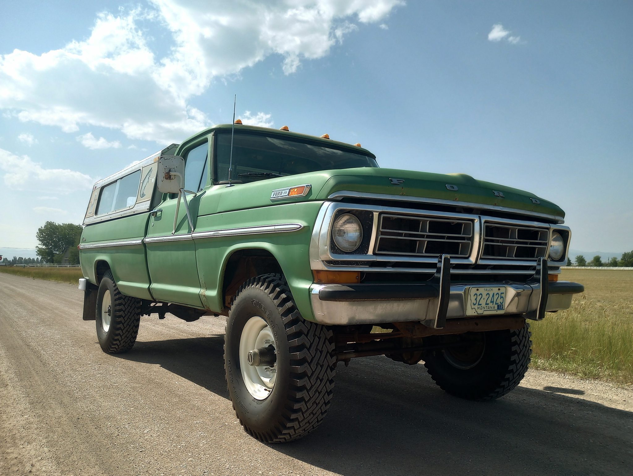 White-finished 16″ steel wheels are wrapped in 9.00-series STA Superlug bias-ply tires. The truck is equipped with power-assisted drum brakes and Warn manually locking front hubs.