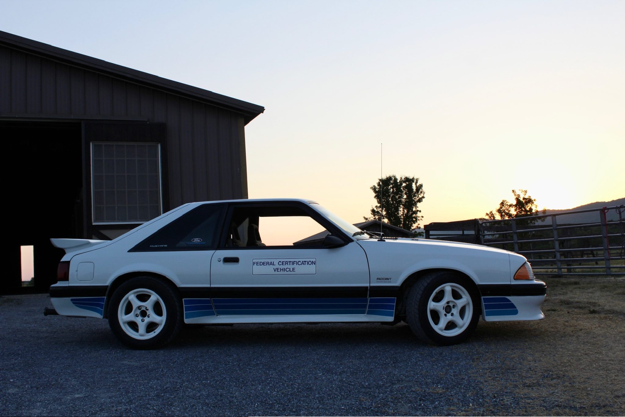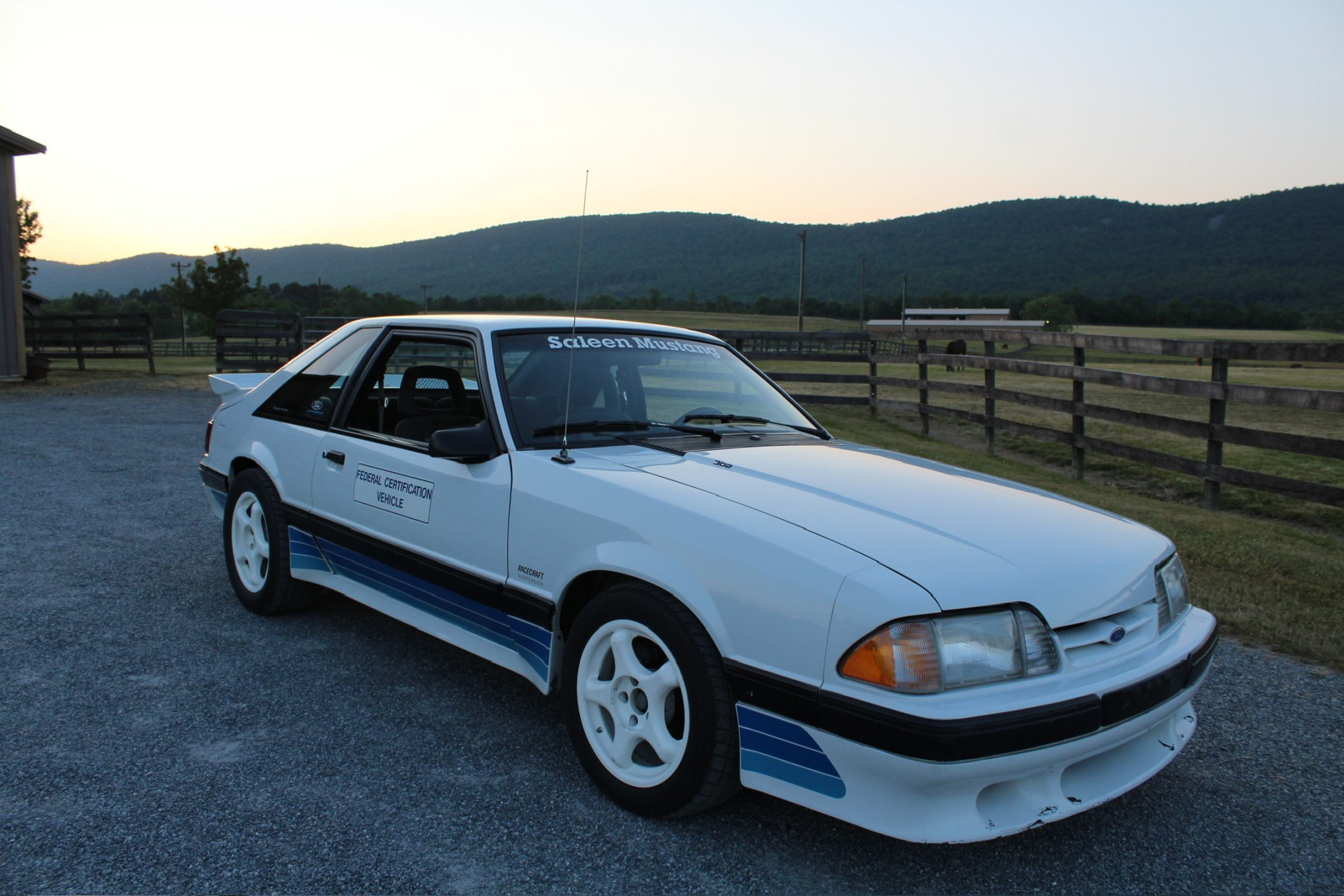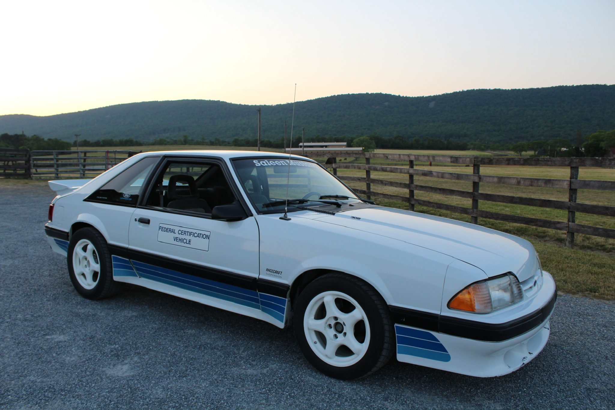 White 16″ DP-5 SCC wheels wear older 225/50 General XP 2000Z tires. Saleen installed SVO-style four-wheel disc brakes and cockpit-adjustable Monroe Formula GP shocks and struts. The front wheel bearings were adjusted in May 2023.