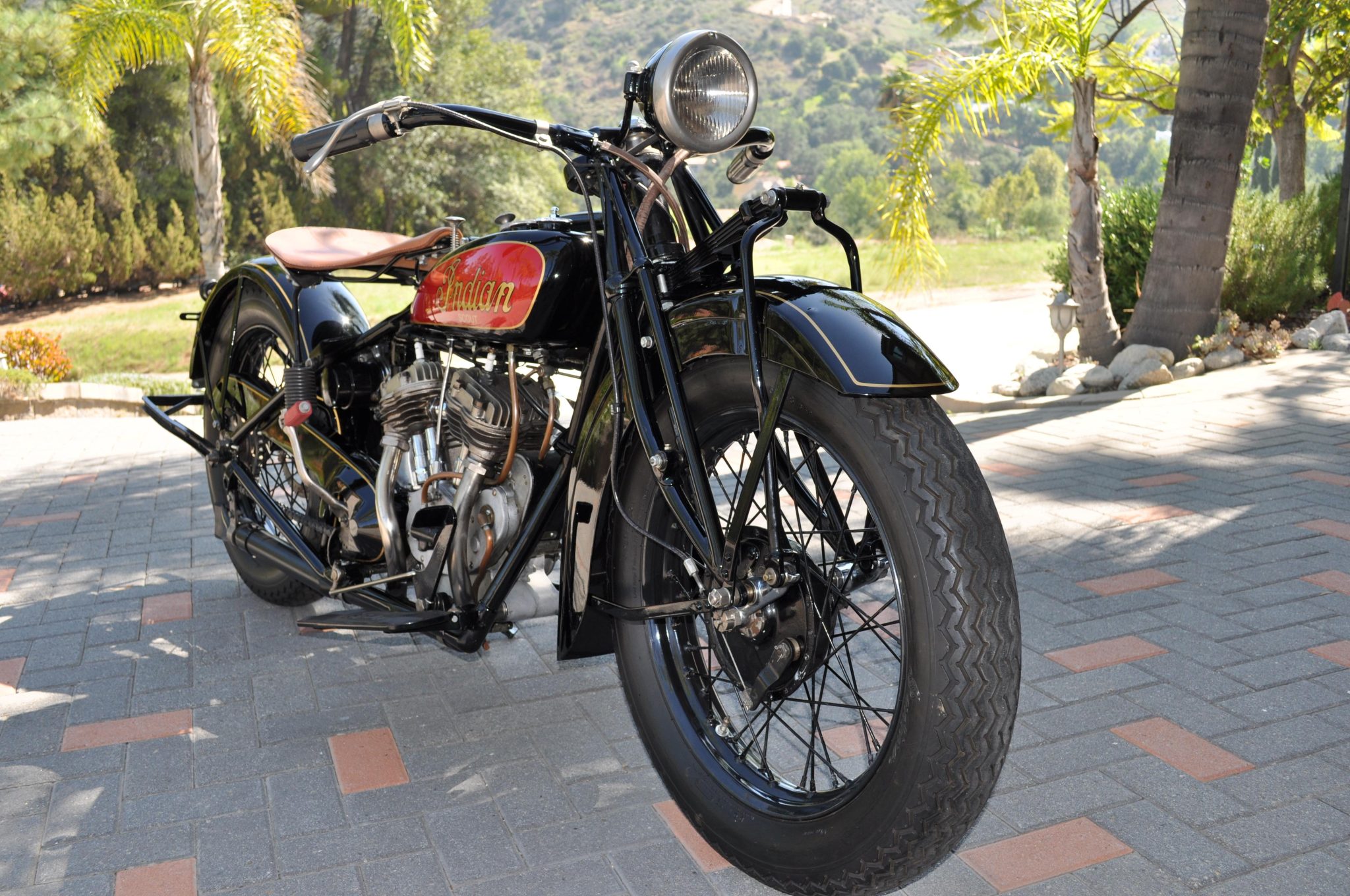 Drop-center rims finished in black were mounted with 4.00×18″ Coker Indian-script tires during the refurbishment. Suspension is provided by a triple-stem leaf-spring fork as well as dual springs under the hinged seat. Braking comes from an internal expanding drum up front and an external contracting band acting on the rear hub. The selling dealer states that pivot points were lubricated in preparation for the sale.