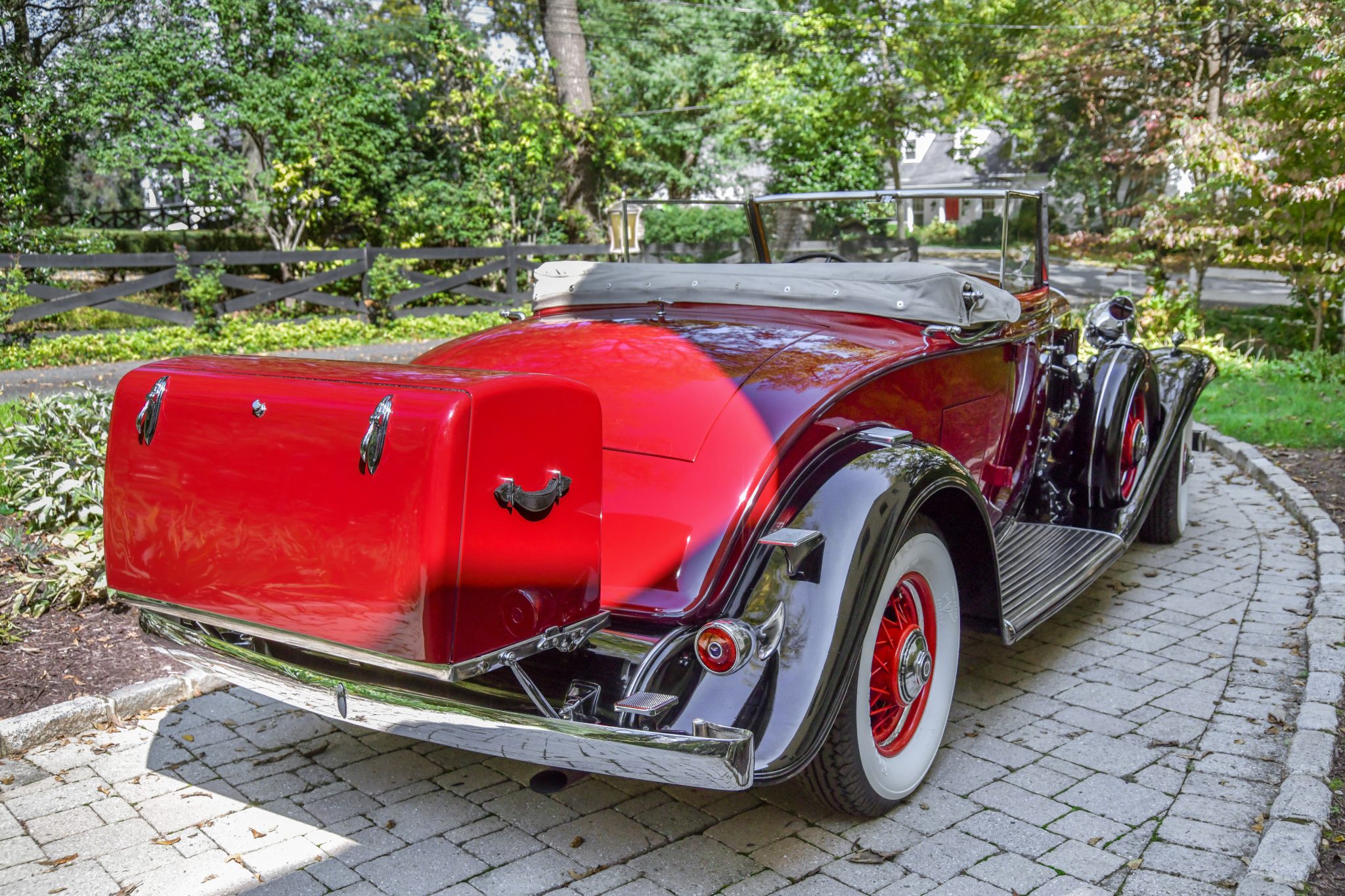 The wire wheels are painted bright red and wear center caps with “V8” insignias, and they are mounted with 7.00–17 Firestone Heavy Duty whitewall bias-ply tires that were installed in 2019. Dual side-mount spares and metal spare tire covers were optional equipment for 1932 V8 cars, and they are mounted with mirrors in the fenders. The 355-B rode on a 134″ wheelbase and featured semi-elliptical leaf springs at all four corners as well as lever-arm shock absorbers, which can be adjusted to five different settings through ride regulation. Stopping power is provided by drum brakes.