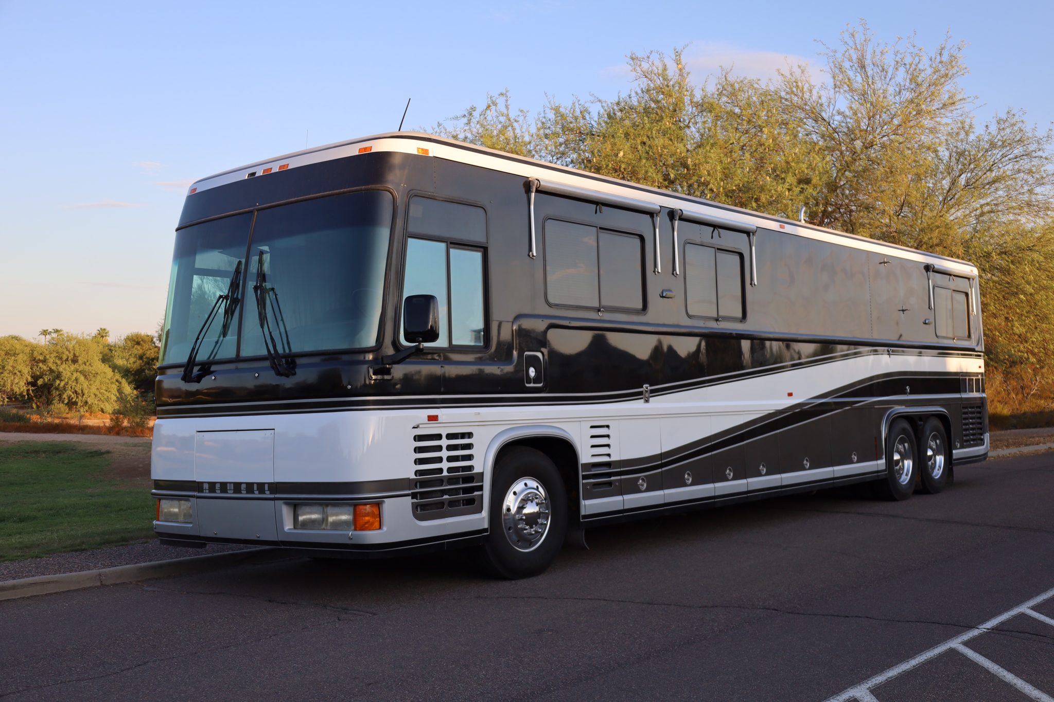 Polished 22.5″ alloy wheels wear 325/80 Hankook AH11 tires. Stopping power is from air-actuated disc brakes, and the chassis is equipped with an HWH automatic leveling system. Infrastructure features include a 12.5kw diesel-fueled generator, a Raritan 20-gallon marine water heater, a 168-gallon freshwater tank, inline water filters, 173-gallons of wastewater capacity, 67-gallons of propane capacity, six house batteries, a 75-amp converter/charger, and shore connections for water, waste disposal, and 50-amp electrical service. The generator is said to have been overhauled under current ownership.