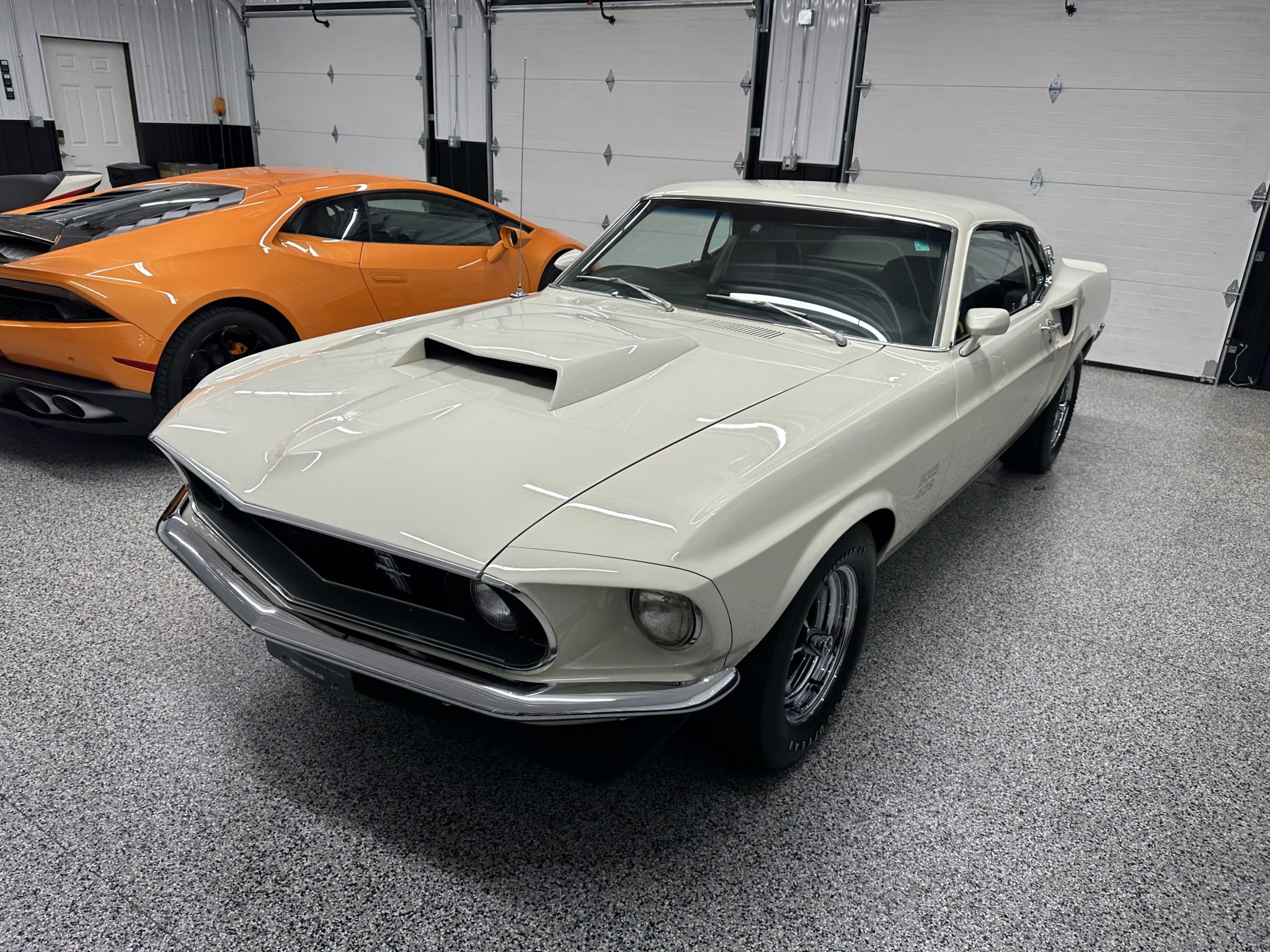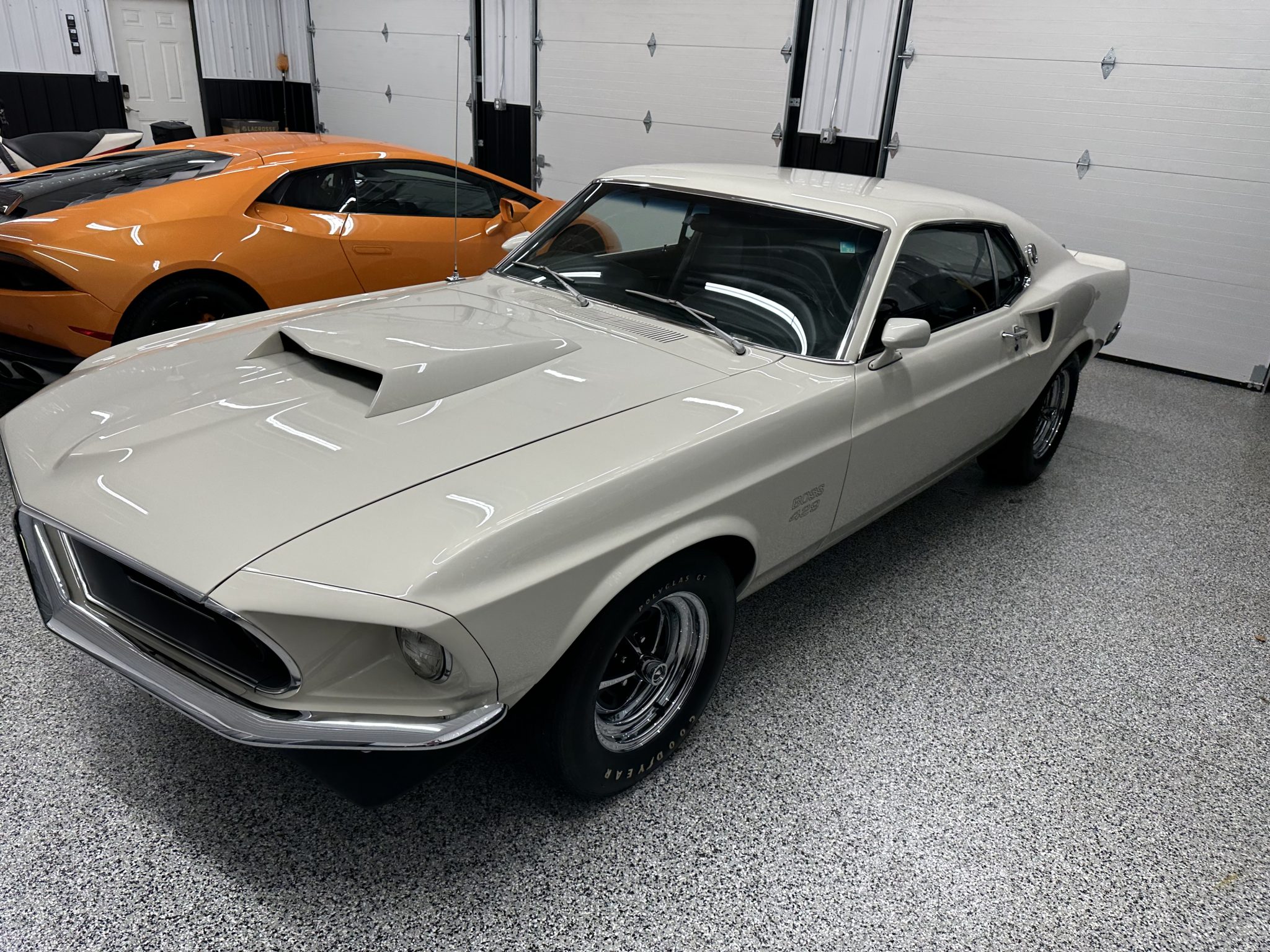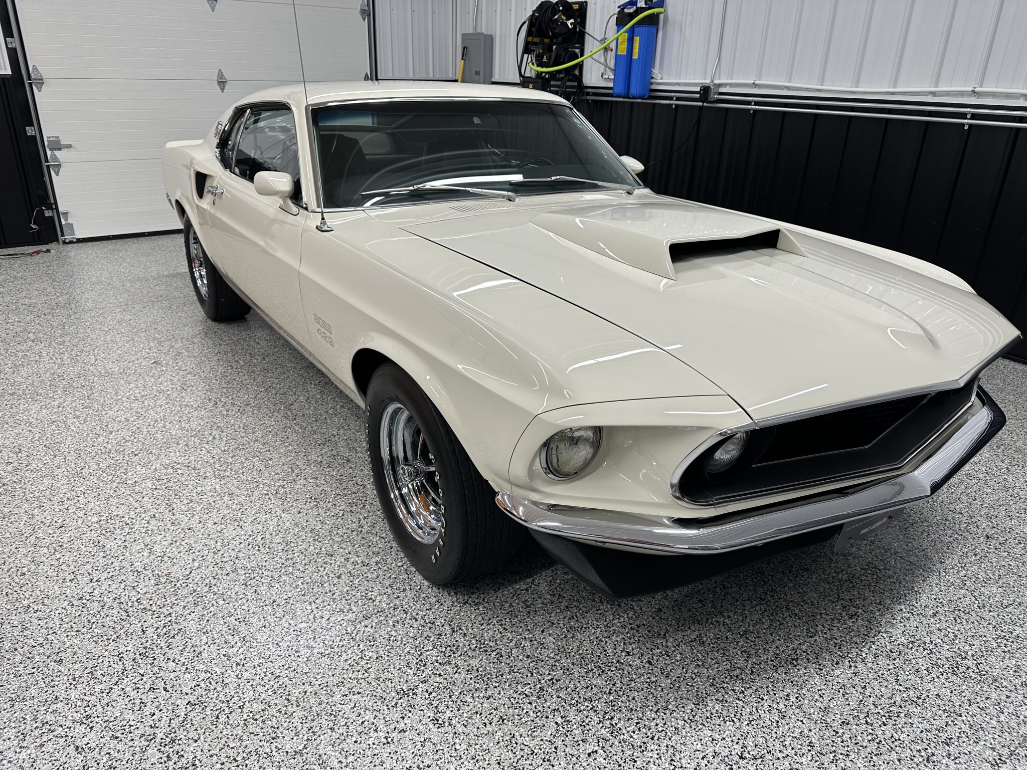 The 15″ Magnum 500-style wheels are mounted with Goodyear Polyglas GT tires. The Boss 429 model was equipped with revised control arms, a higher-rate front anti-roll bar than other Mustang variants, a rear anti-roll bar, and a competition suspension with staggered rear shocks. Power-assisted brakes with discs up front and drums out back were standard on the 429, with the front brakes reinforced with heavy-duty hubs and rotors as well as oversized spindles. Power-assisted steering was also equipped from the factory.