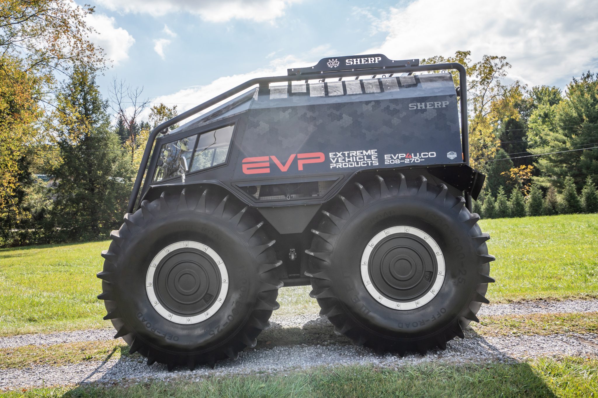 Silver-finished 25″ wheels are wrapped in 1600×600-25 WEPN low-pressure tires that feature paddle treads and provide buoyancy and propulsion on water. The setup provides two feet of ground clearance with the ability to climb or descend a 30-degree grade. The vehicle is equipped with a central tire inflation system as well as auxiliary fuel containers located in the center of each wheel.