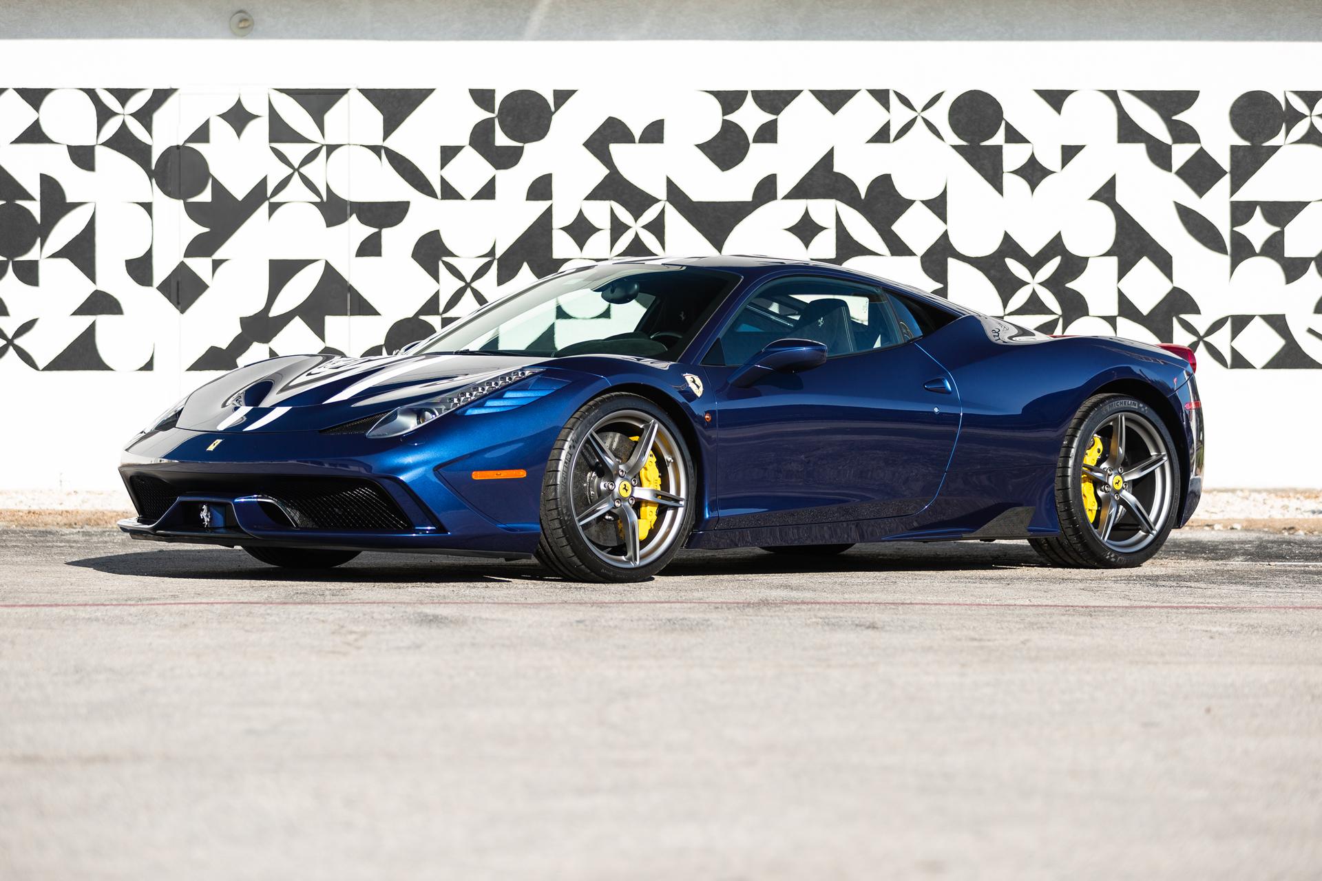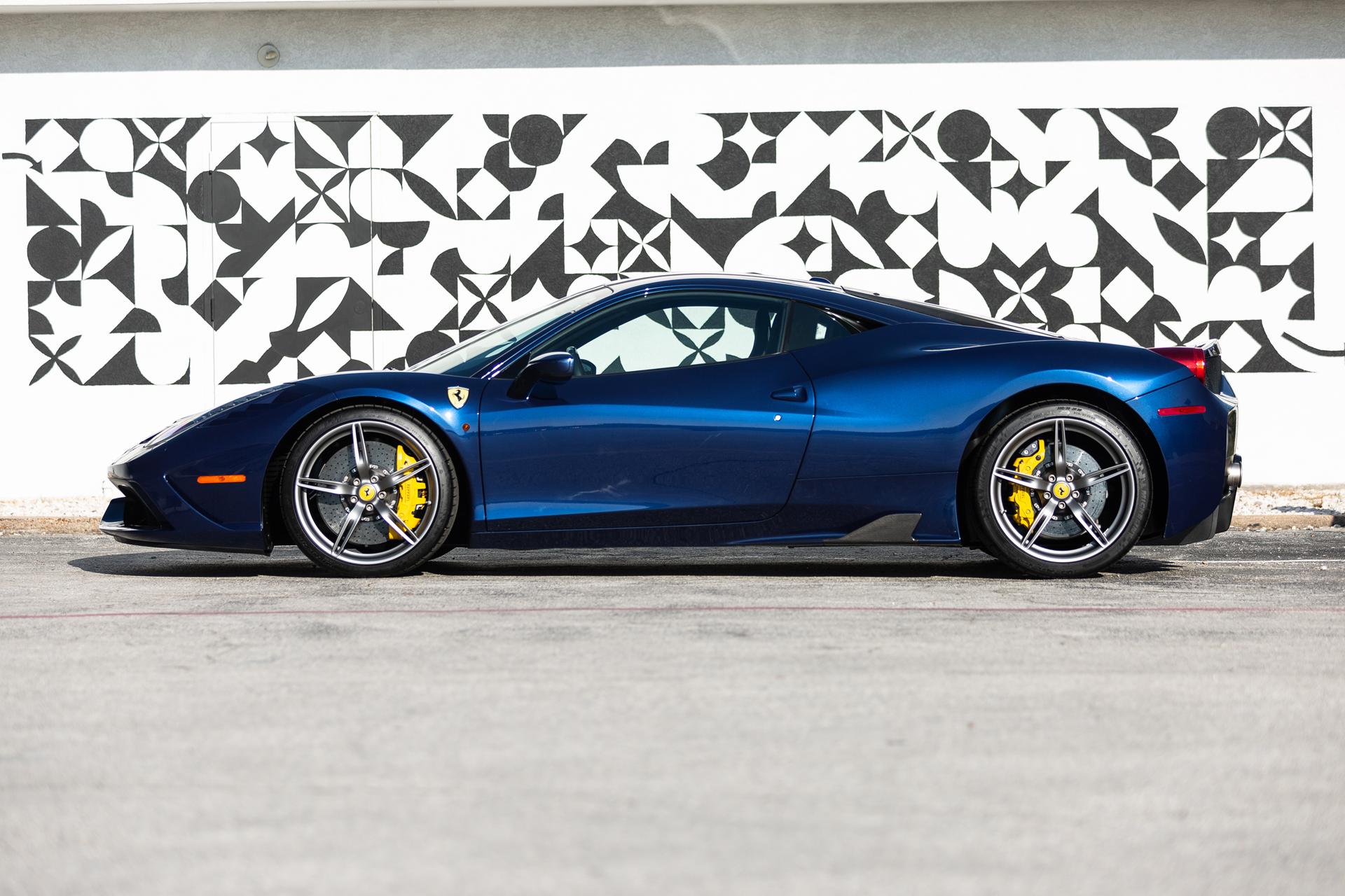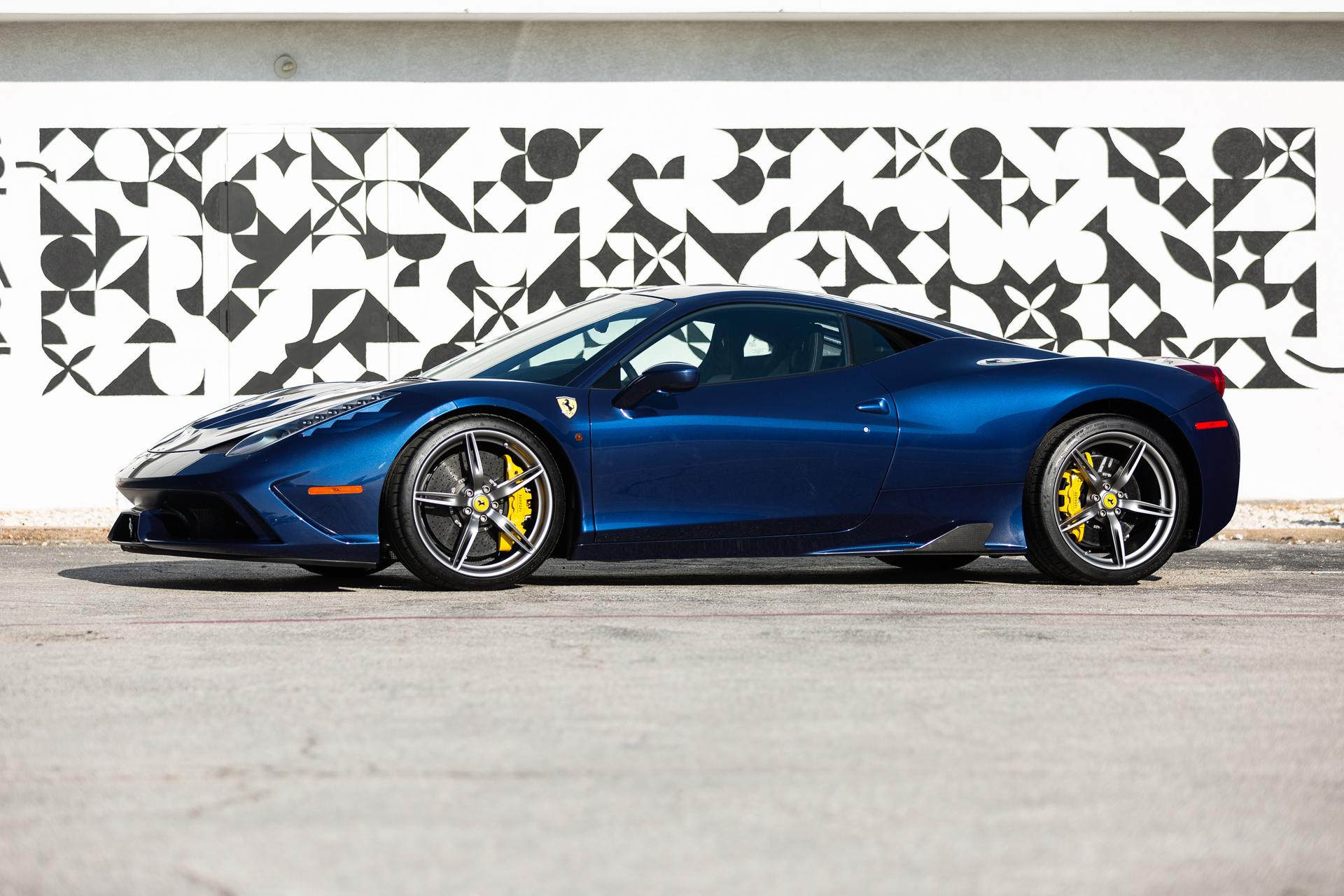 This example is finished in Blu Tour de France with North American Racing Team (NART) racing stripes and features adaptive xenon headlights, fog lights, Scuderia Ferrari fender shields, and optional carbon-fiber front flaps and side nolders. A collection of paint meter readings are presented in the gallery below.