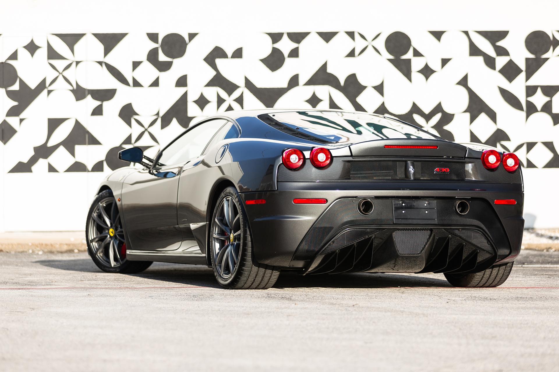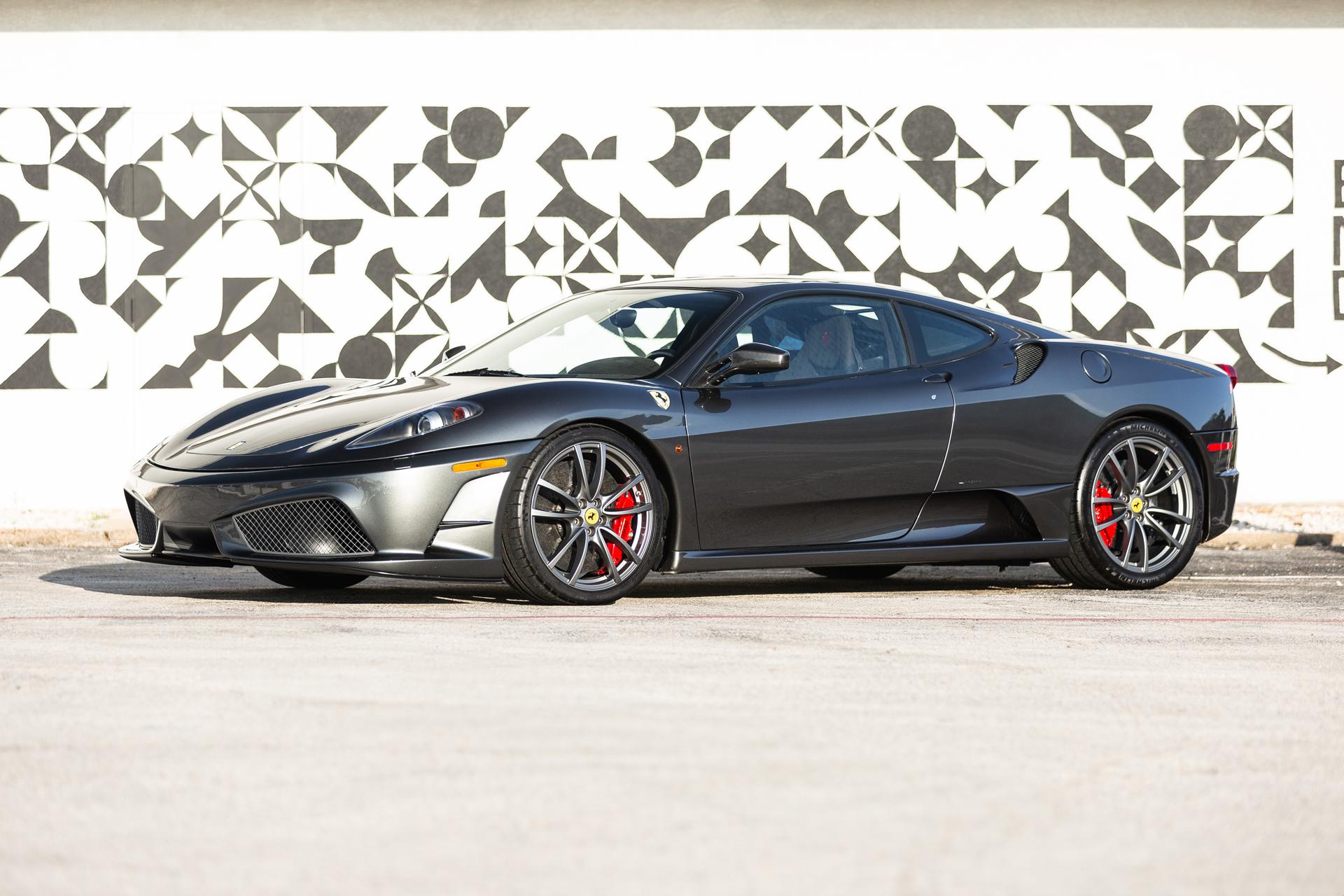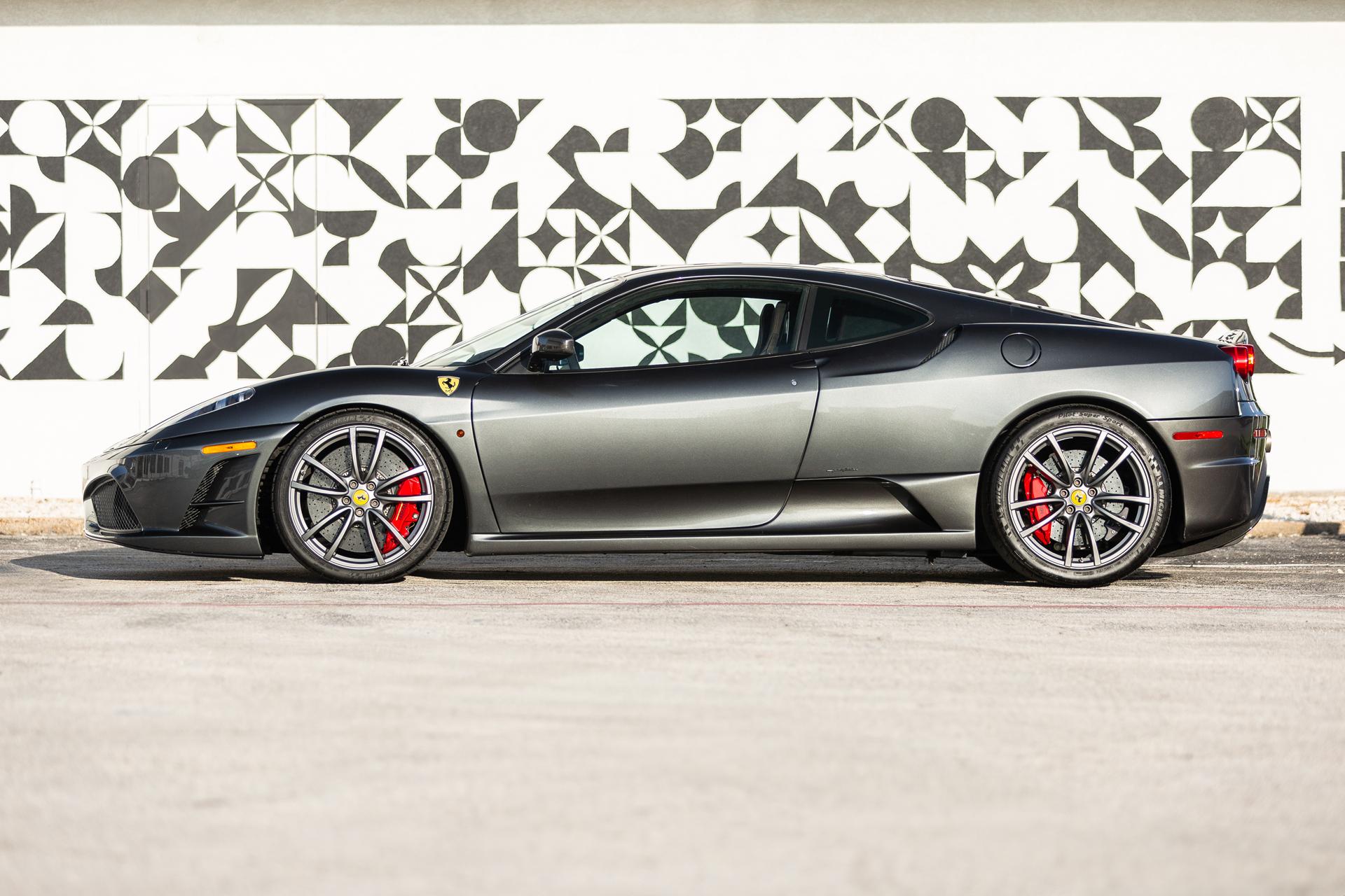 The 19″ Scuderia alloy wheels are mounted with 235/35 front and 285/35 rear Michelin Pilot Super Sport tires that show date codes from 2014 and 2015. Braking is handled by red-finished brake calipers fitted over Brembo carbon-ceramic rotors. Service in 2022 involved flushing the brake fluid and replacing the TPMS sensors.