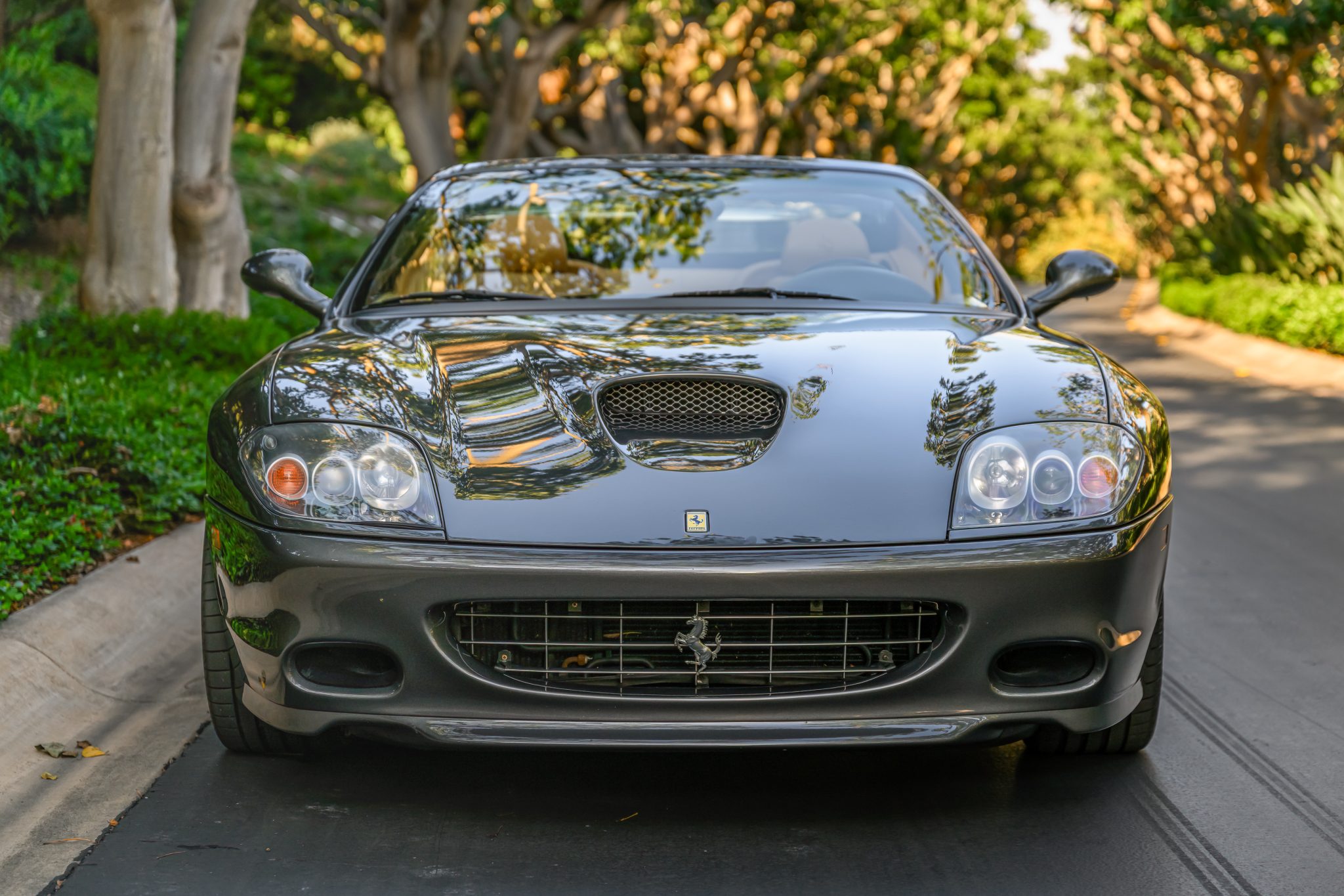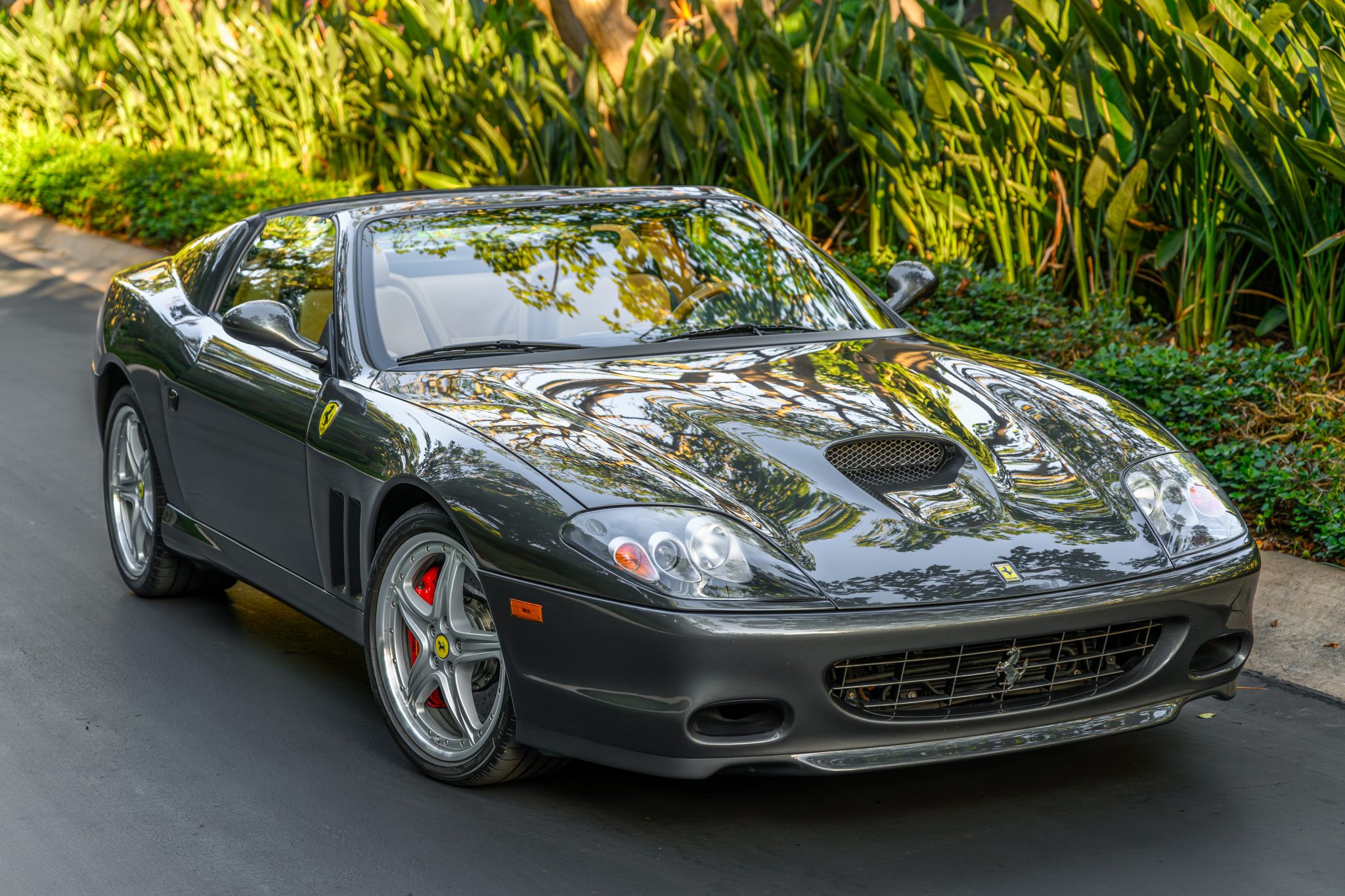 The 19″ multi-piece wheels wear yellow prancing horse center caps and are mounted with Bridgestone Potenza Sport tires. The car is equipped with Skyhook adaptive dampers, and the GTC package added suspension and steering upgrades as well as a carbon-ceramic brake system.