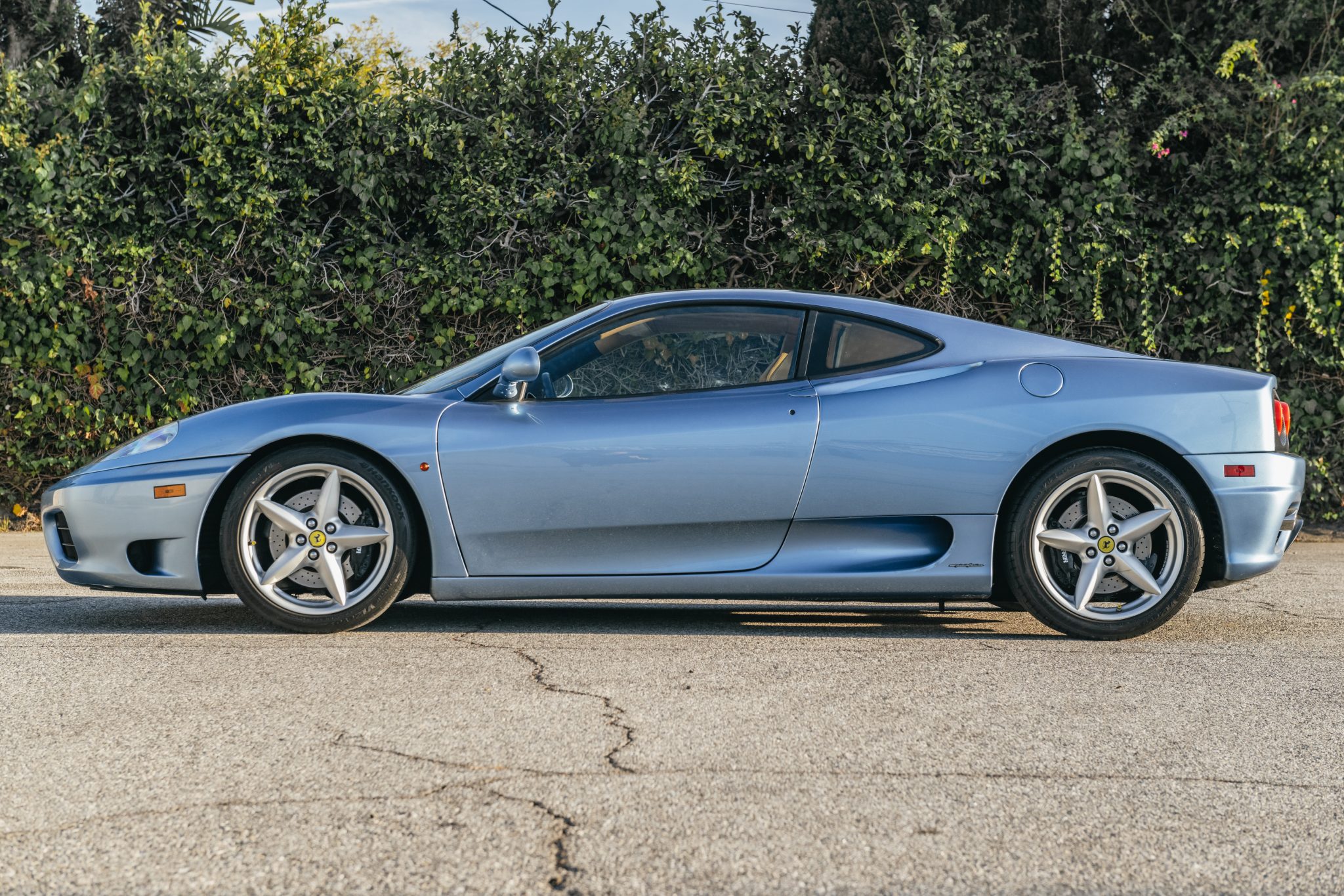 The 18″ five-spoke alloy wheels are mounted with 215/45 front and 285/35 rear Hankook Ventus V12 Evo tires. Stopping power is from black-finished Ferrari-branded calipers over cross-drilled and ventilated rotors at each corner. Curb damage is present on three wheels.