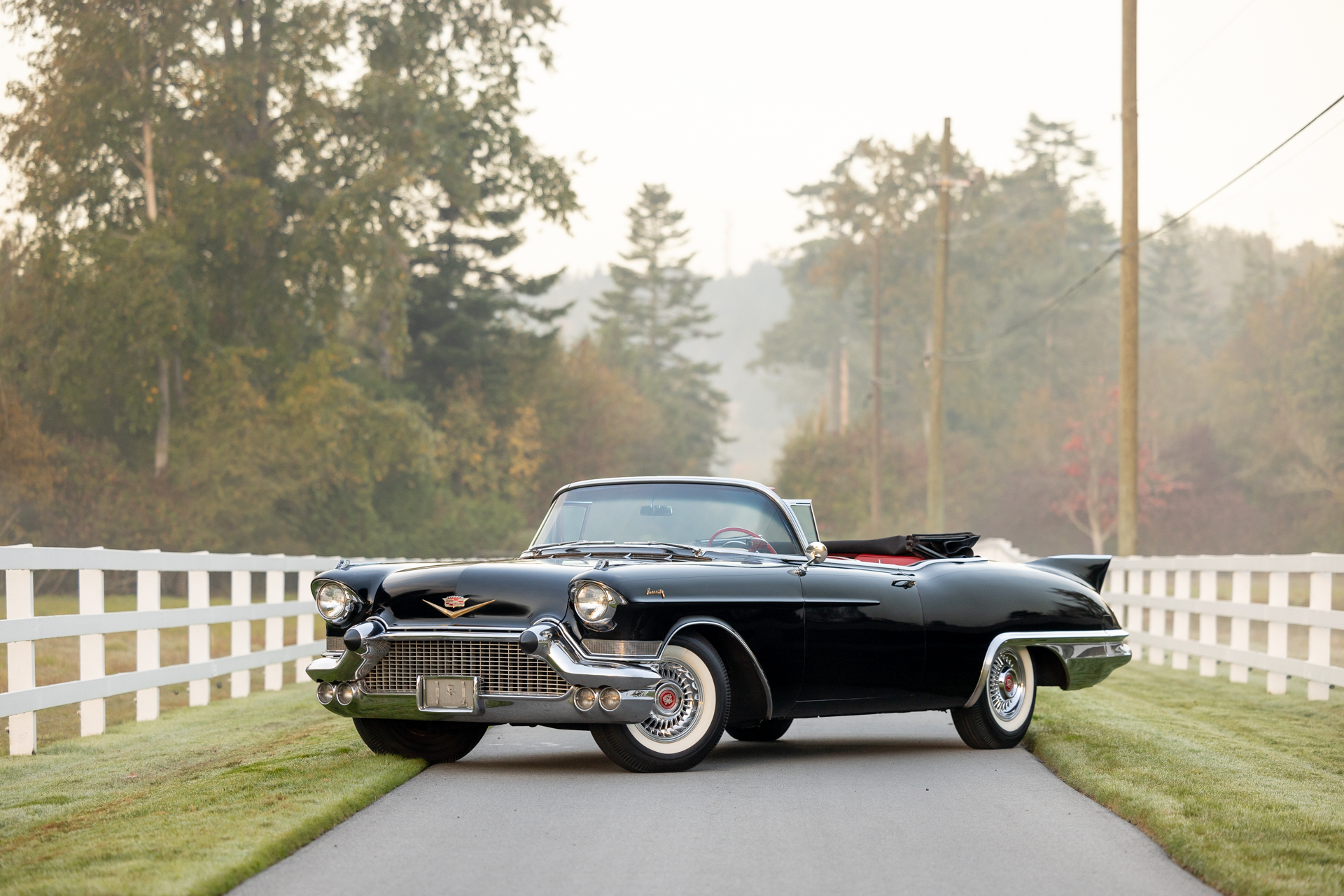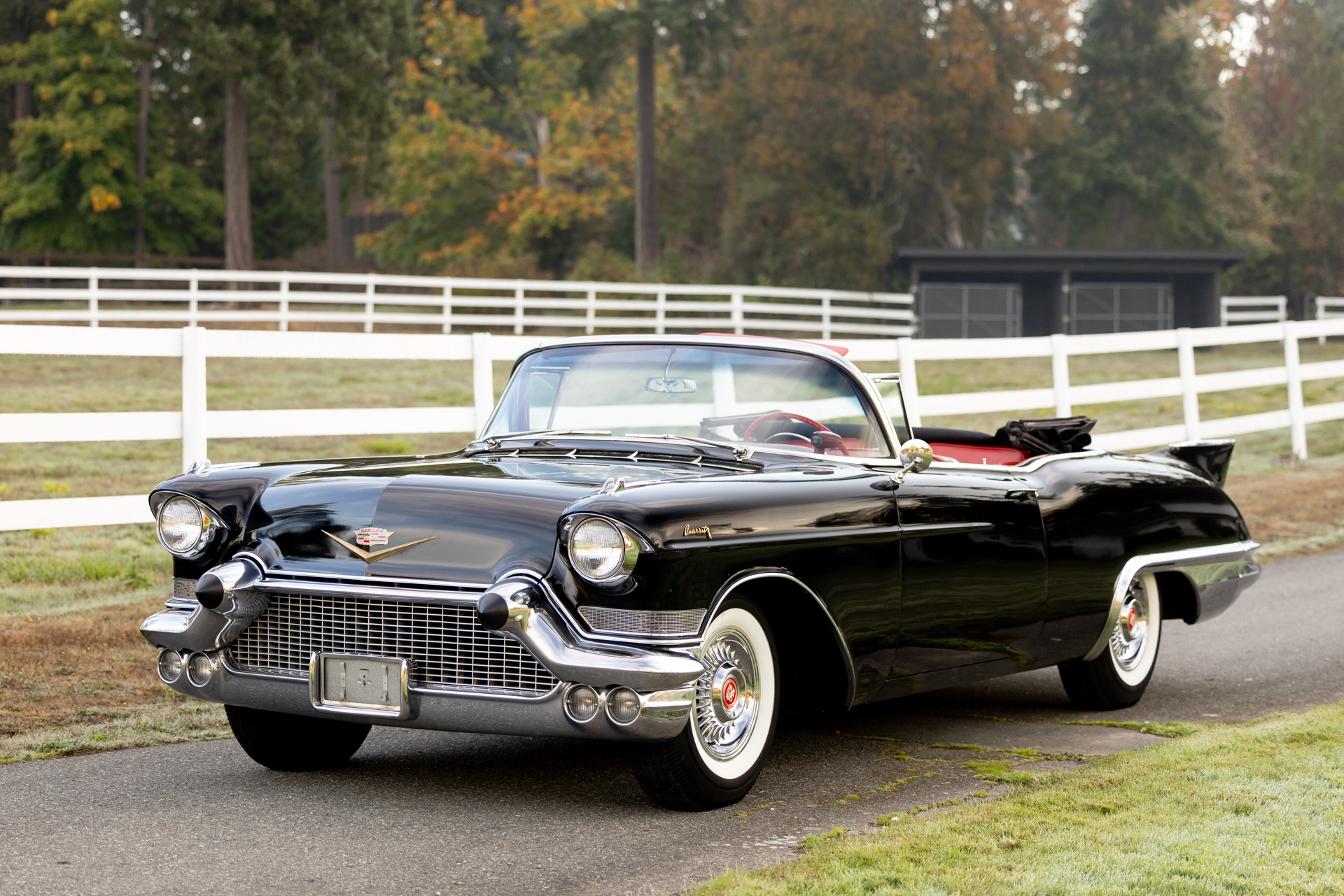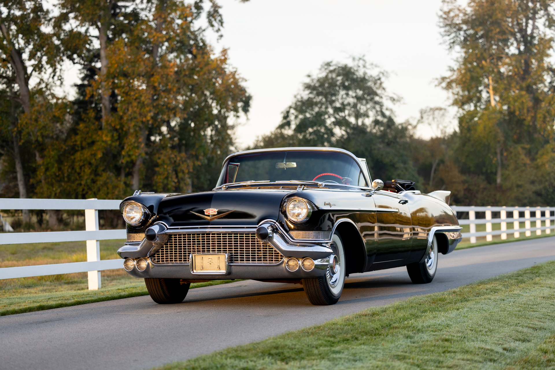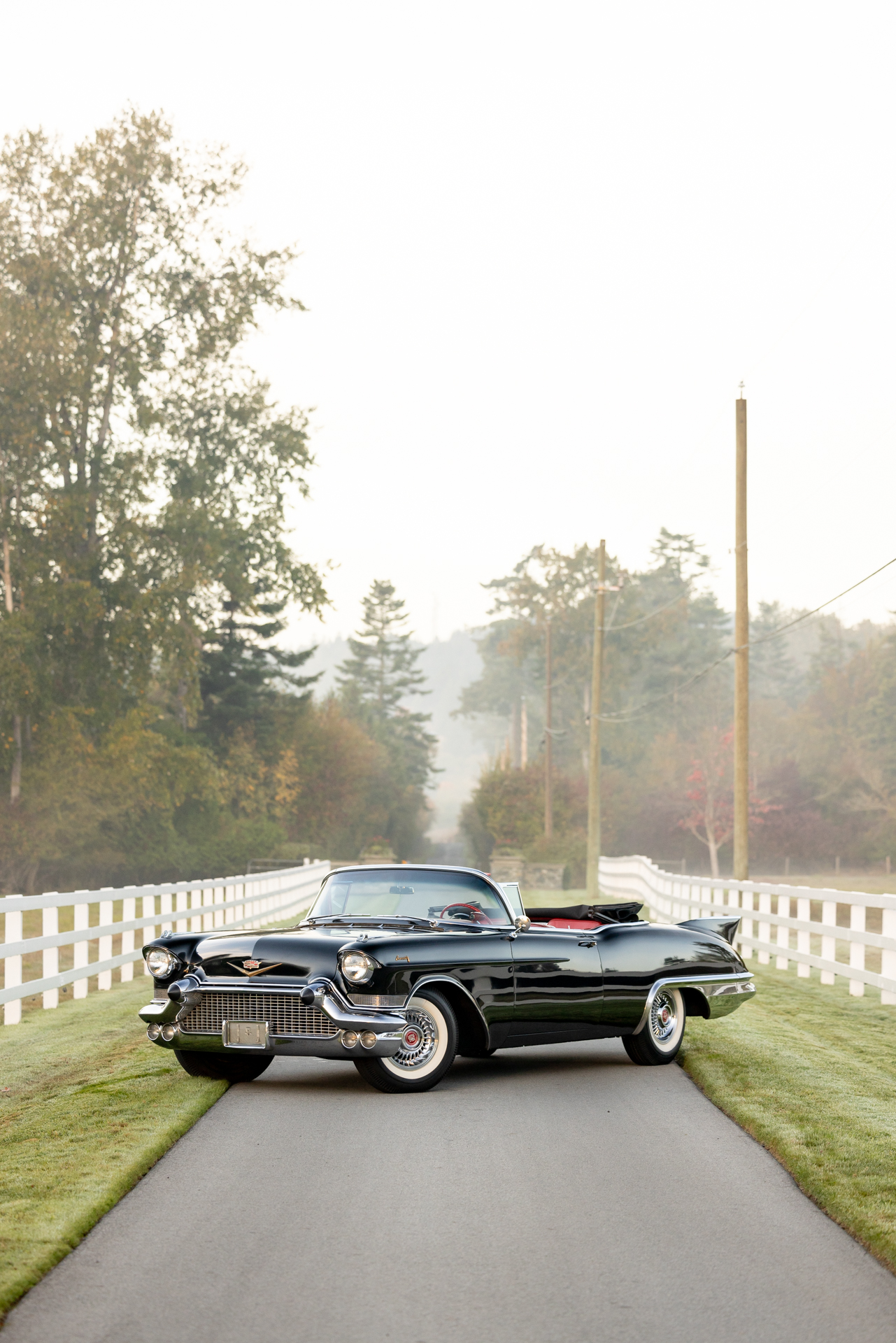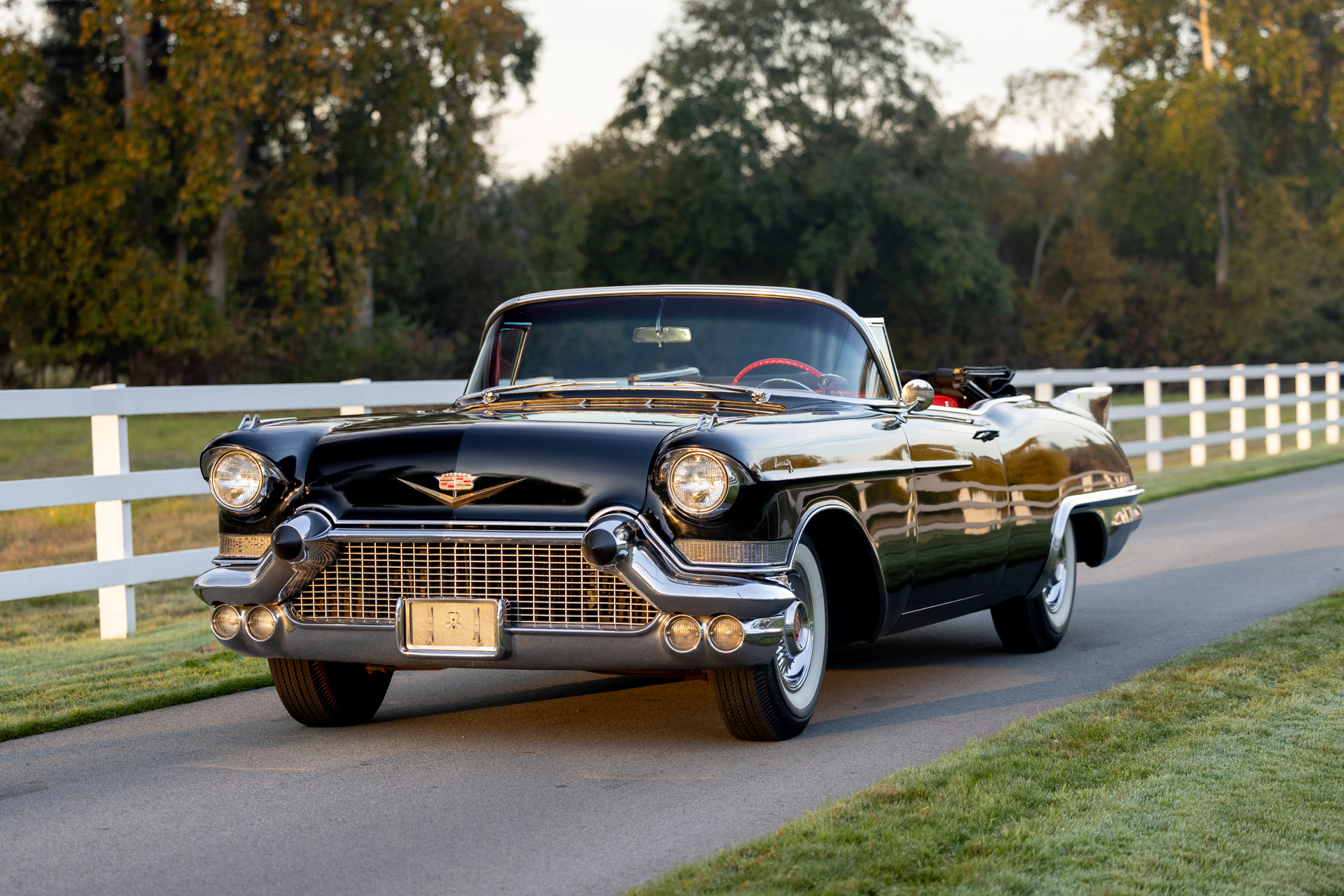 Chrome-finished 15″ Sabre wheels wear red reflective Cadillac center caps and are mounted with BFGoodrich Silvertown bias-ply whitewall tires. A matching spare wheel and tire are stowed in the trunk. The car was delivered from the factory with power-assisted steering and drum brakes. A replacement master brake cylinder and power brake booster were installed under previous ownership, and replacement rear shocks were fitted by the selling dealer in preparation for the sale. A brake fluid flush was also performed at that time along with a brake adjustment.