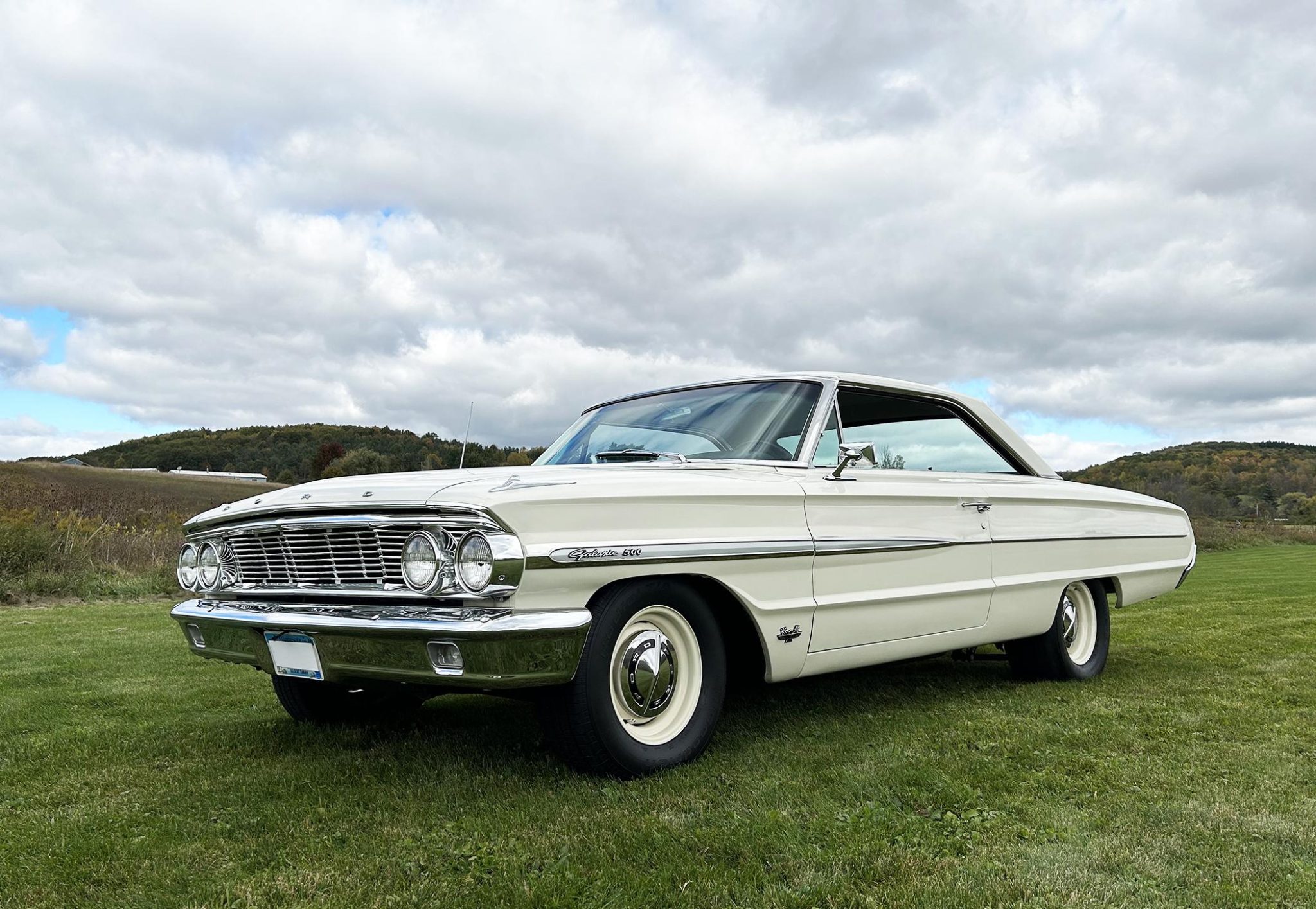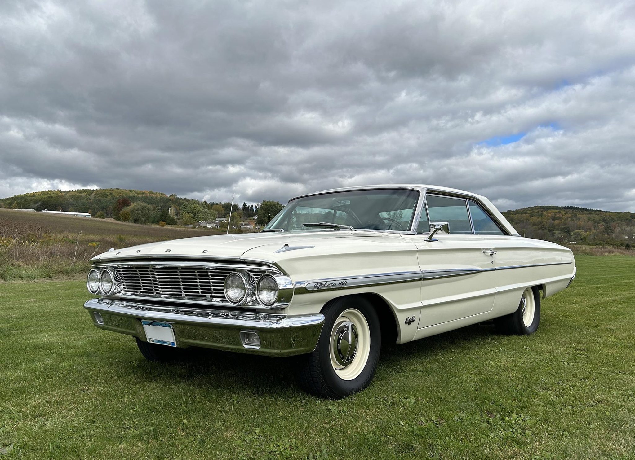 White 15″ steel wheels wear Ford-branded hubcaps and are mounted with 235/70 BFGoodrich Radial T/A tires up front and 275/60 Mickey Thompson ET Street R rubber out back. A matching spare and jack are located in the trunk. The car has been fitted with a front brake line lock and Calvert Racing rear traction bars. Braking is handled by a Wilwood master cylinder and front discs along with factory-style rear drums.