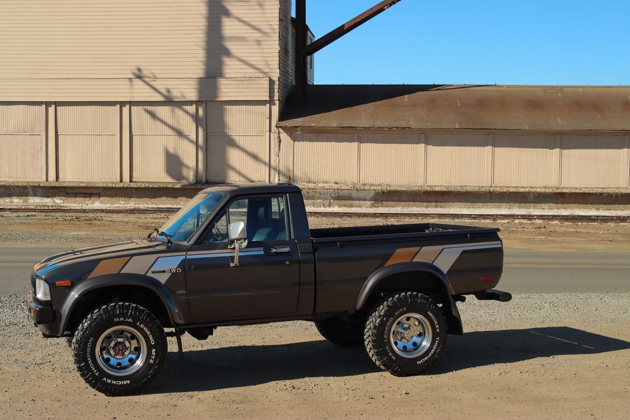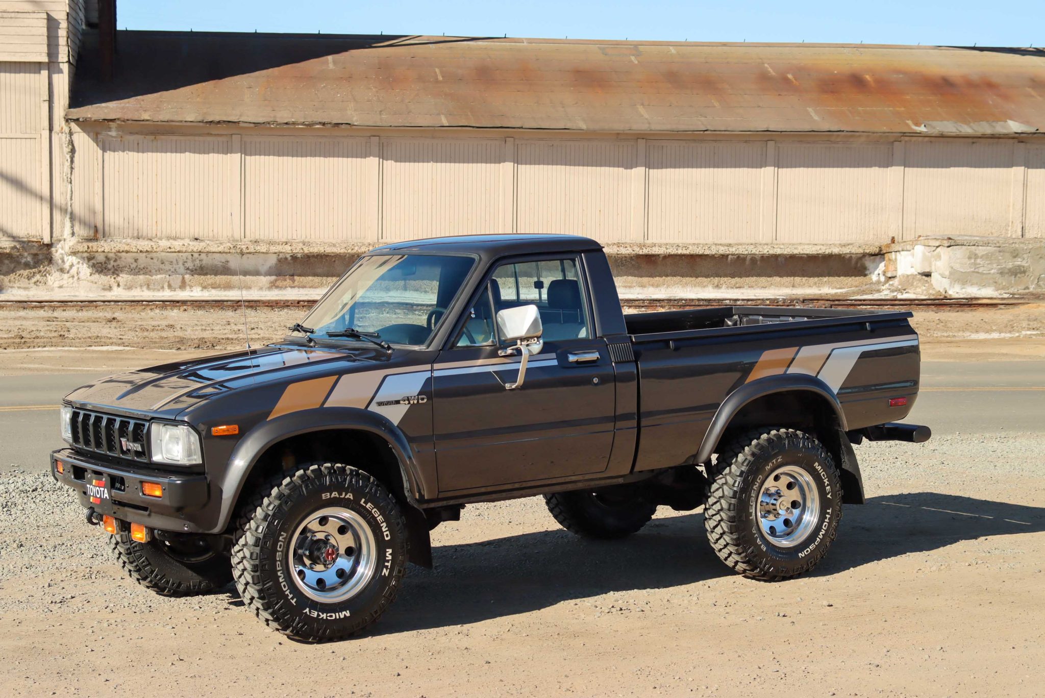Polished 15″ Mickey Thompson wheels wear 31×10.5″ Mickey Thompson Baja Legend MTZ tires that are noted to have been mounted under current ownership. The truck is equipped with Aisin manually locking front hubs, and braking is handled by power-assisted front discs and rear drums.