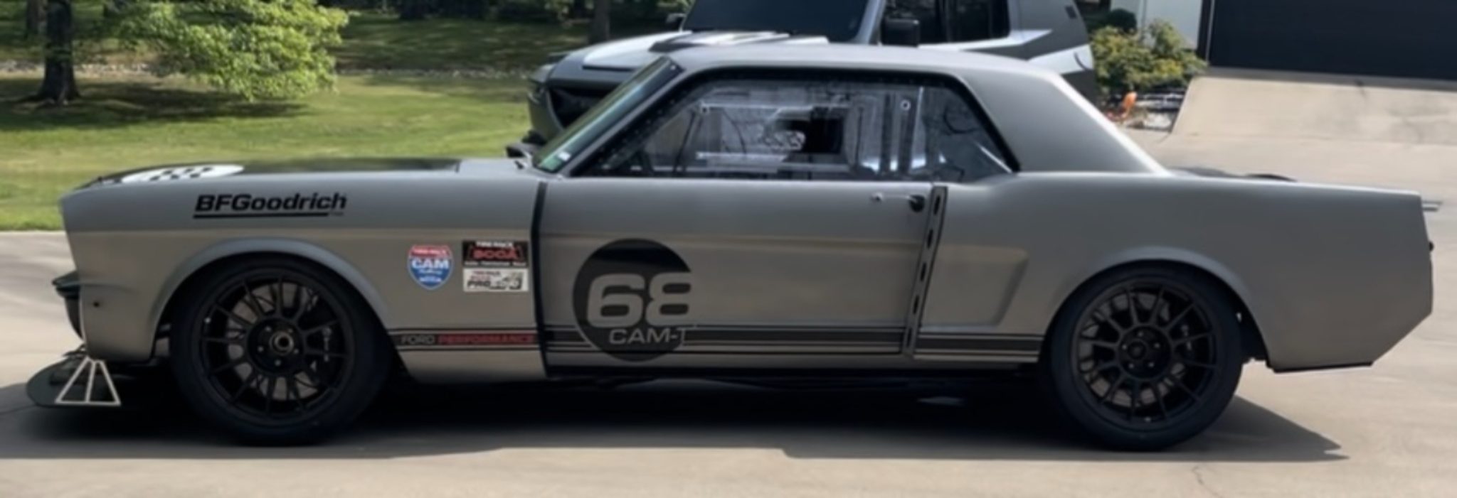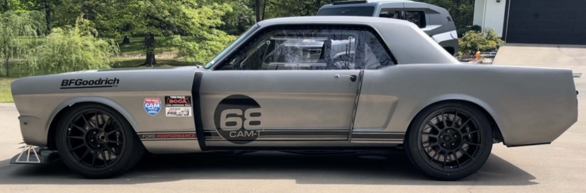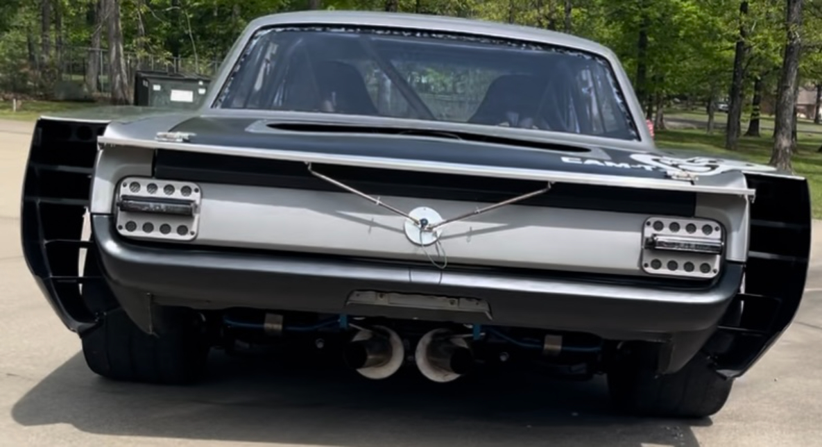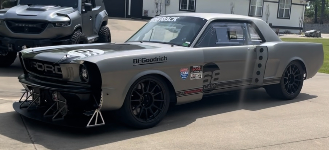 Black CCW wheels measure 18×12″ front and rear, and they are mounted with 315/30 Yokohama Advan A052 tires. The chassis has been modified with front and rear subframes from a 2020 Mustang GT350, and the front suspension includes custom-fabricated A-arms and hardware as well as adjustable Penske coilovers. The braking system incorporates GT350-sourced Brembo Calipers, two-piece Racing Brake rotors, and an electric brake booster from a Tesla.
