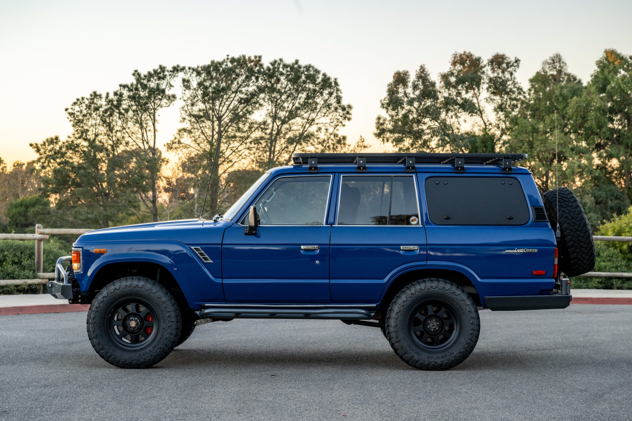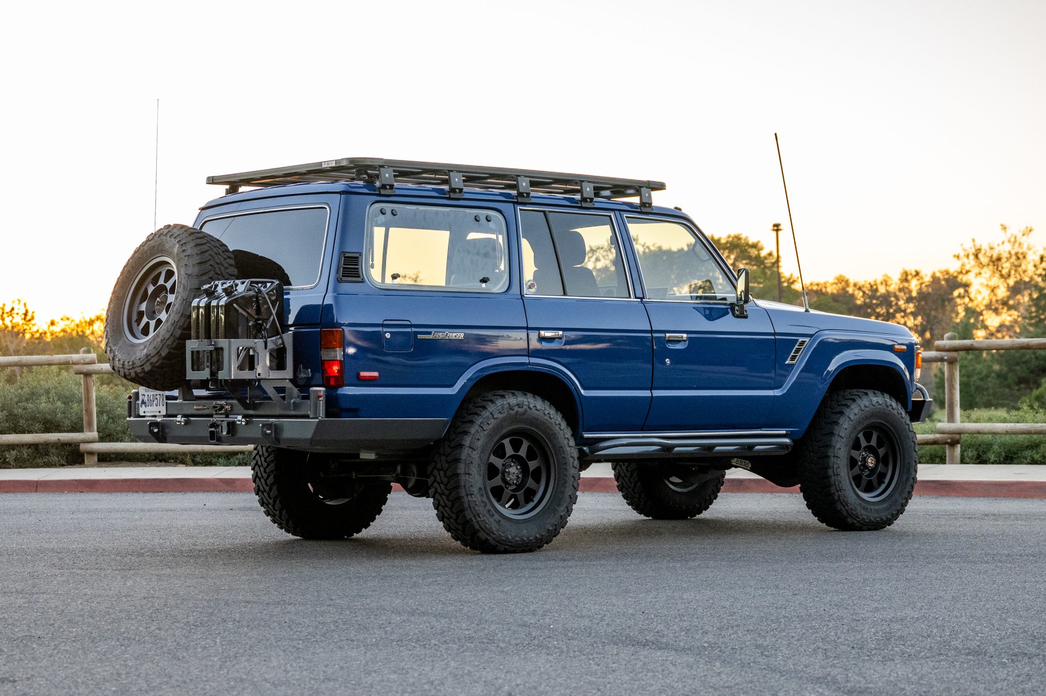 Black-finished 17″ Method Race wheels are mounted with 285/75 Toyo Open Country M/T tires. The seller reports suspension components specified for an 80-Series Land Cruiser have been added, which include an Old Man Emu steering stabilizer and front shocks as well as Delta VS front radius arms. The installed Powerbrake Big Brake Kit features four-wheel discs with red-finished calipers and slotted rotors up front.