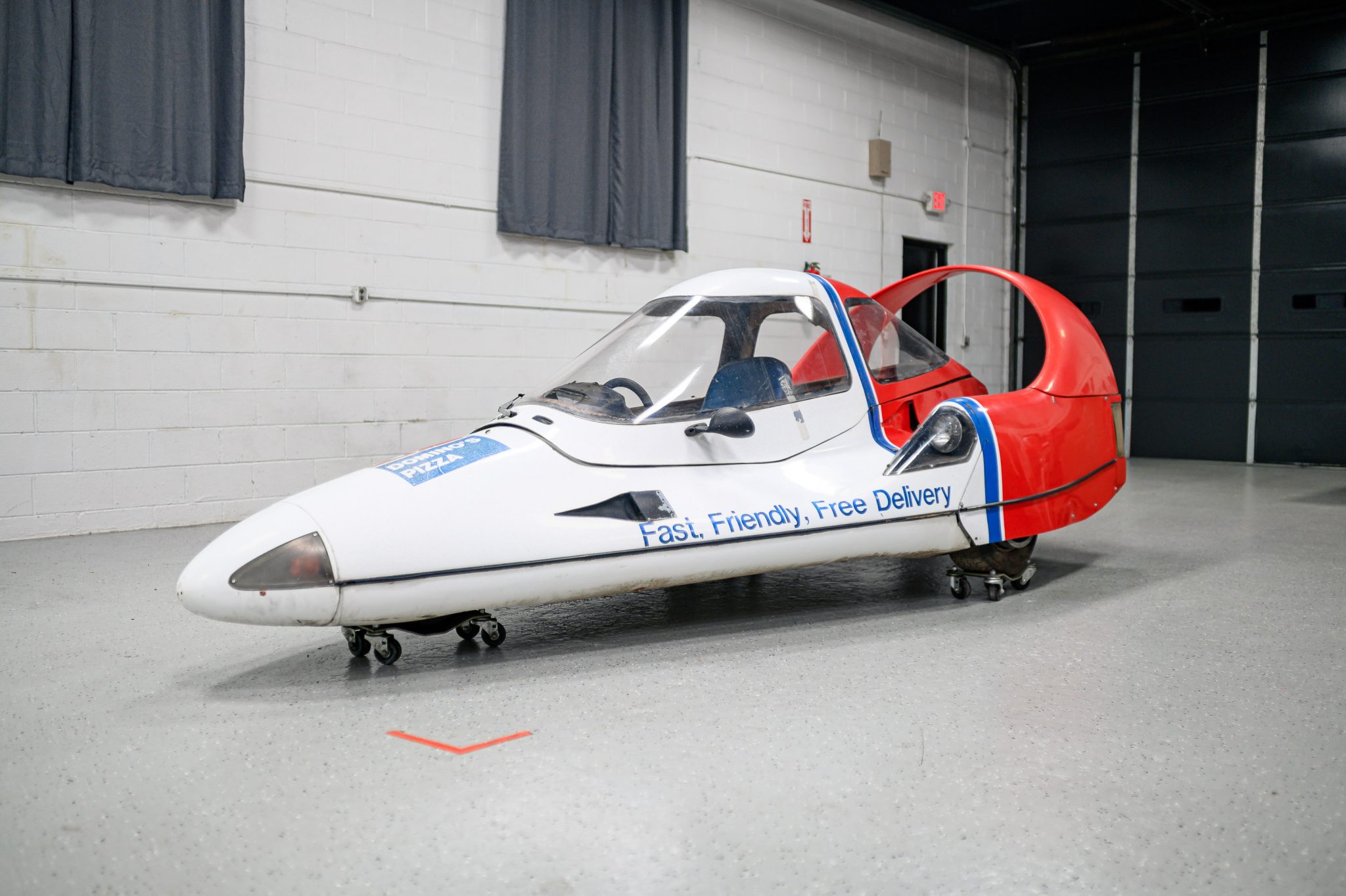 The fiberglass monocoque on this example is finished in white with a red and blue Domino’s Pizza livery. Styling incorporates nose-mounted turn signals, NACA ducts, covered headlights and taillights, a sliding canopy top, an “Amick Arch” rear spoiler, and a central brake light. The right side-view mirror is not fitted but is included in the sale. Chips and other imperfections in the finish can be seen in the gallery.