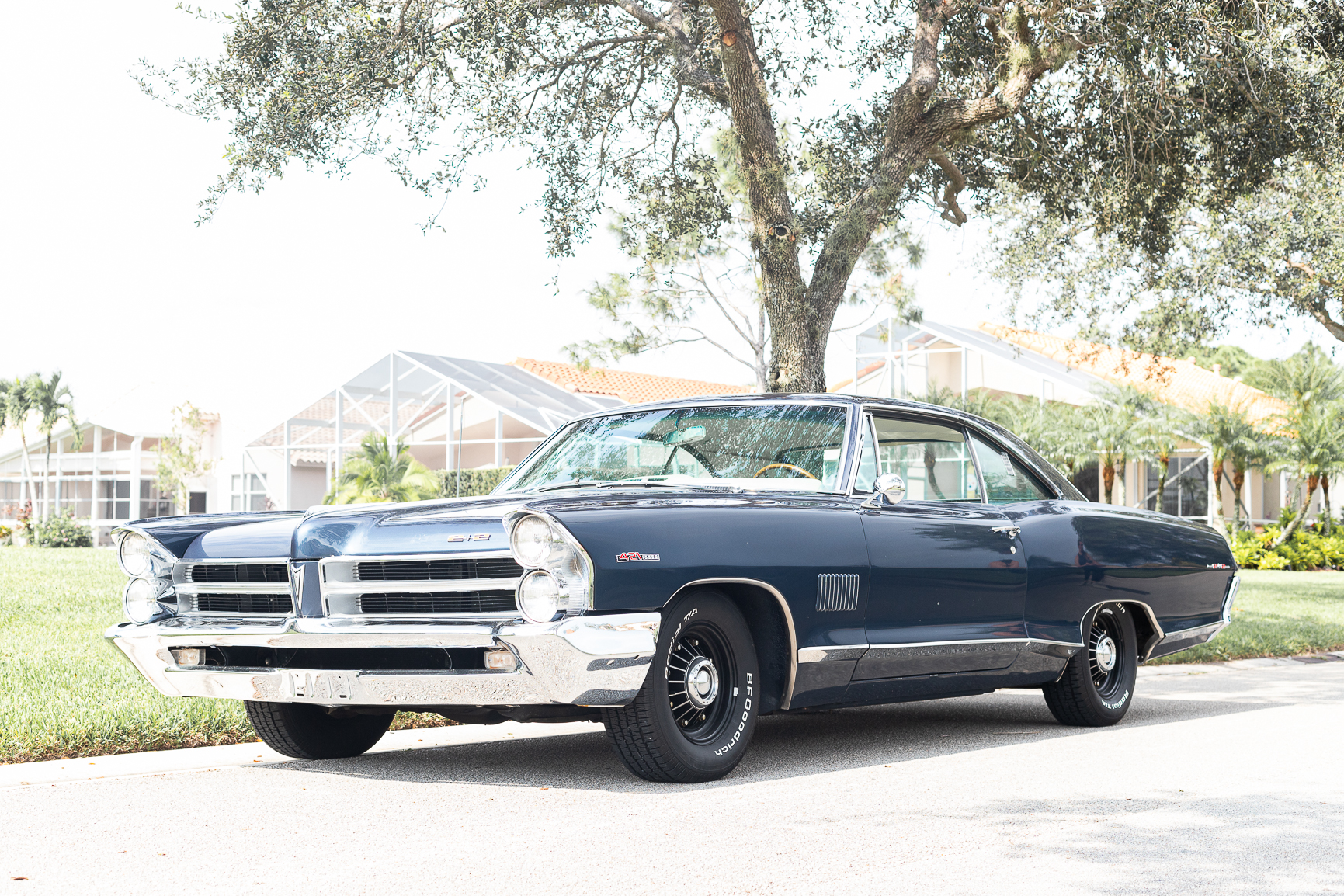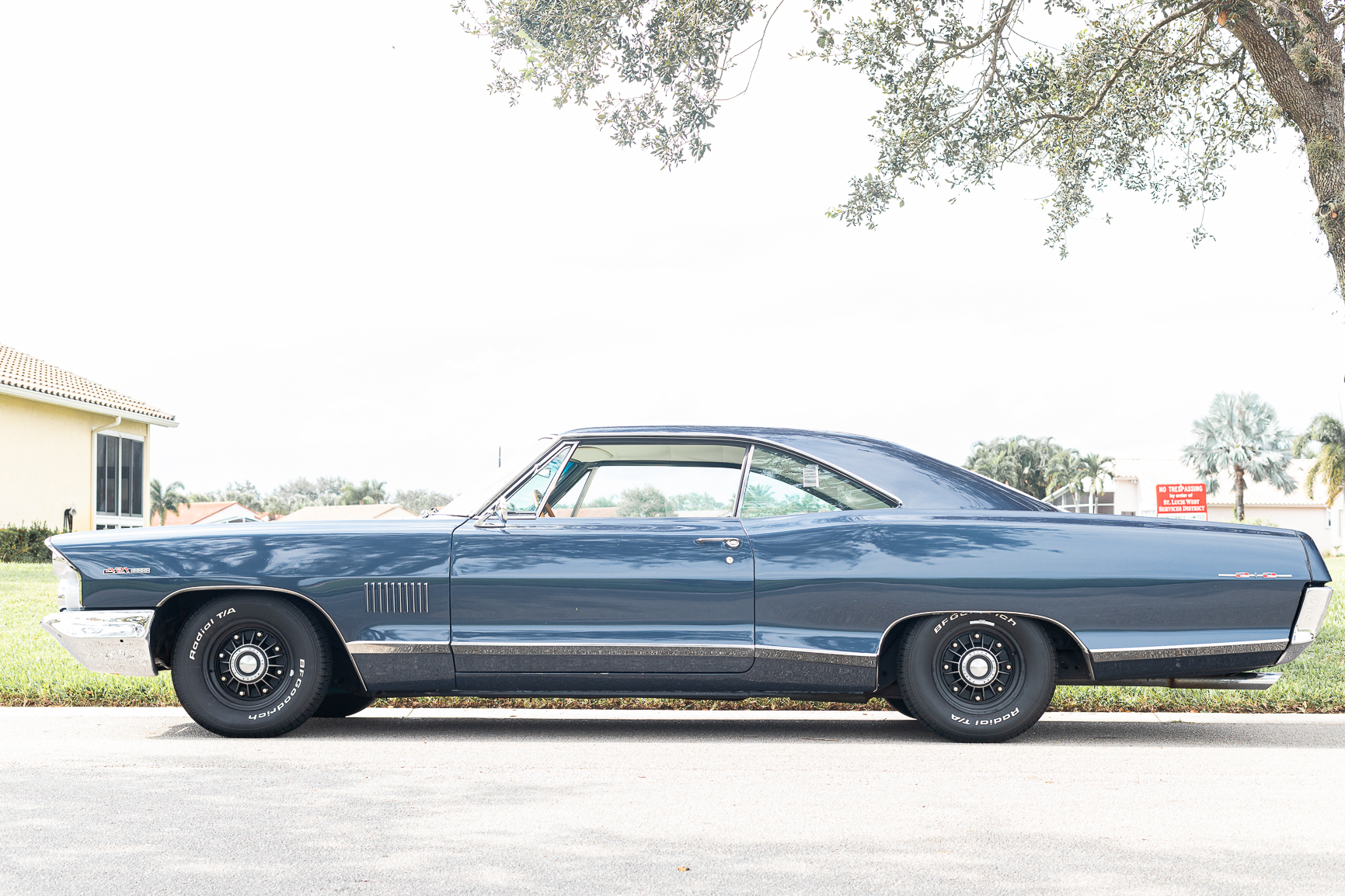 Black 14″ eight-lug wheels wear Pontiac Motor Division center caps and are mounted with 225/70 BFGoodrich Radial T/A white-letter tires. A full-size spare is located in the trunk. There are areas of peeling finish on the right-side wheels. The car is equipped with power steering, and braking is handled by power-assisted finned drums at each corner.